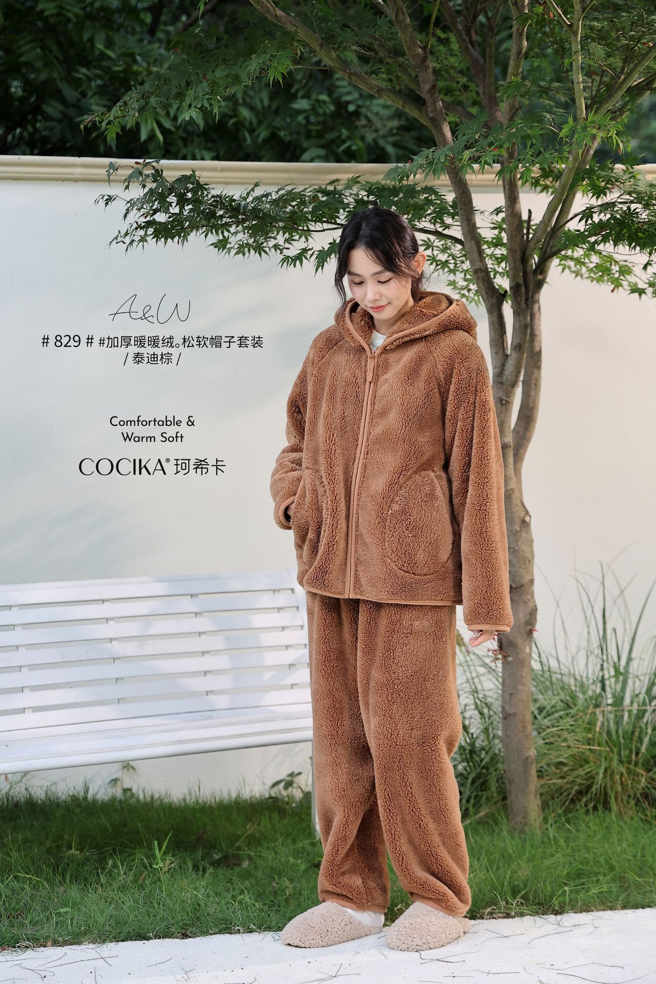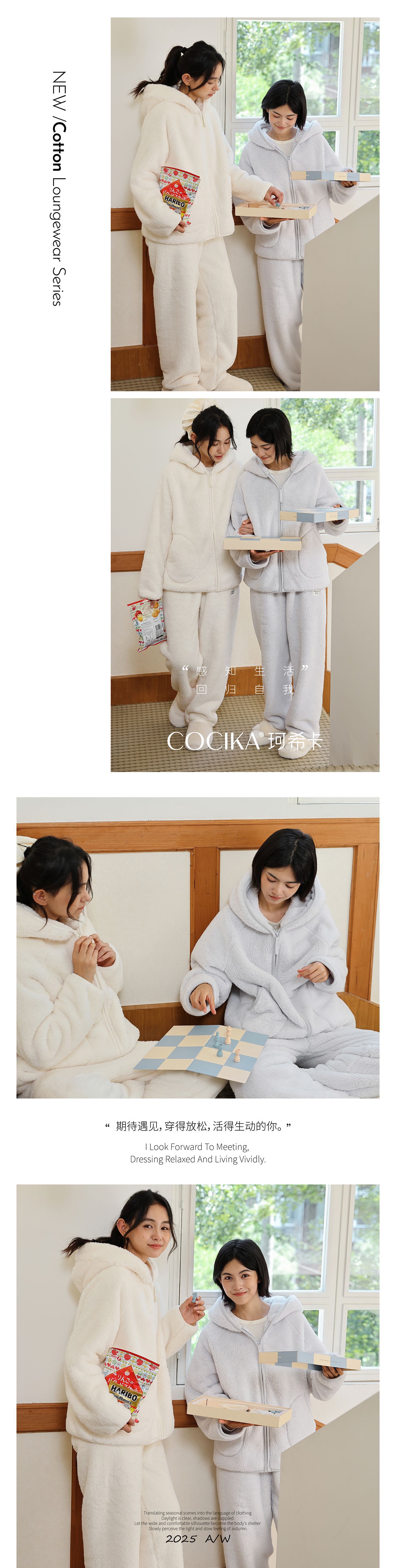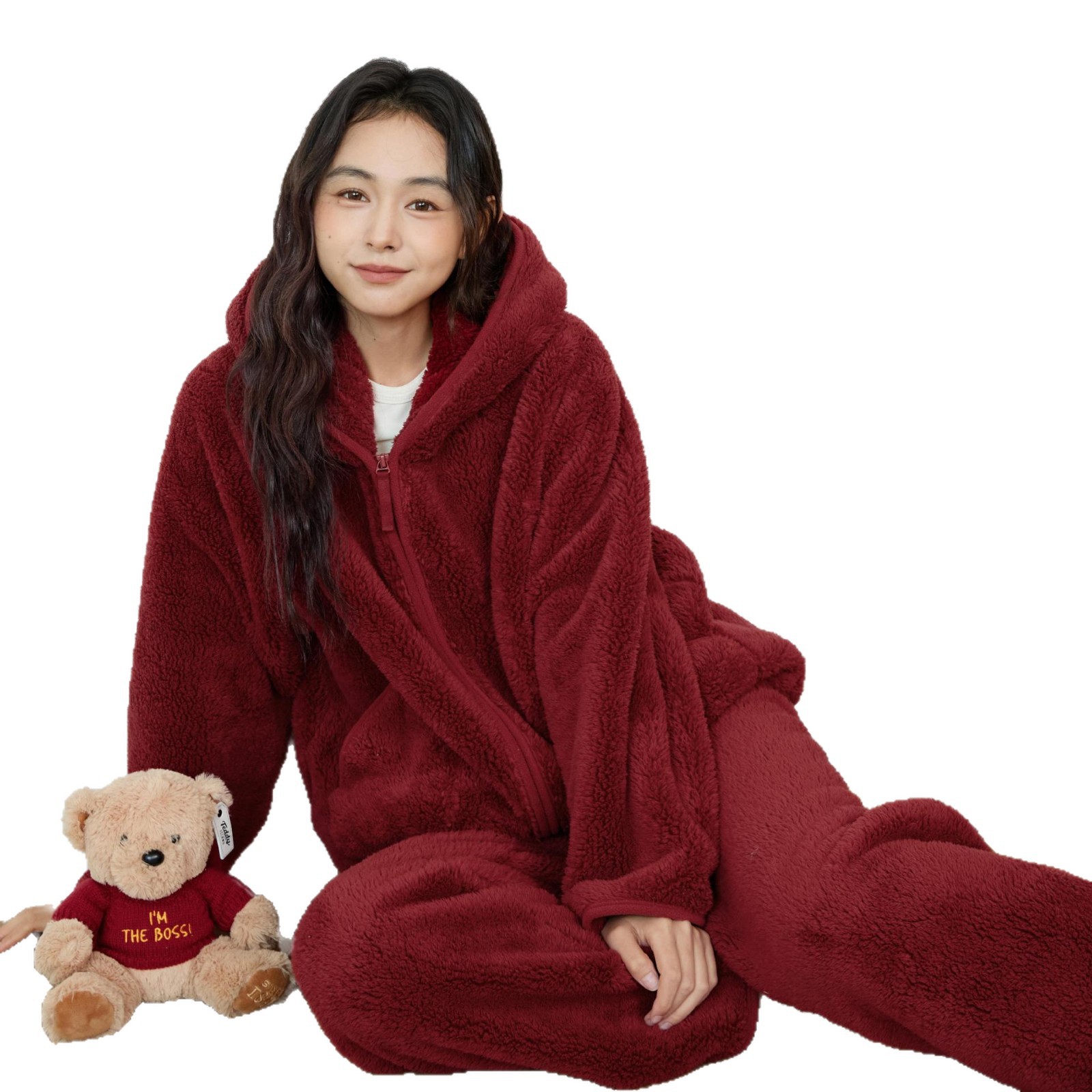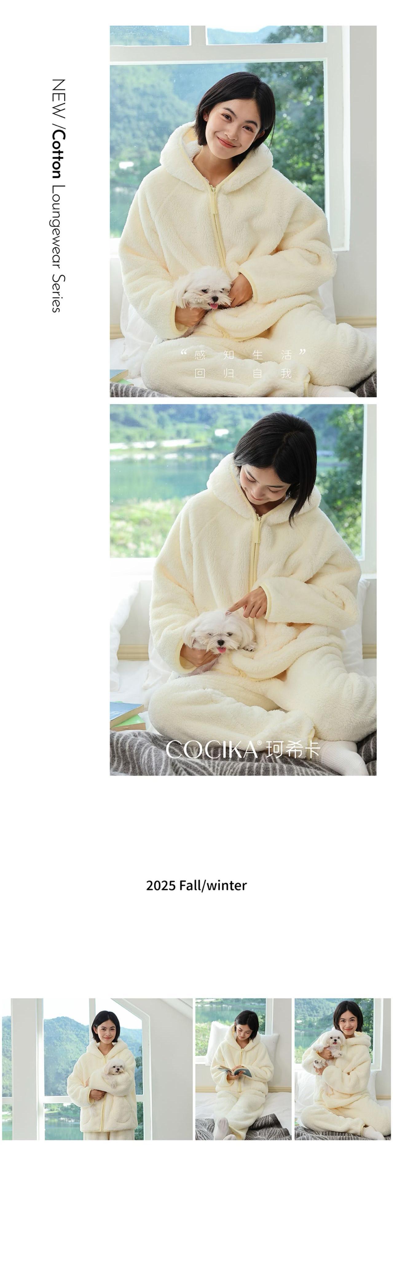 厚实连帽暖暖绒睡衣套装冬季保暖加绒加厚家居服口袋拉链可外穿女