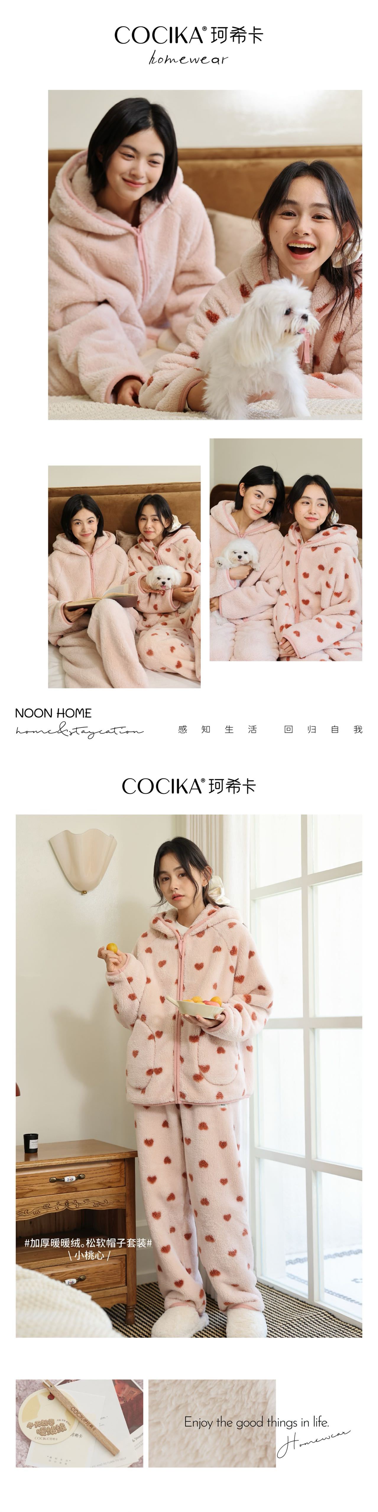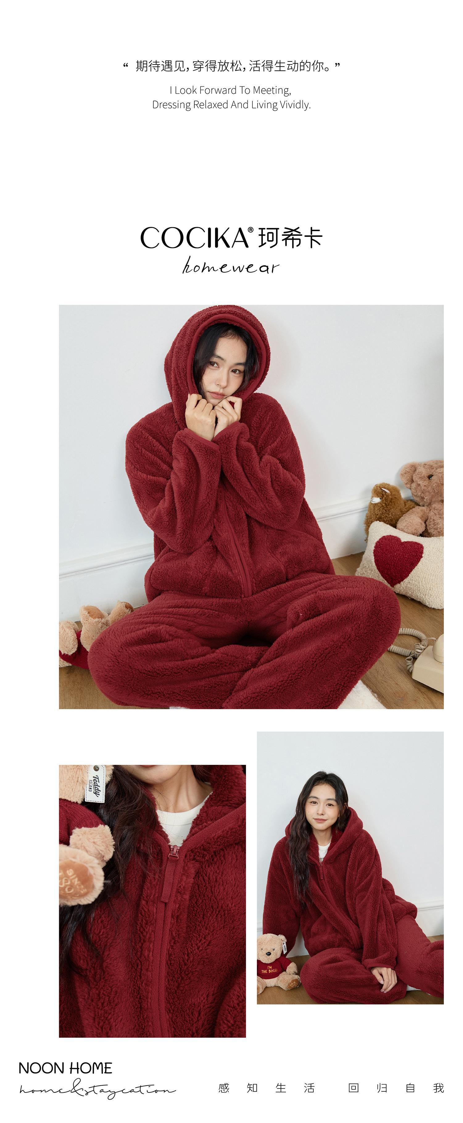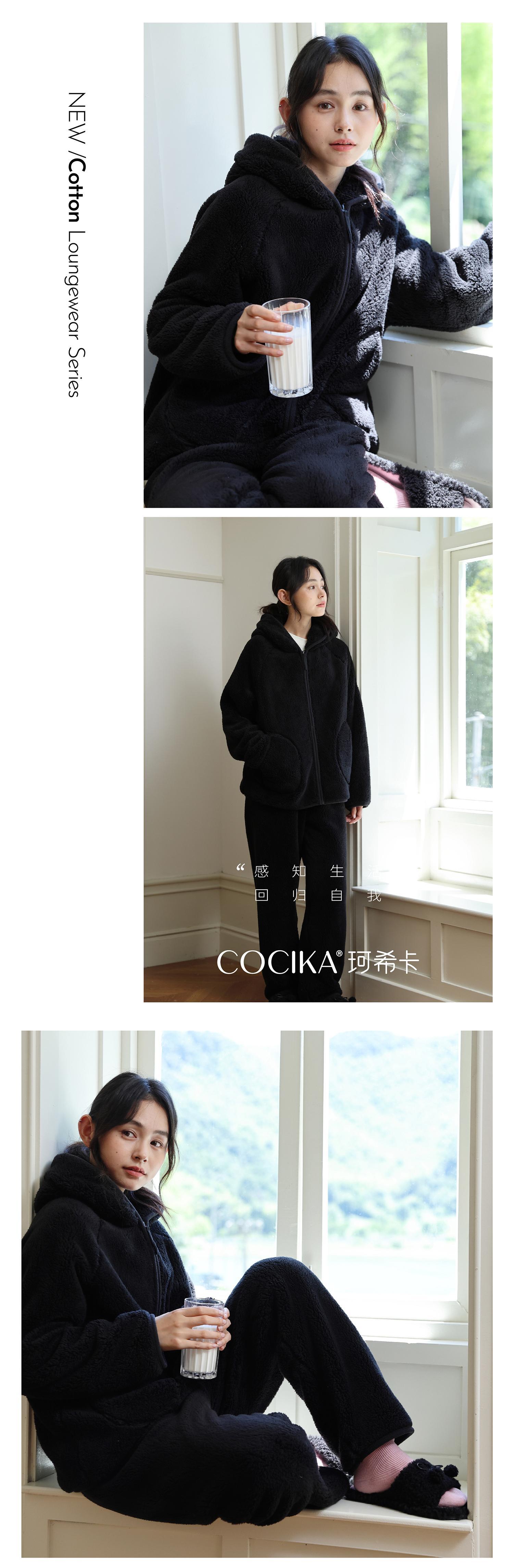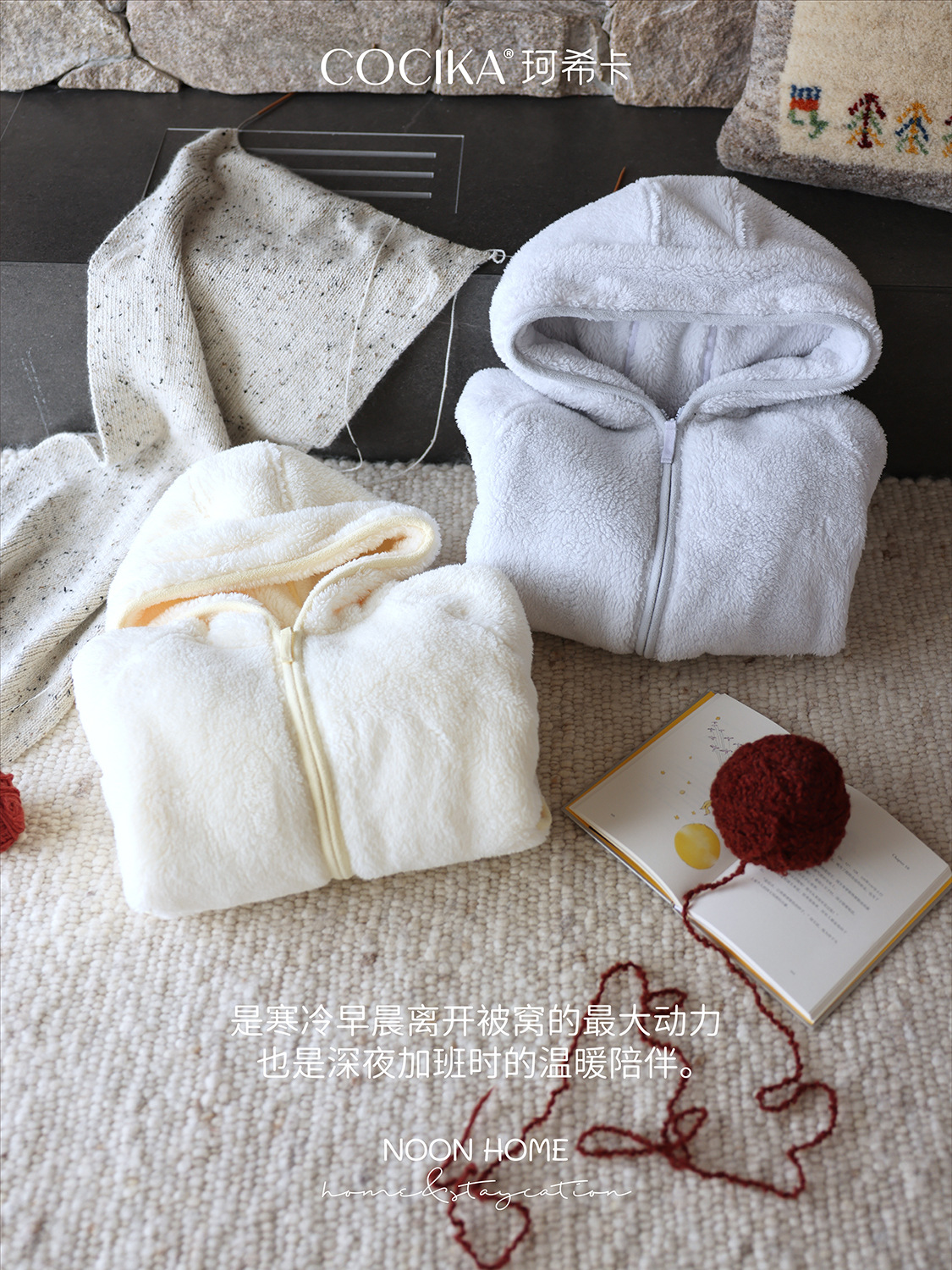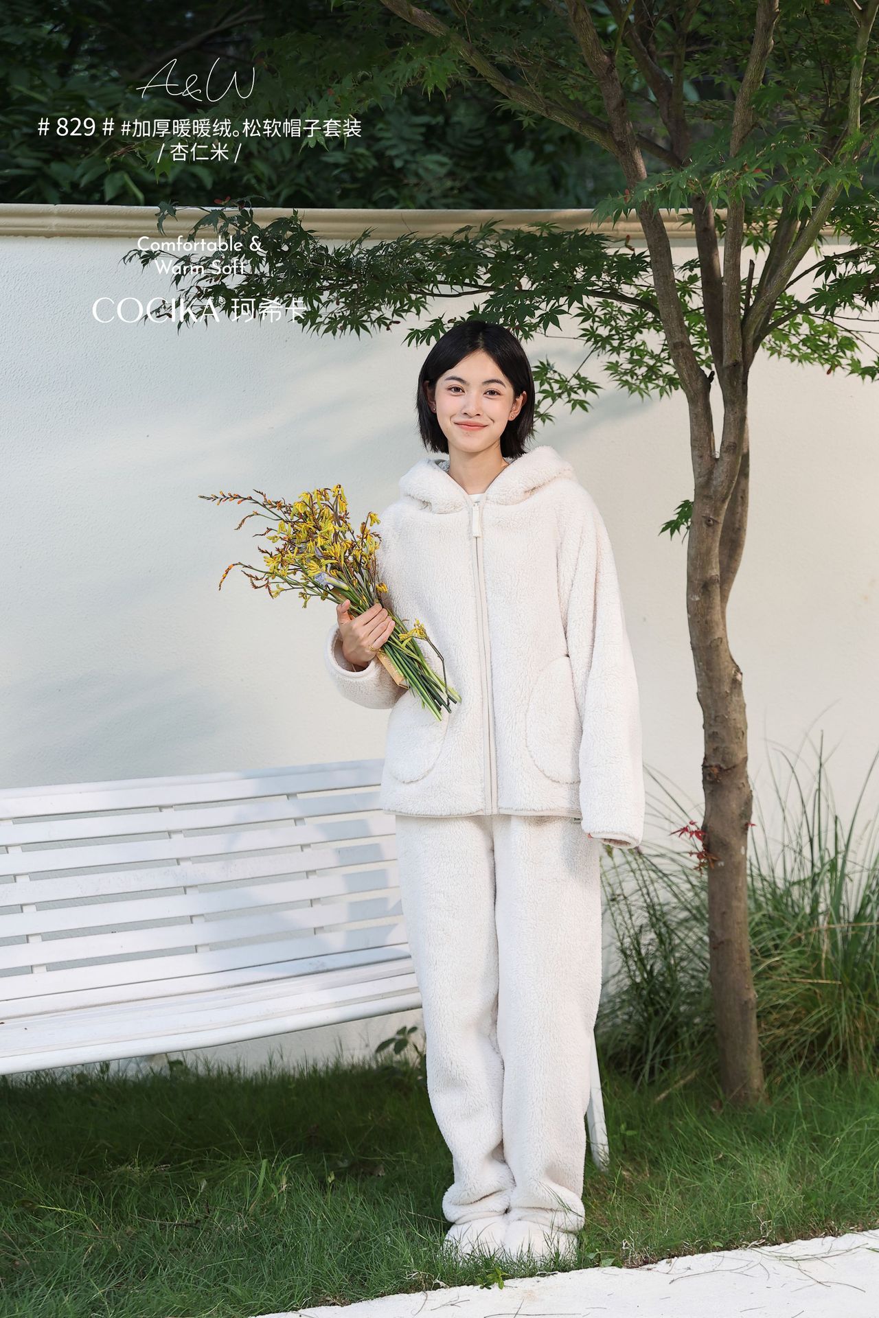 厚实连帽暖暖绒睡衣套装冬季保暖加绒加厚家居服口袋拉链可外穿女