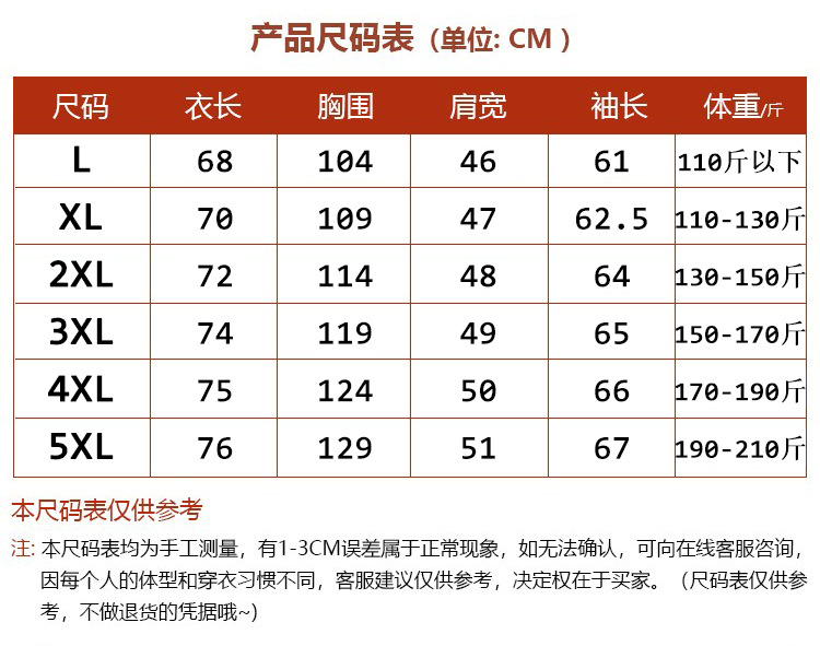 | 5xl recommended 95.00 kg-105.00 kg(5XL建议190-210斤) | USD $0.0 | 517 piece available |