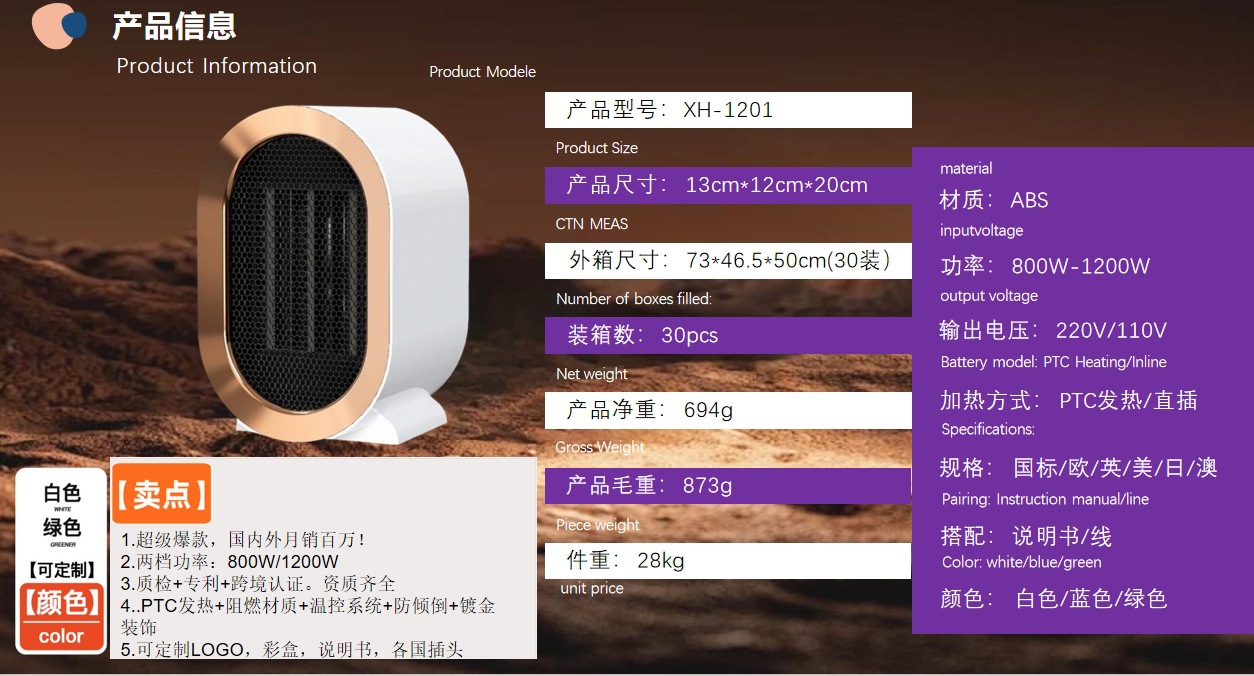 美斯特暖风机大功率1200W桌面小型取暖器陶瓷PTC发热家用电暖器