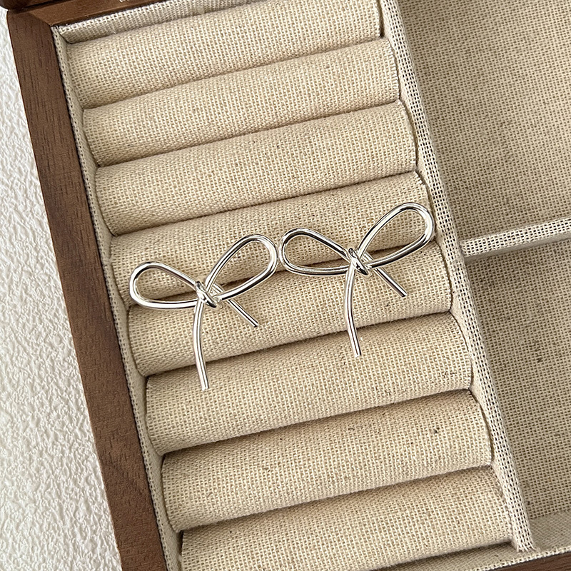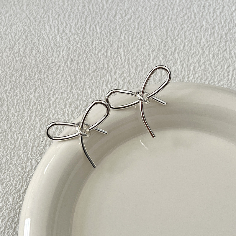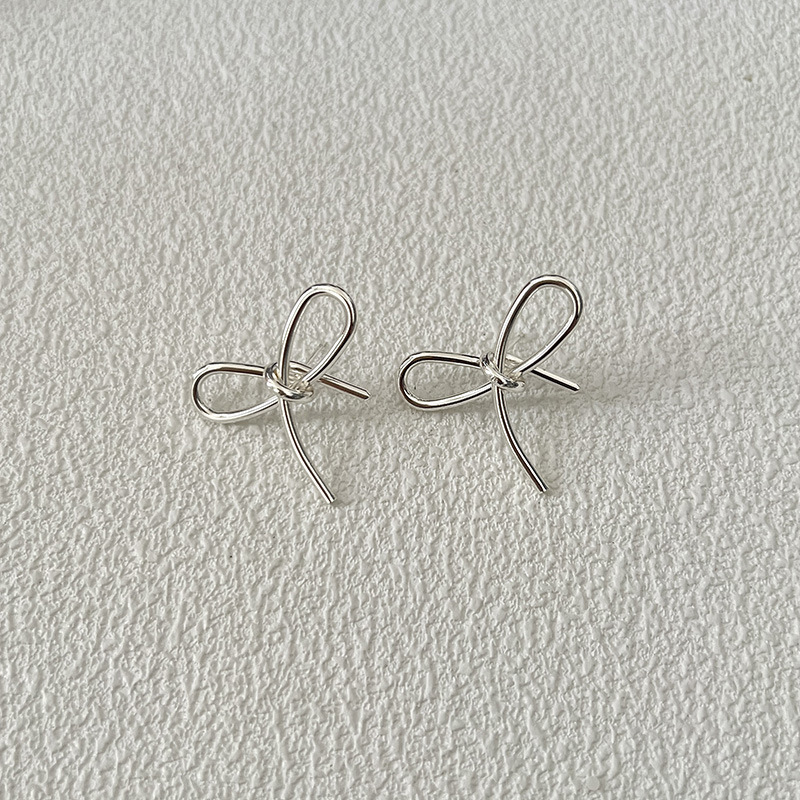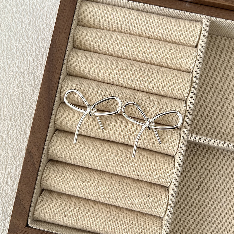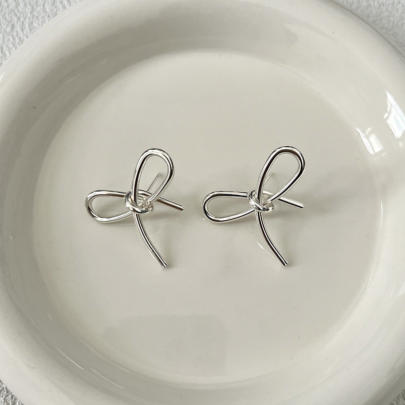 简约甜美蝴蝶结式耳钉乖巧可爱百搭精致轻奢丝带感独特银色耳饰品