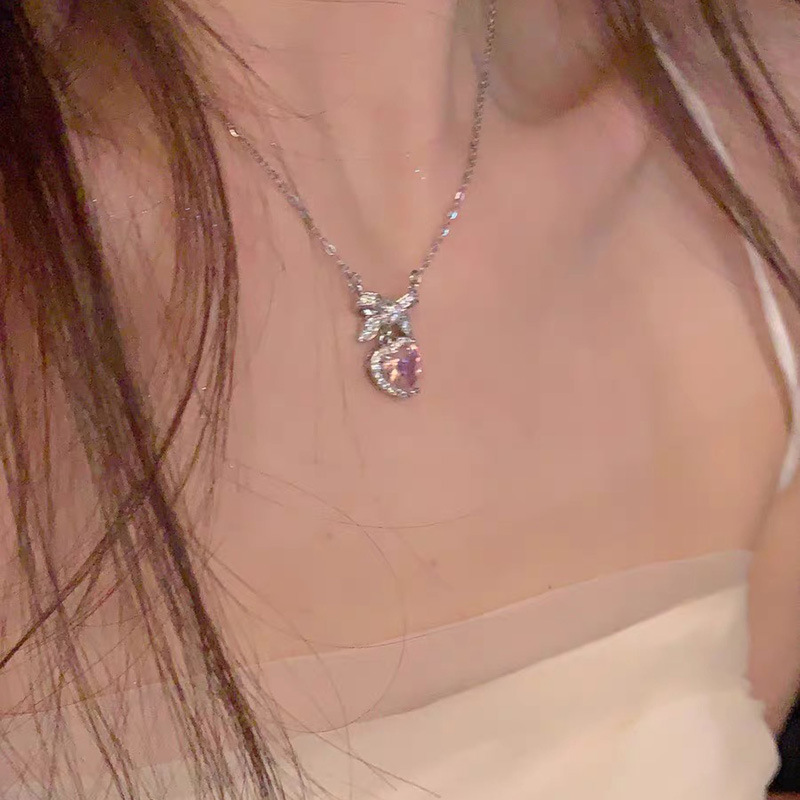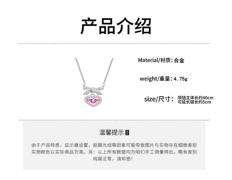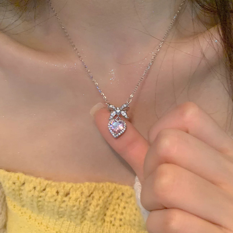 敲百搭~粉色爱心锆石蝴蝶结项链女甜酷辣妹气质锁骨链装饰潮