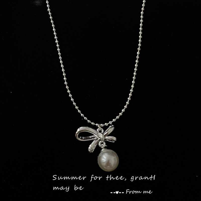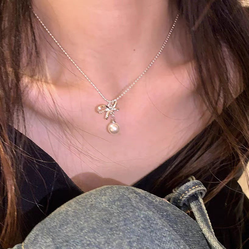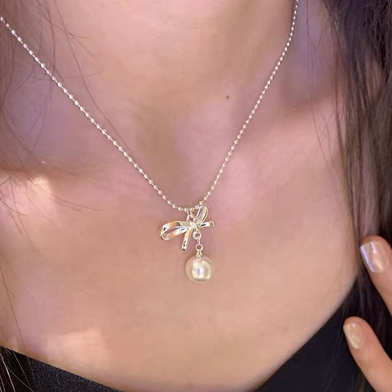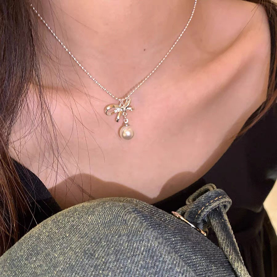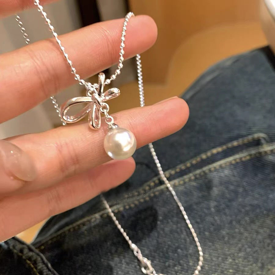925纯银法式蝴蝶结珍珠项链轻奢甜美锁骨链小众高级感优雅毛衣链