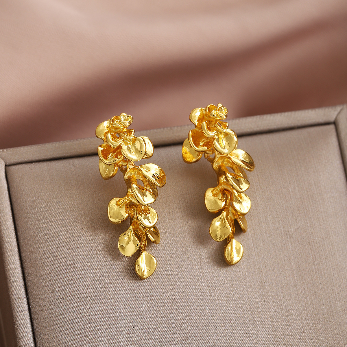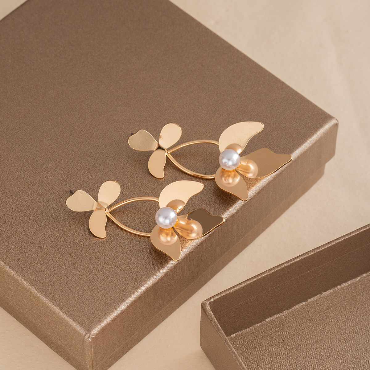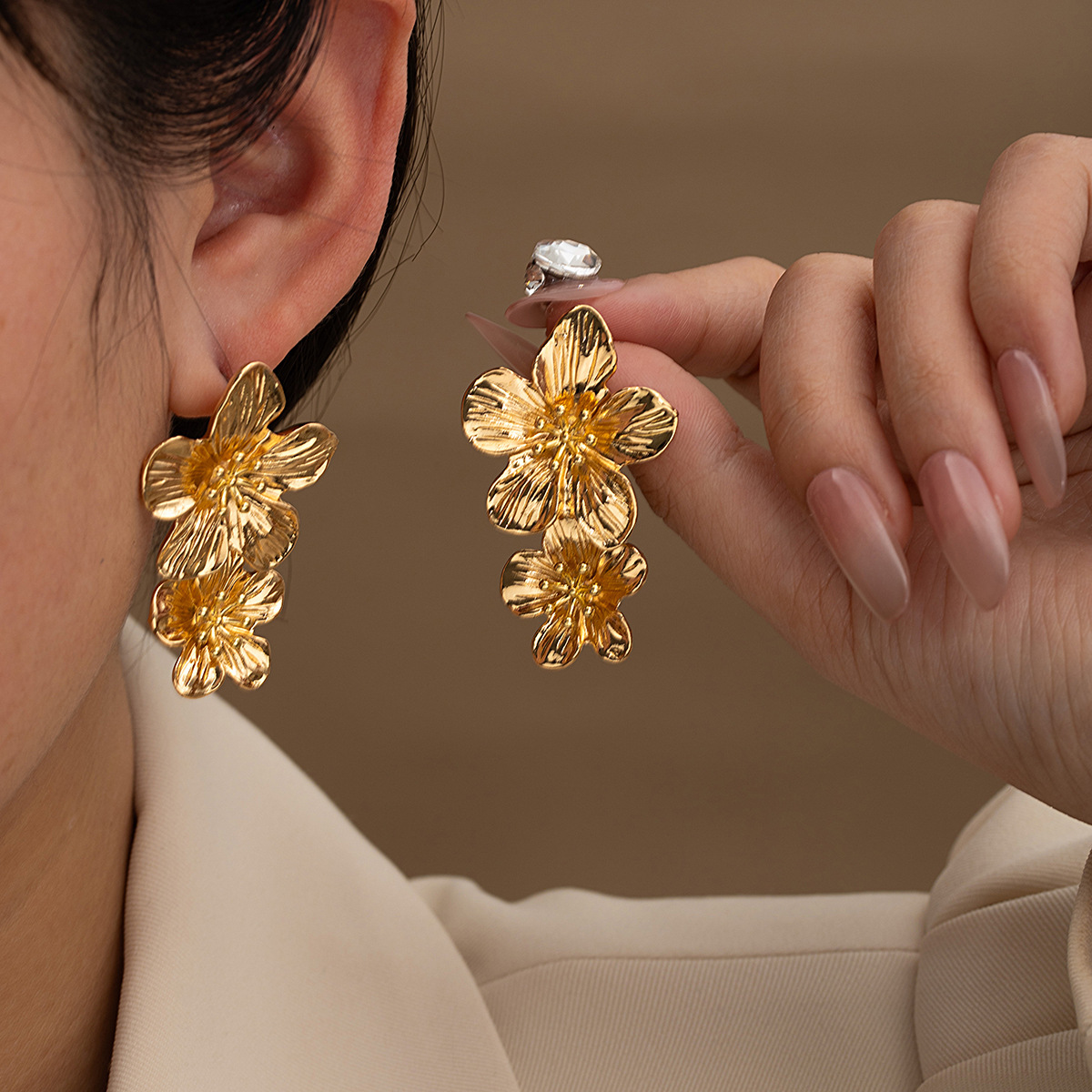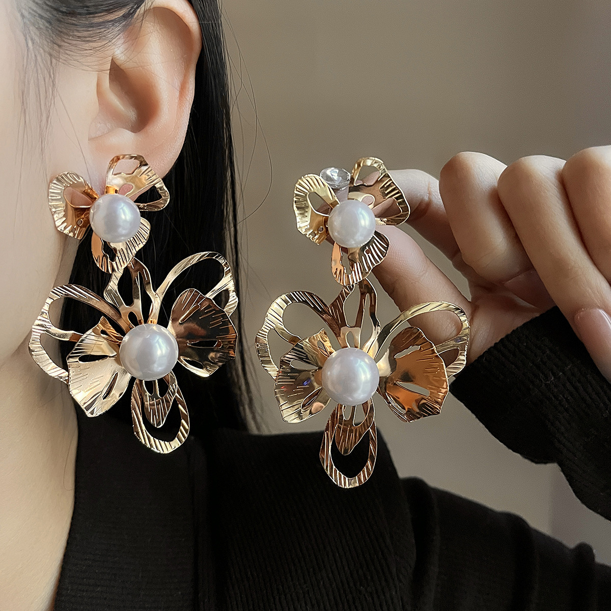 欧美夸张立体花朵珍珠耳环跨境轻奢重工金属风高级感个性电镀耳钉
