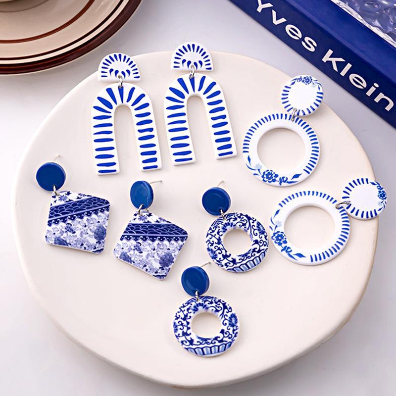 中国风青花瓷碎片耳环 新中式复古亚克力蓝色耳坠典雅几何耳饰女