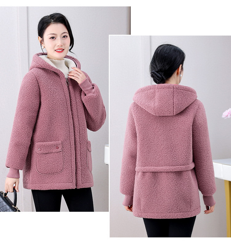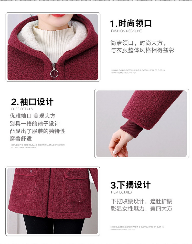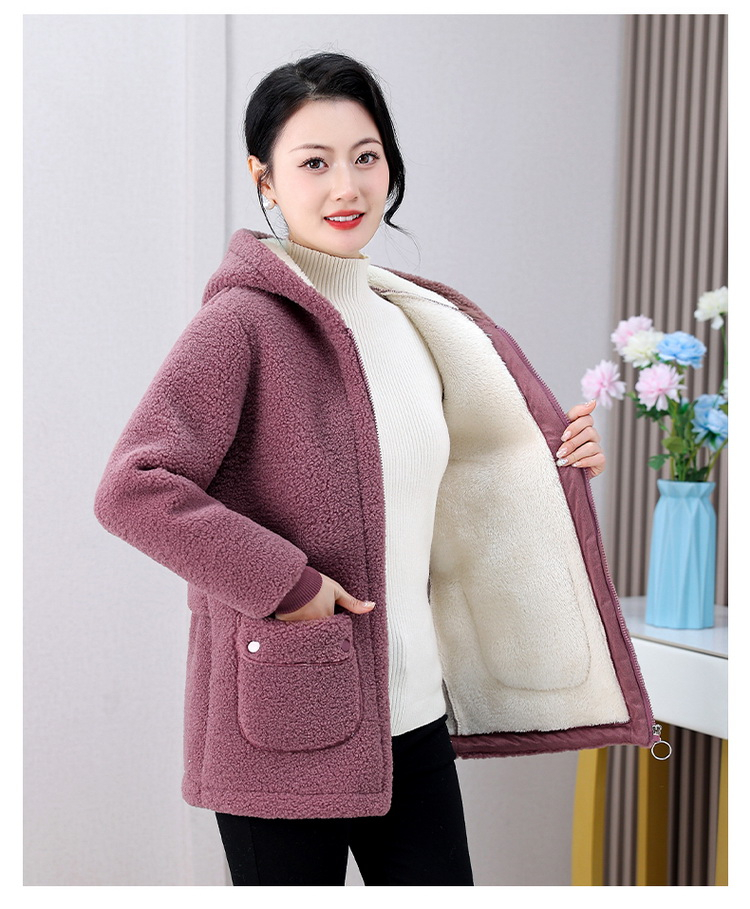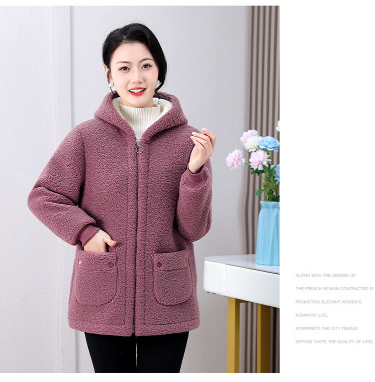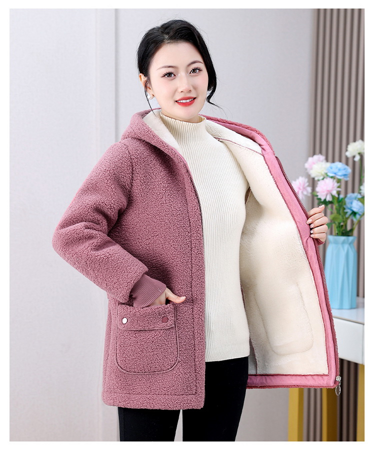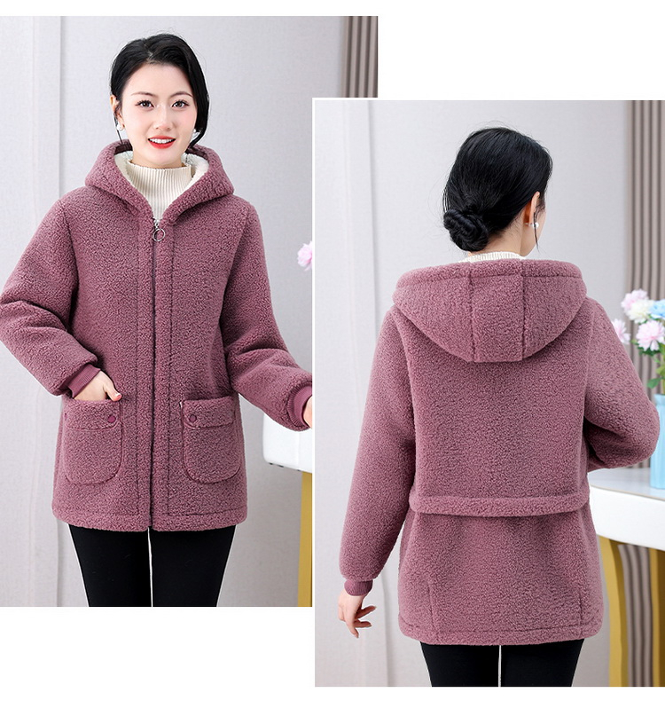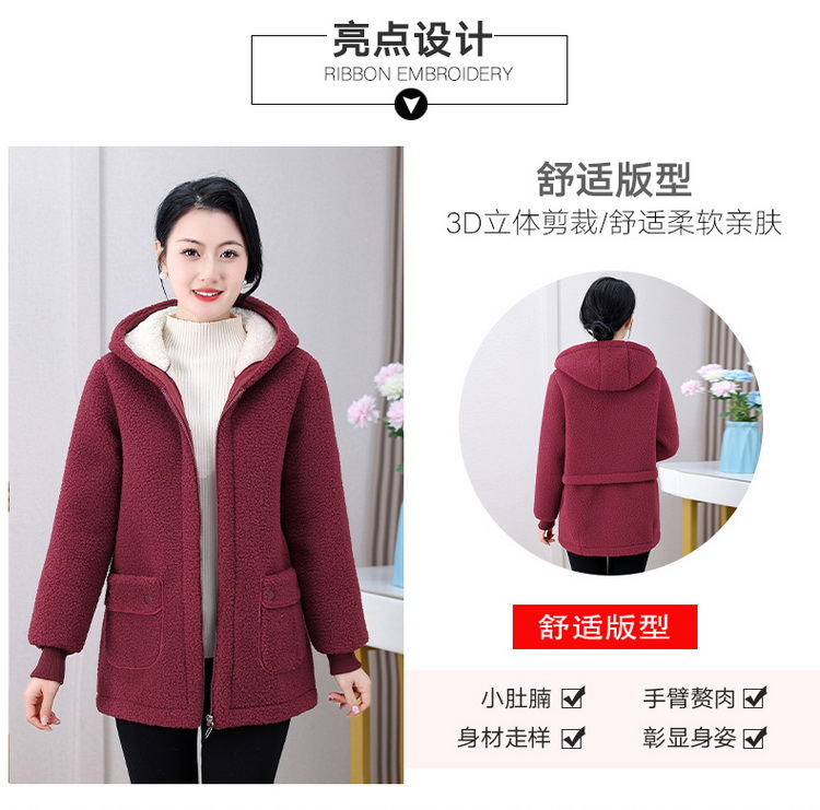 妈妈冬装纯色羊羔毛加绒加厚棉衣中老年女秋冬颗粒绒外套连帽棉袄