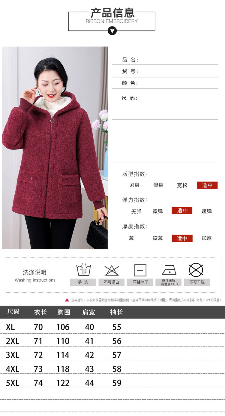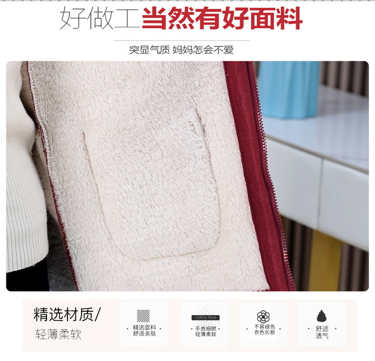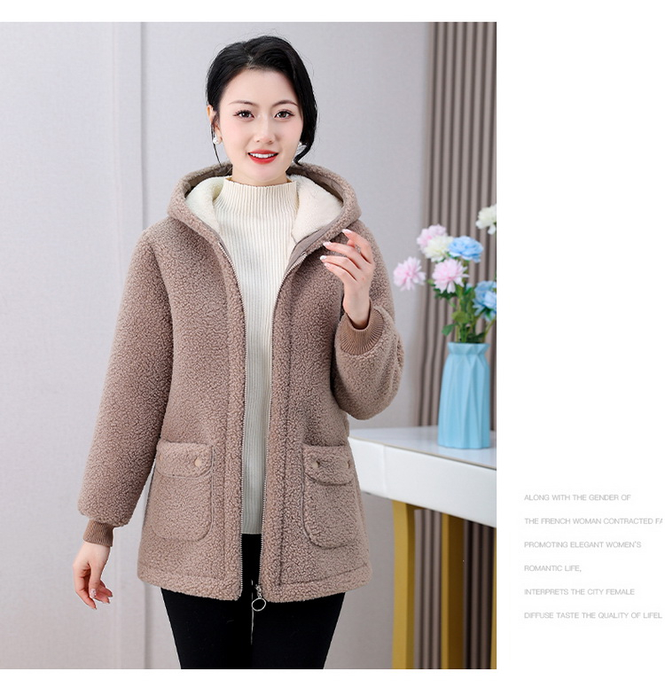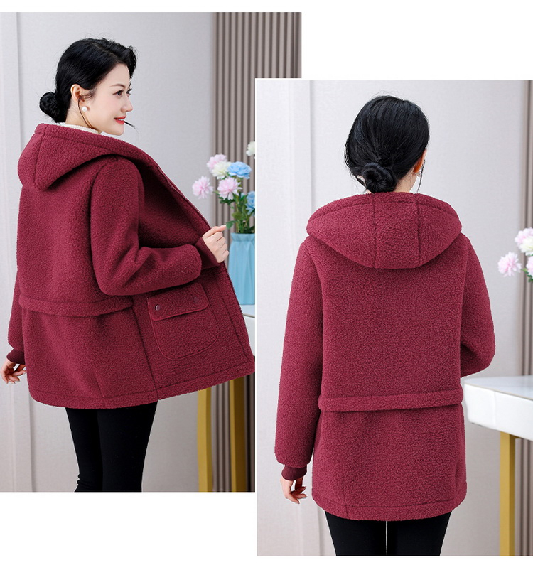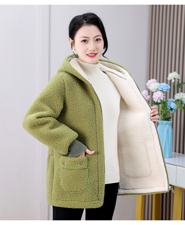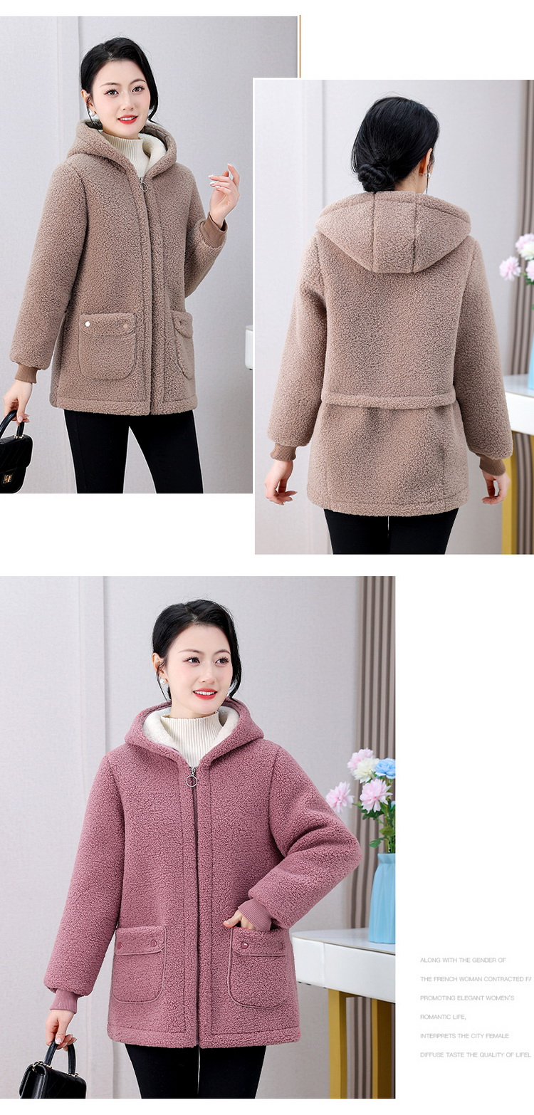 妈妈冬装纯色羊羔毛加绒加厚棉衣中老年女秋冬颗粒绒外套连帽棉袄