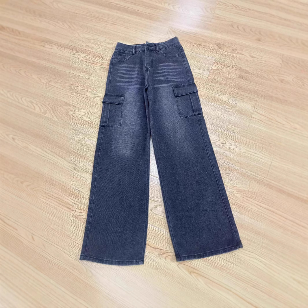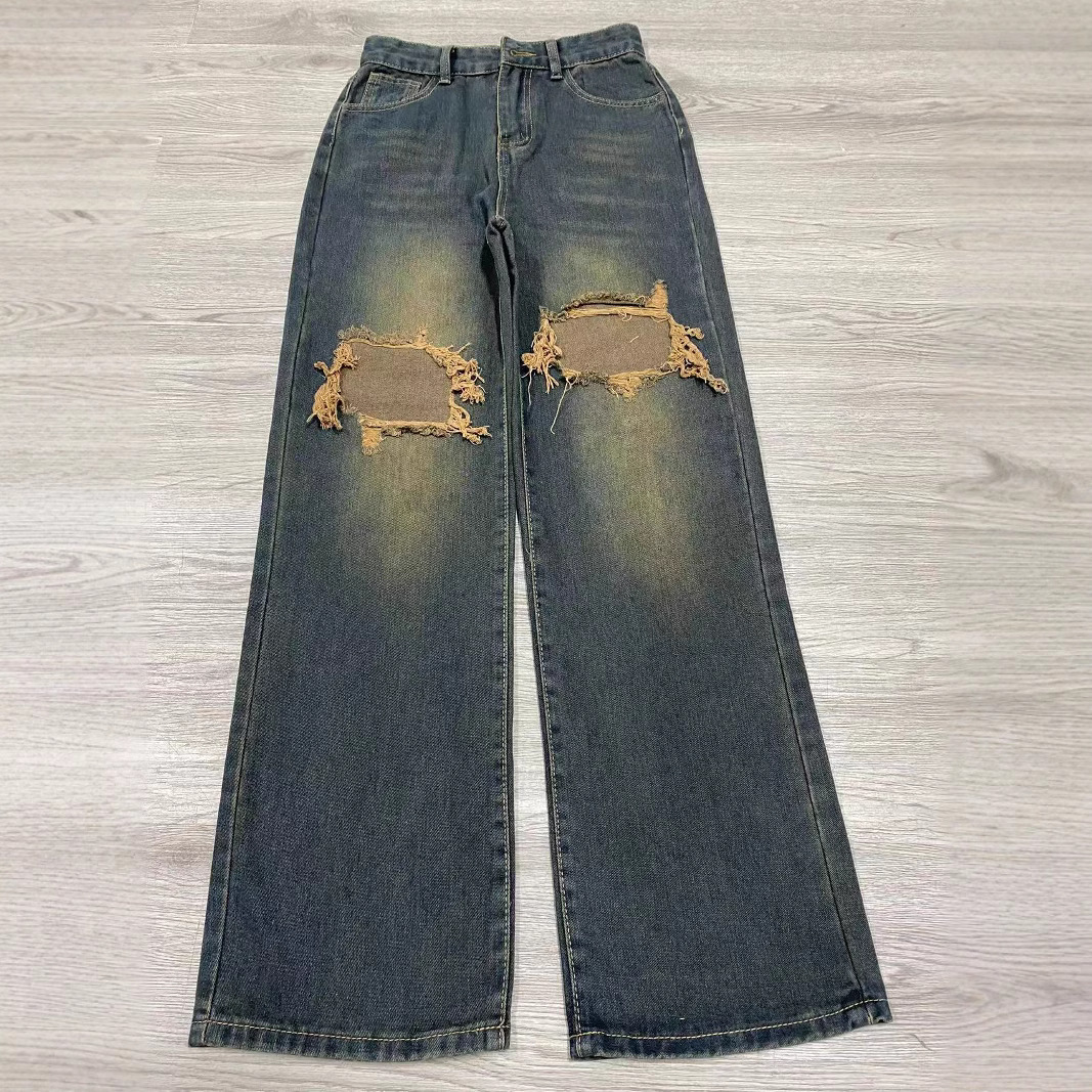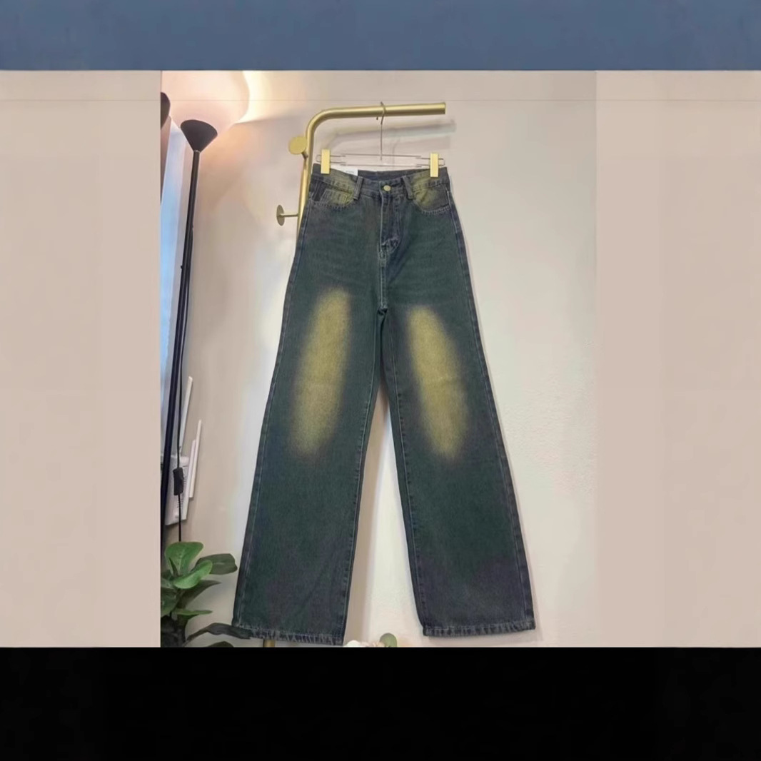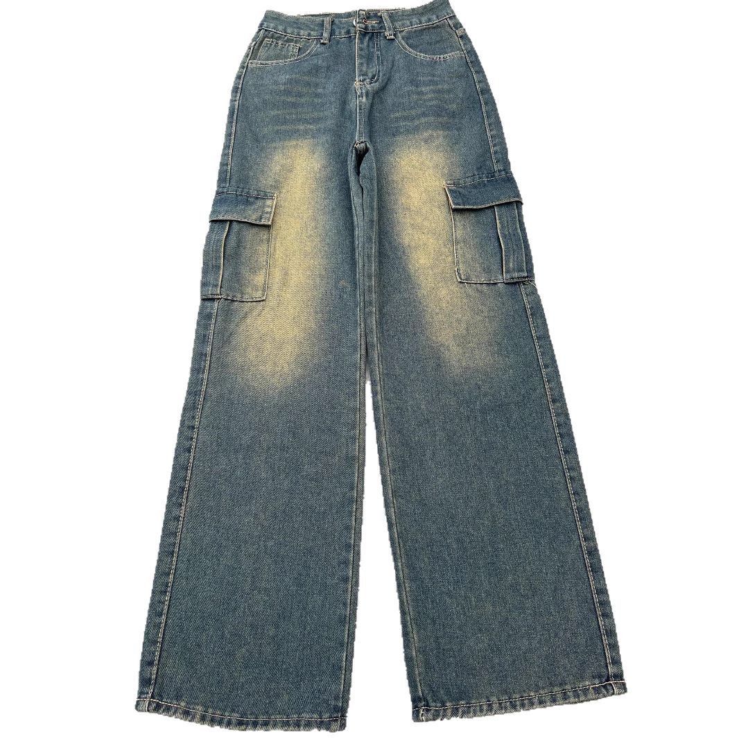 外贸美式复古水泥灰做旧牛仔裤女秋季新款高腰显瘦宽松拖地长裤潮
