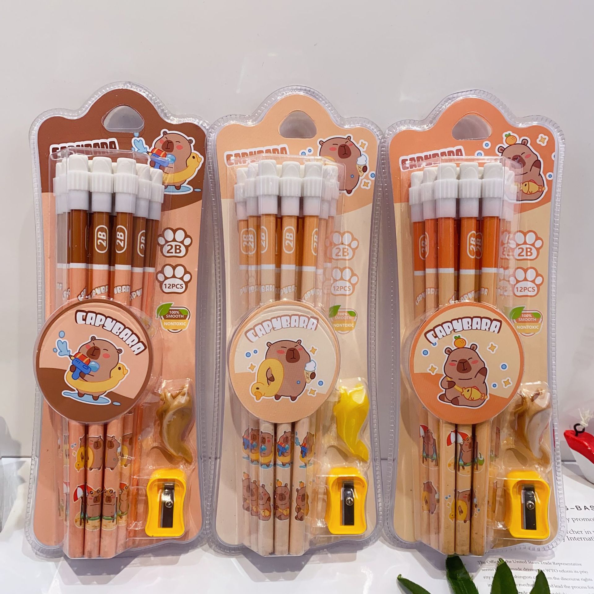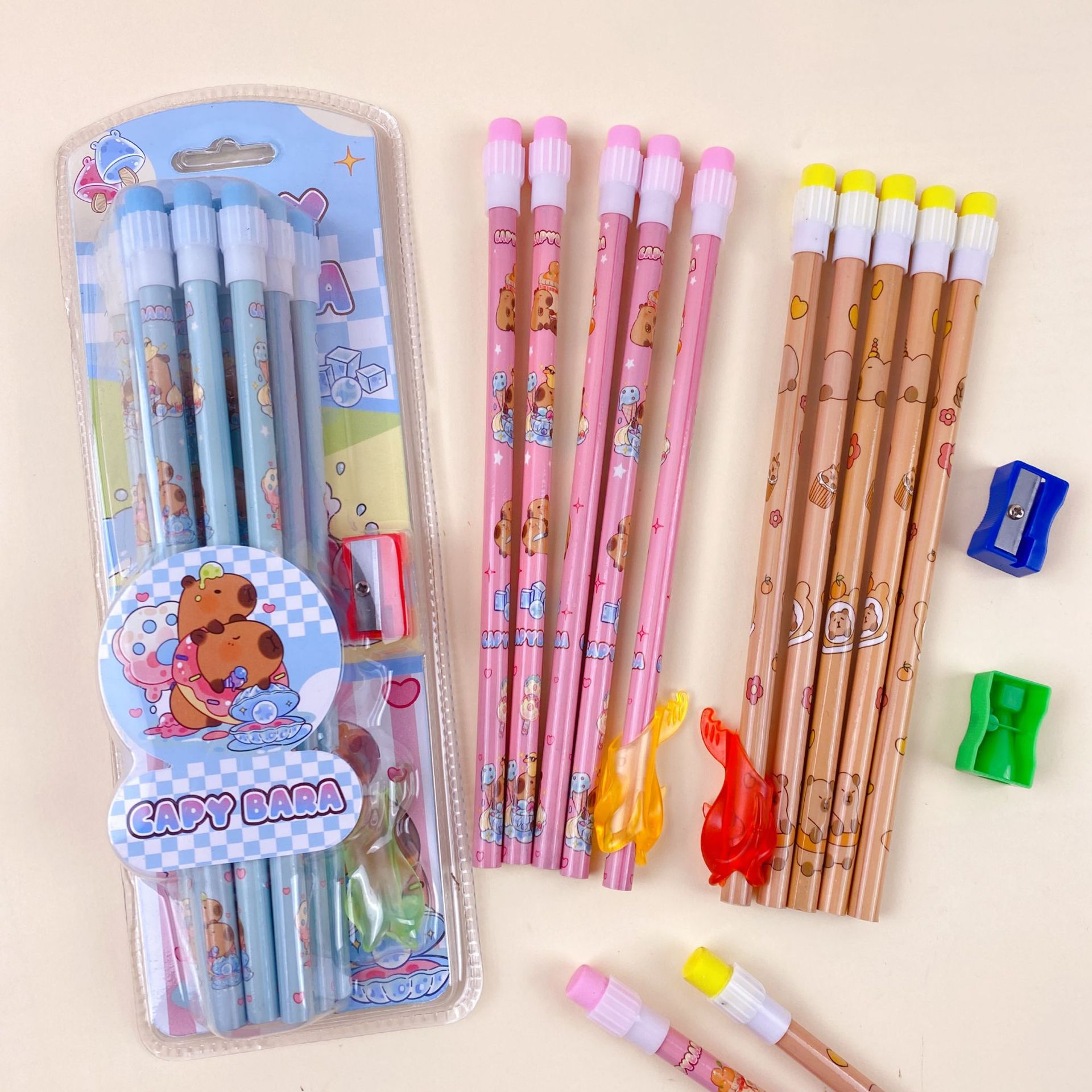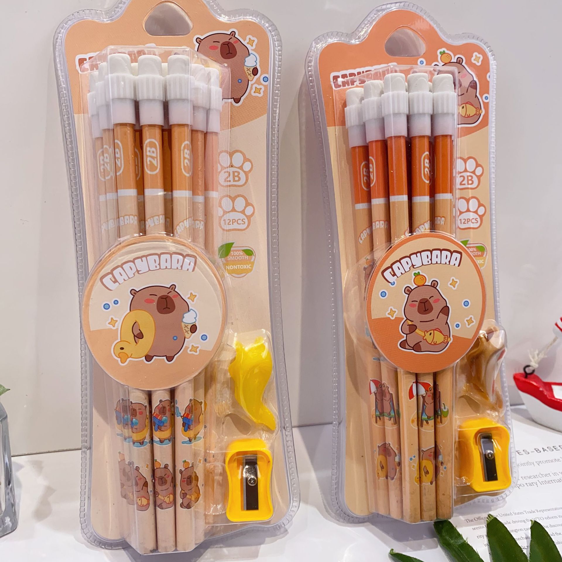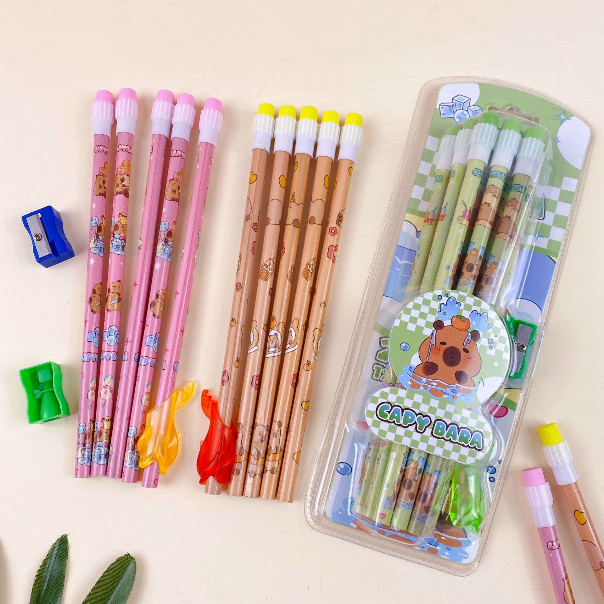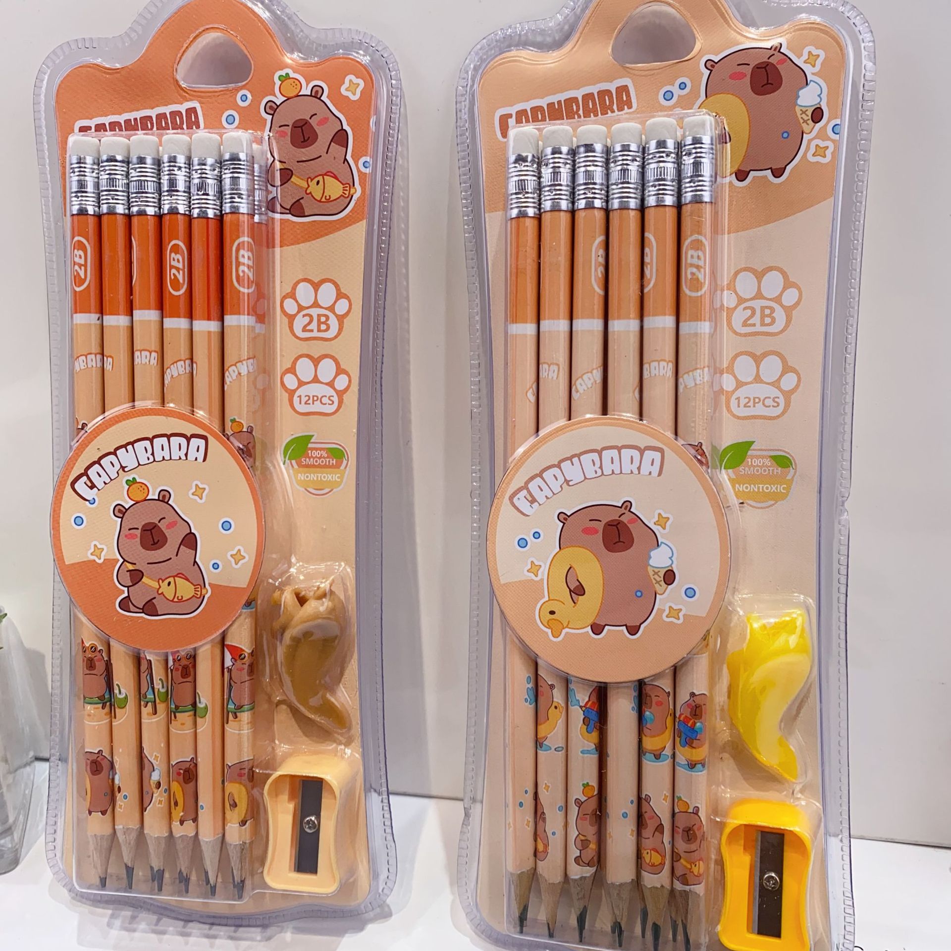 新款卡皮巴拉12支装木铅笔套装可爱卡通铅笔带橡皮擦卷笔刀握笔器
