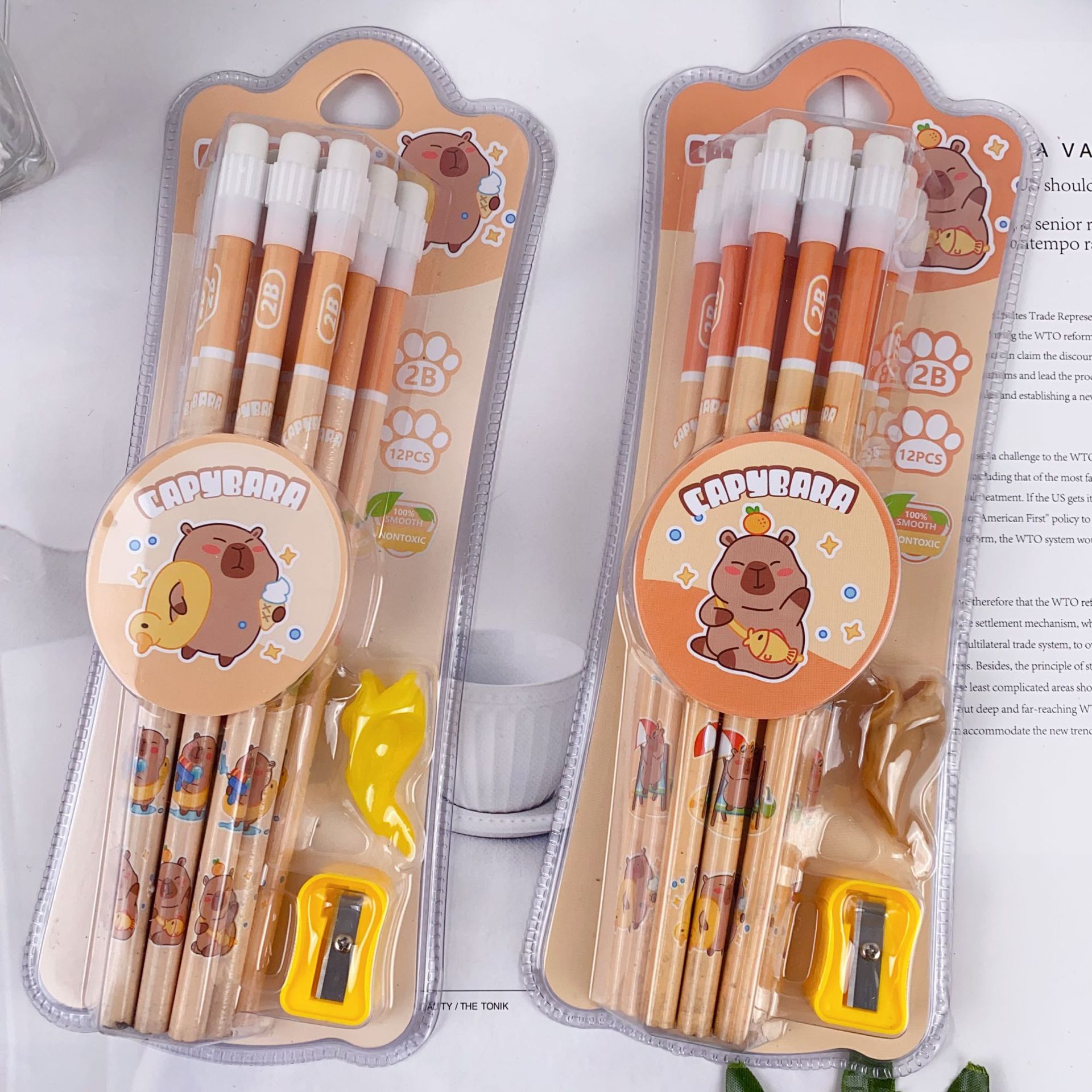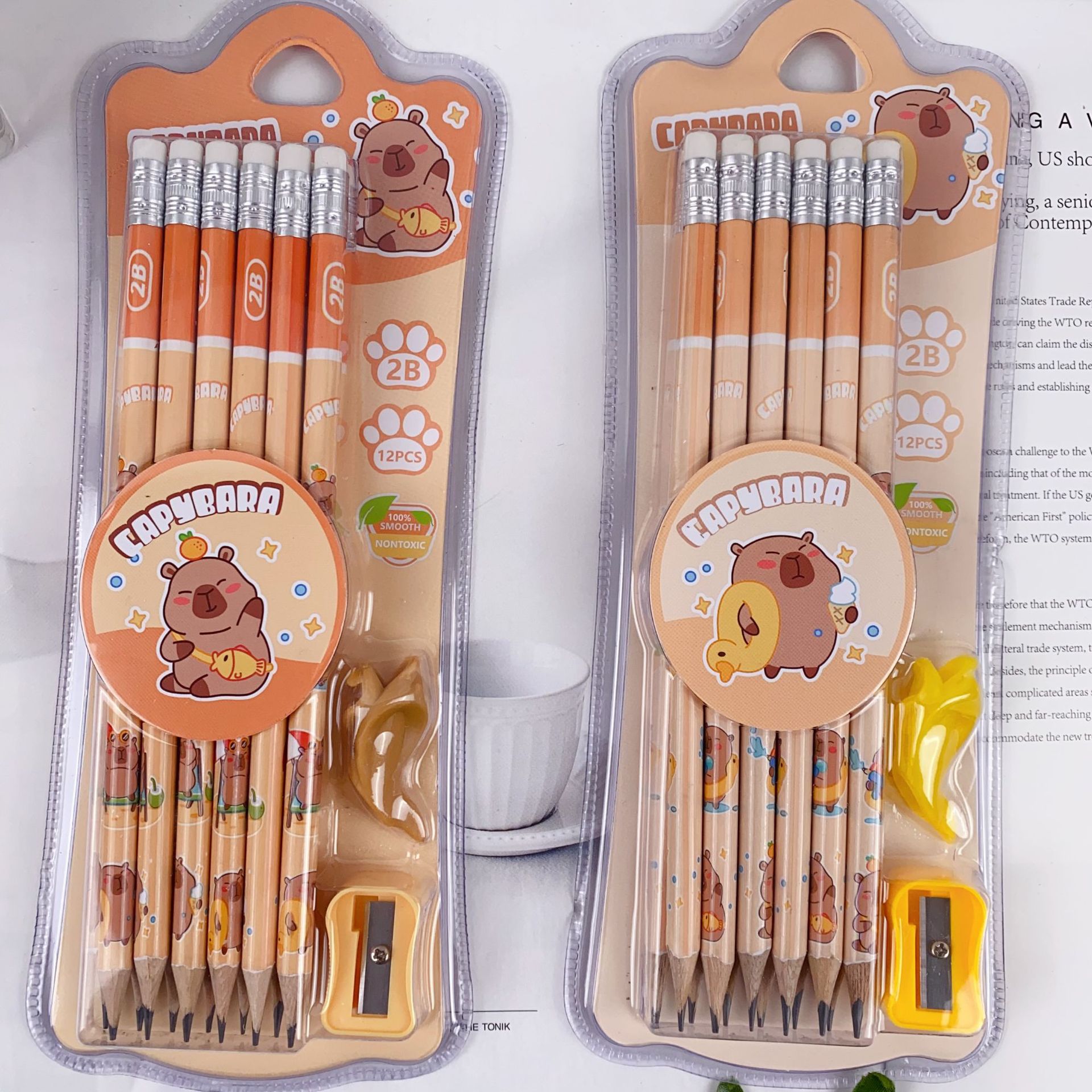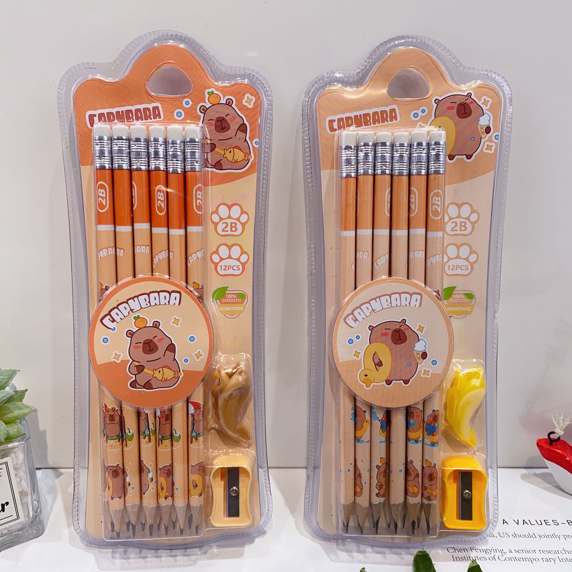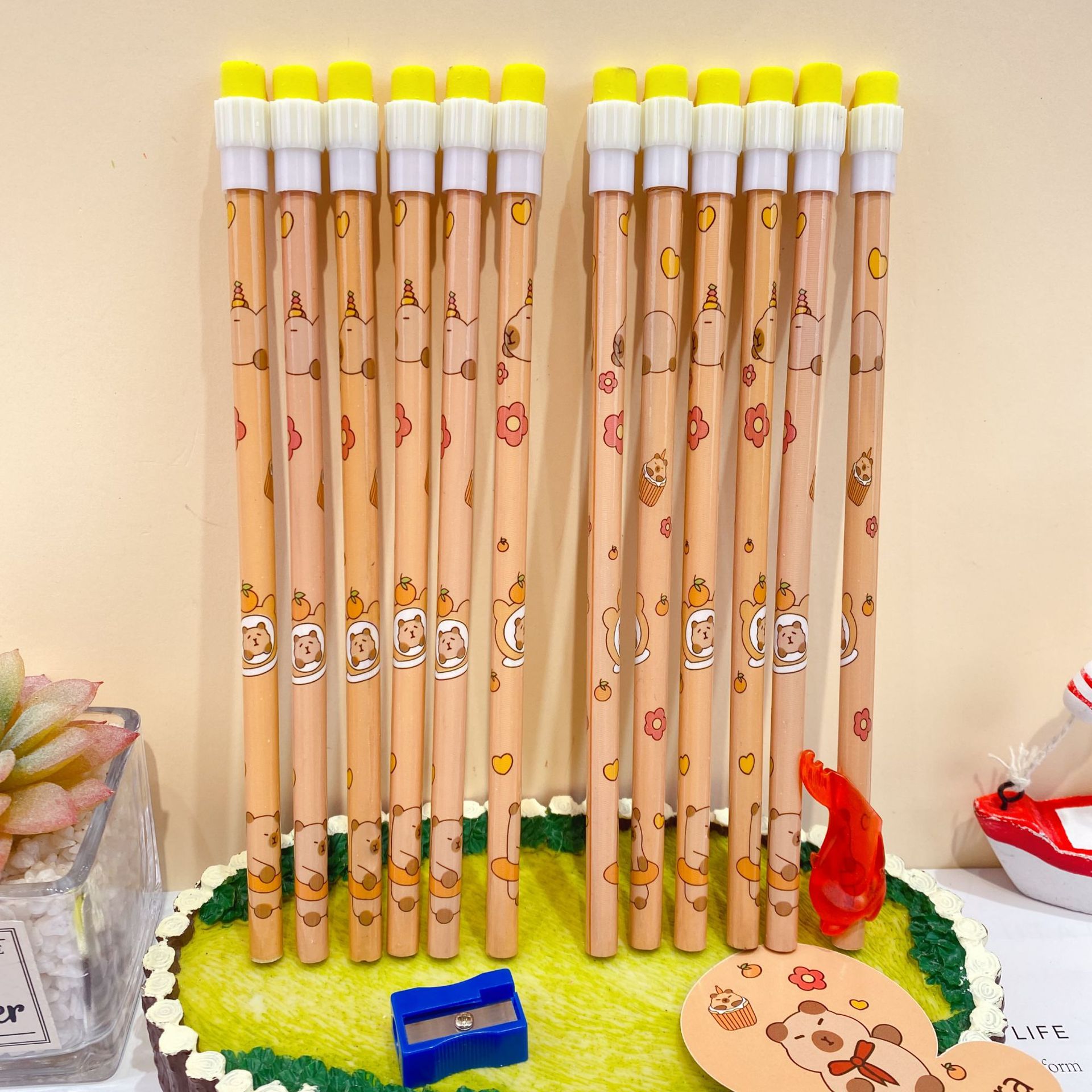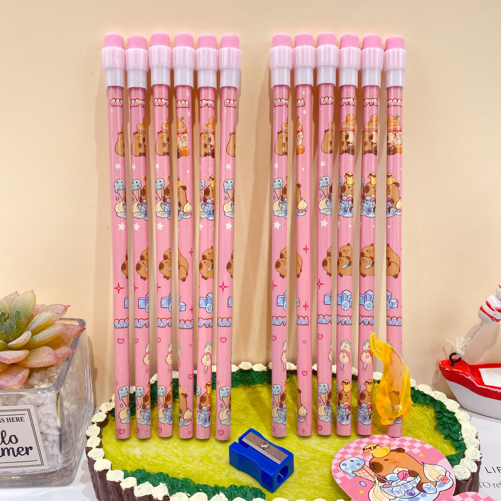 新款卡皮巴拉12支装木铅笔套装可爱卡通铅笔带橡皮擦卷笔刀握笔器