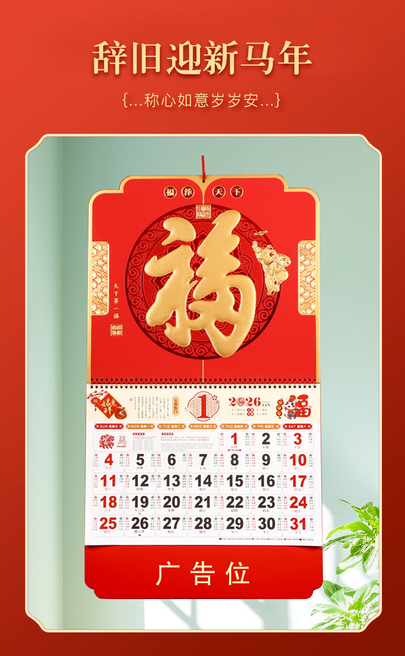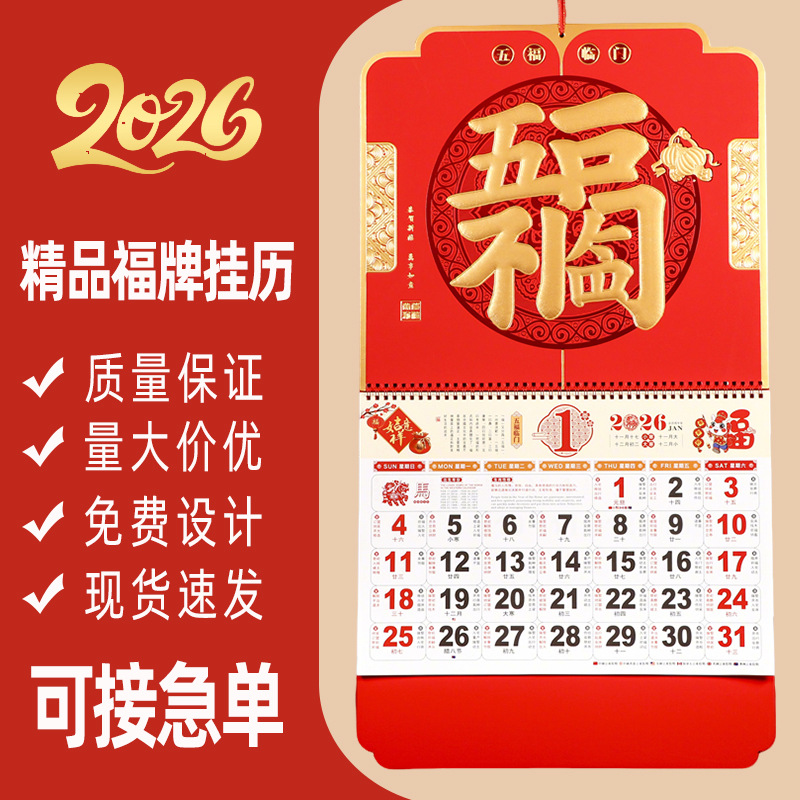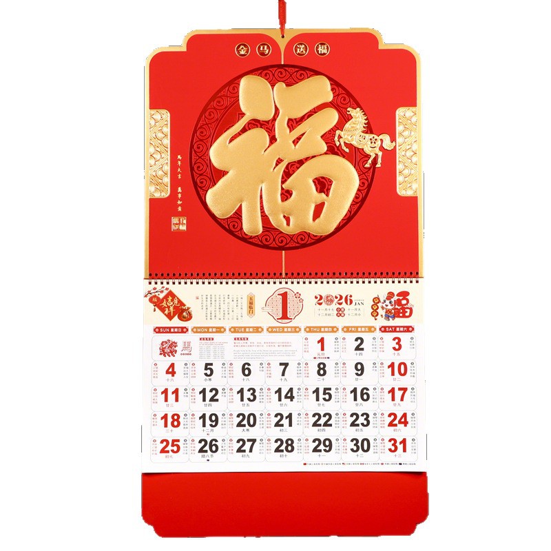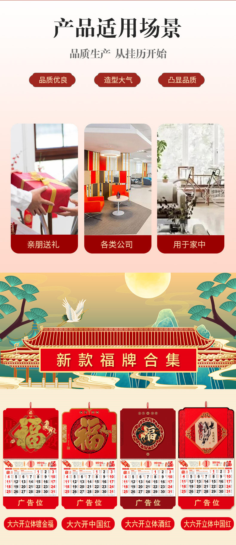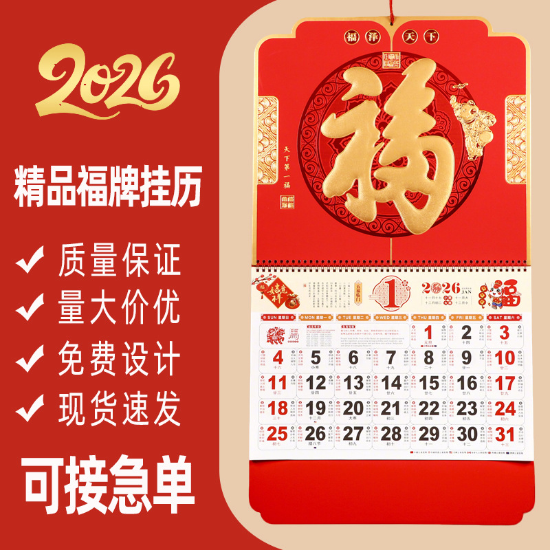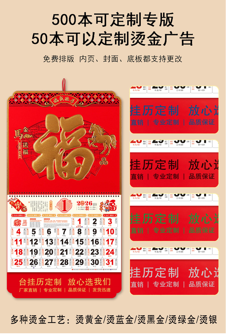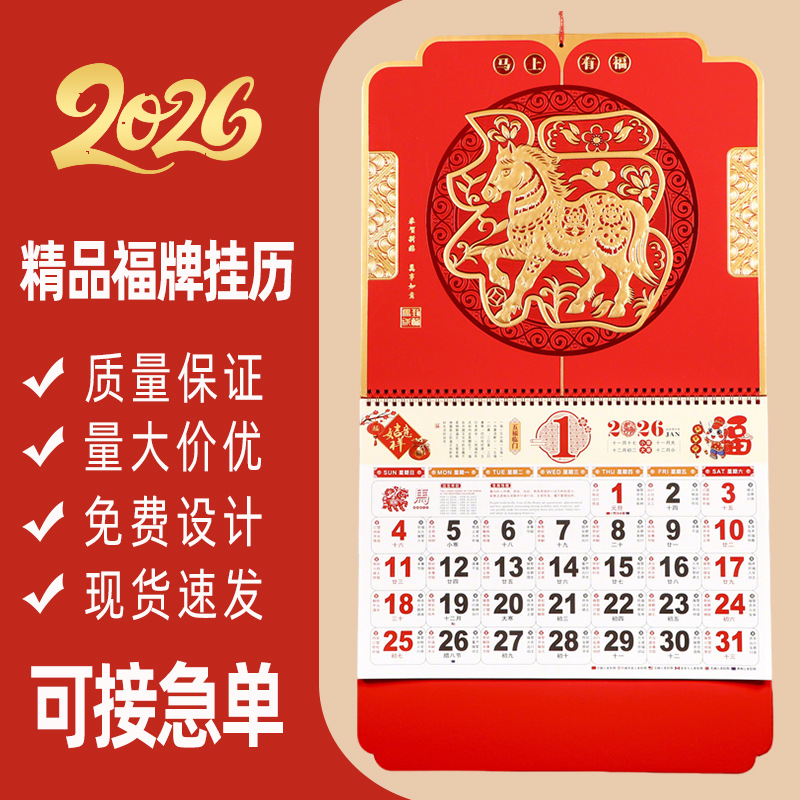 2026年九开金箔福字挂历定制公司广告创意月历马年吊历定做中国风