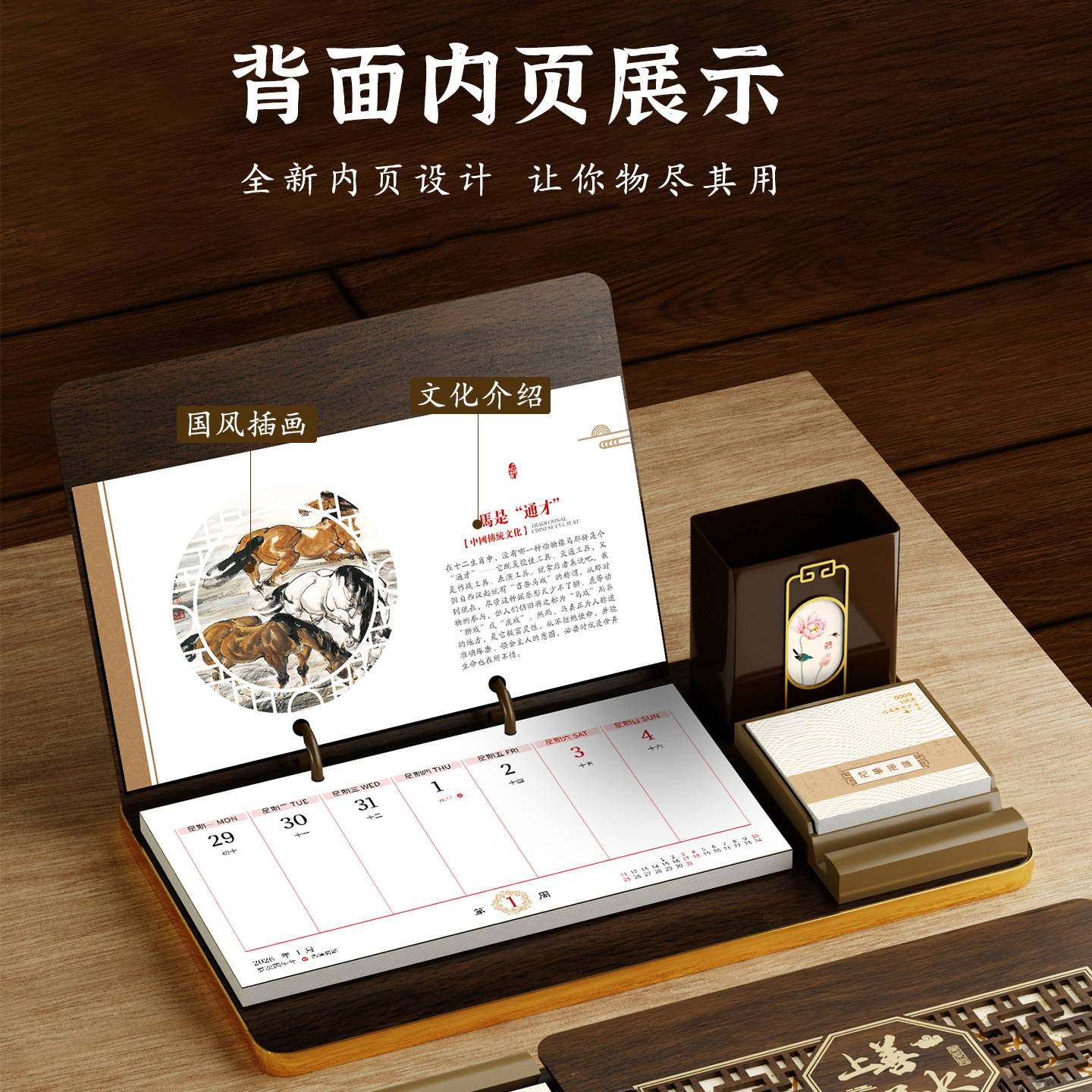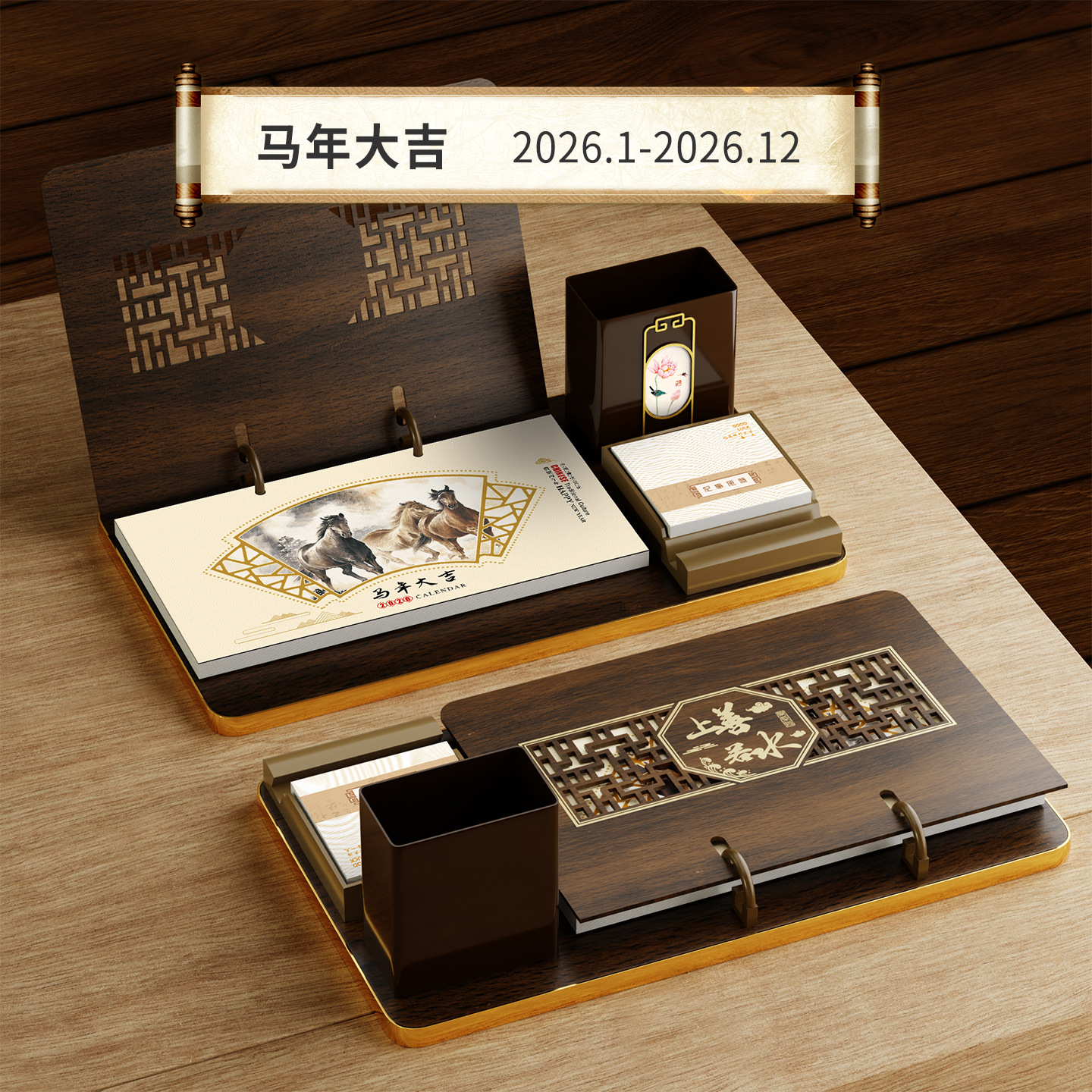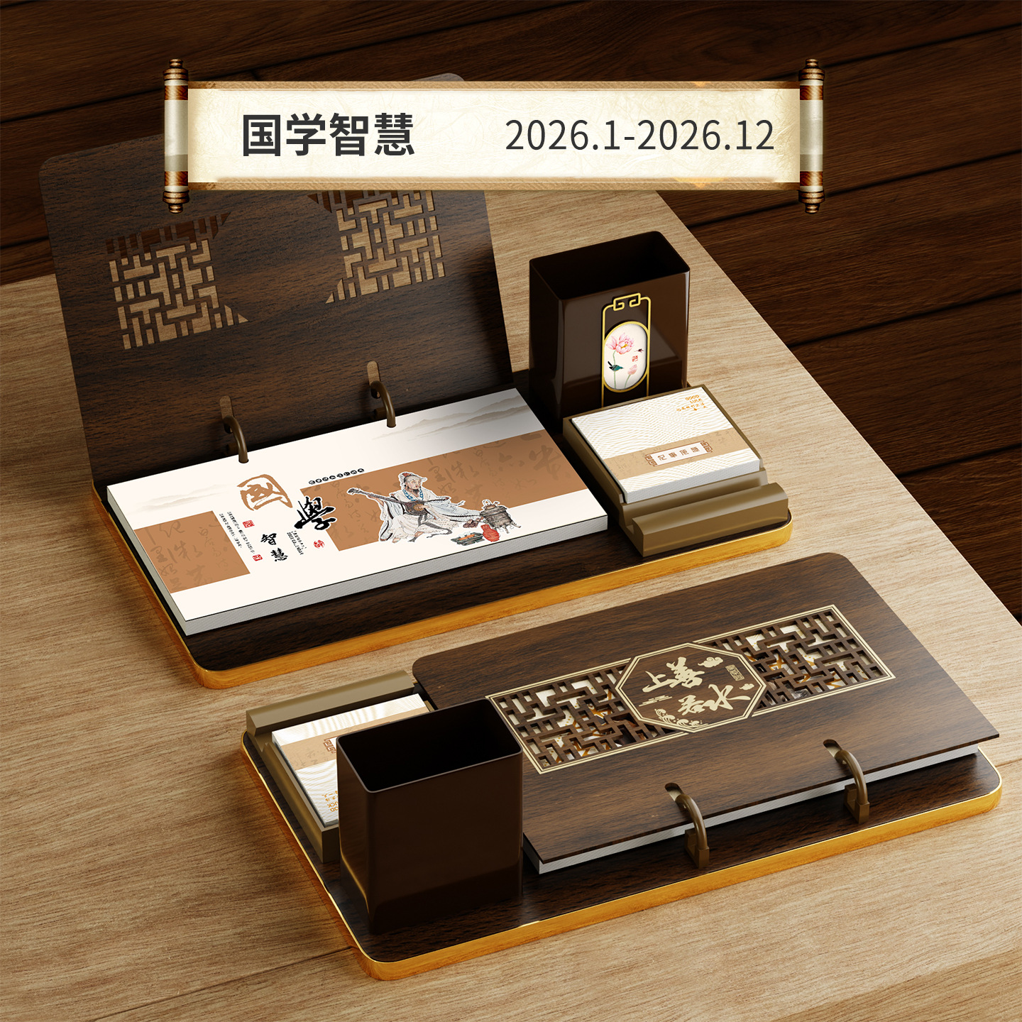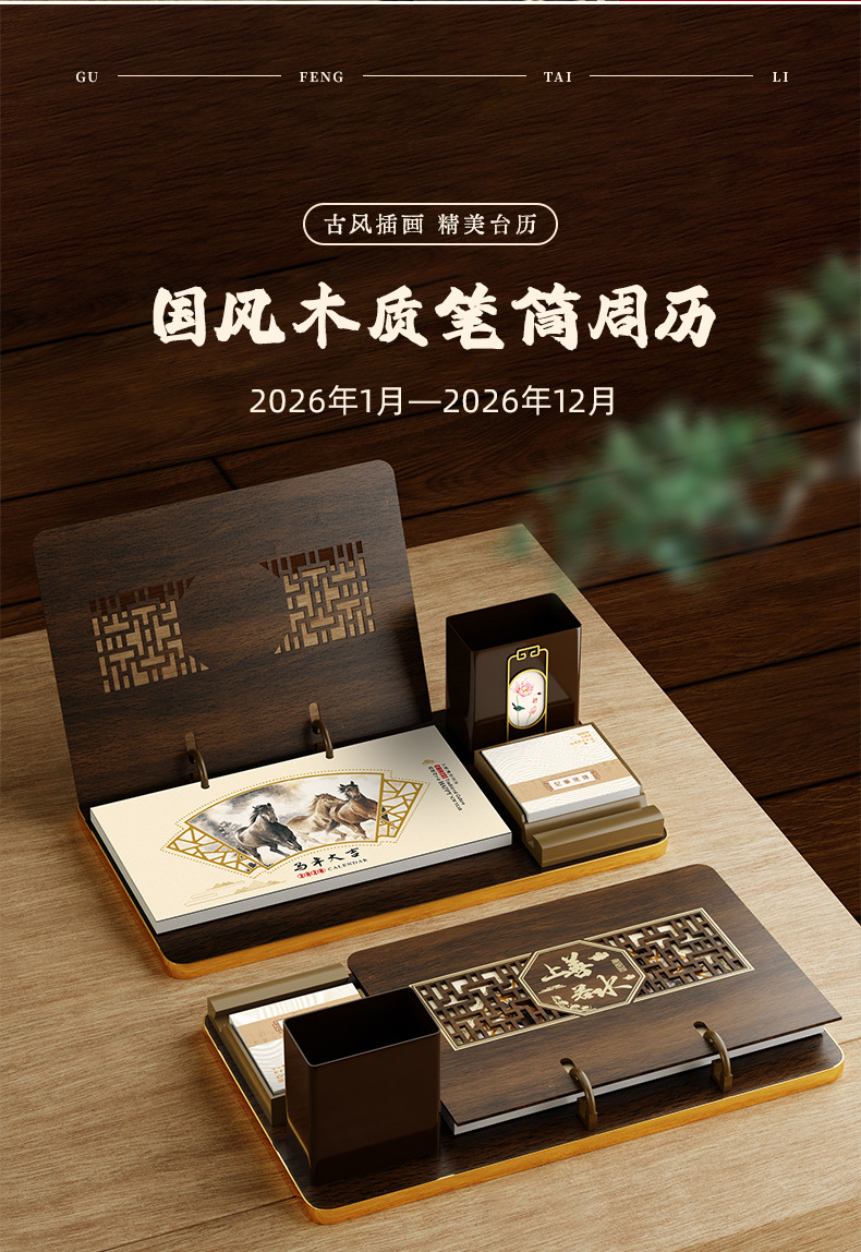 2026年木架台历创意中国风日历高档商务周历多功能笔筒礼盒装定制