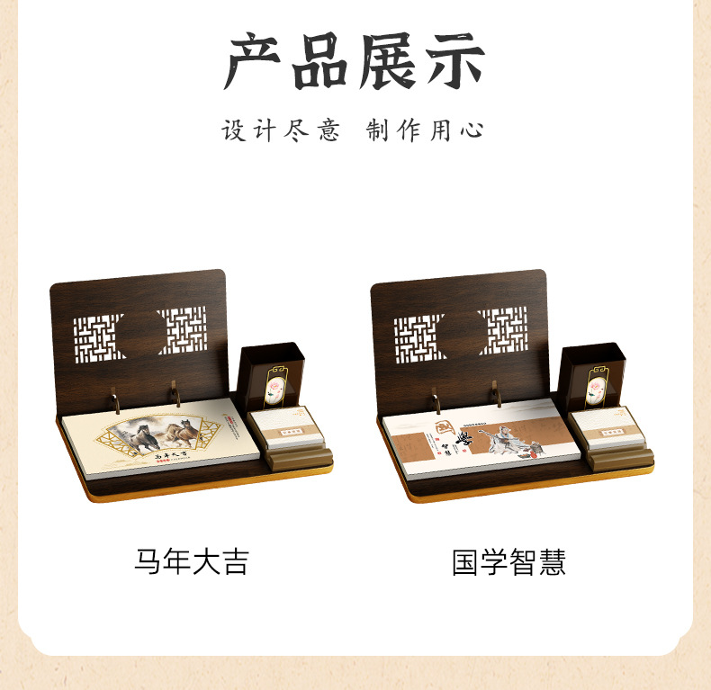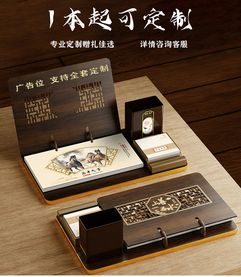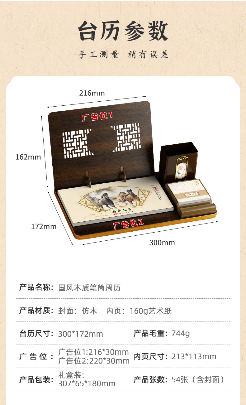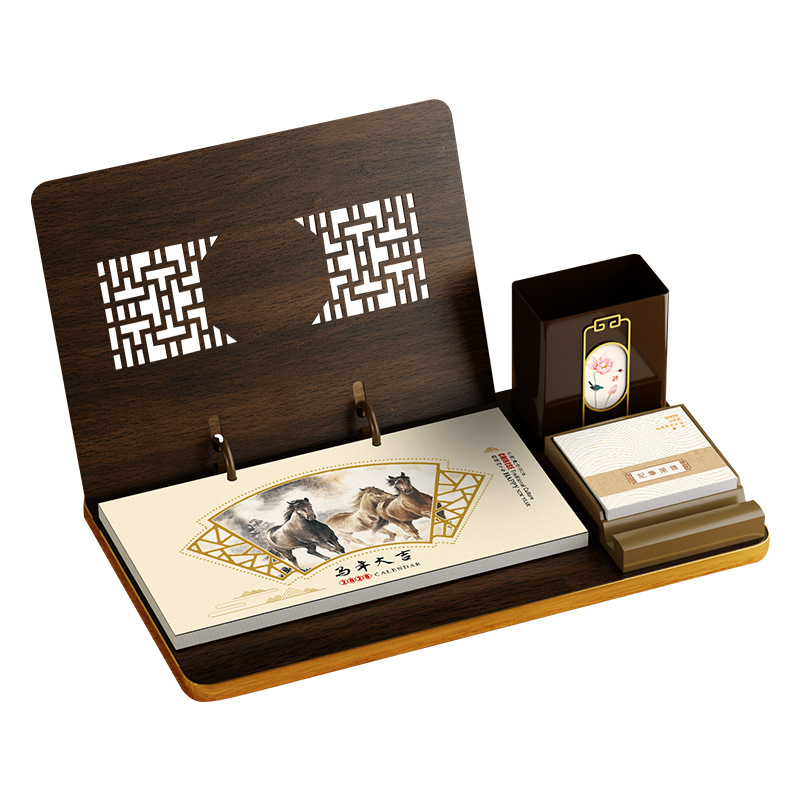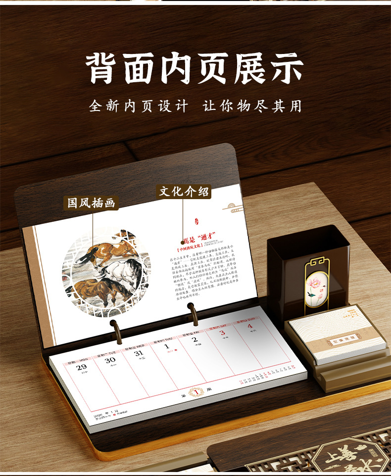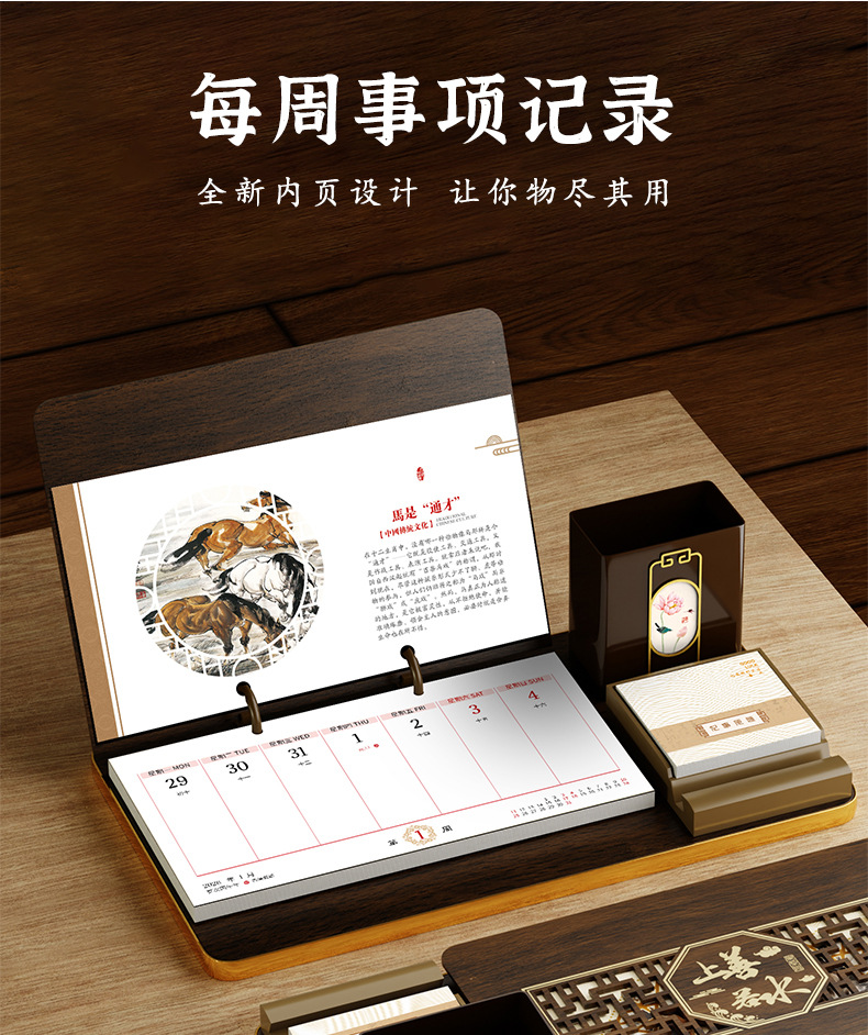 2026年木架台历创意中国风日历高档商务周历多功能笔筒礼盒装定制