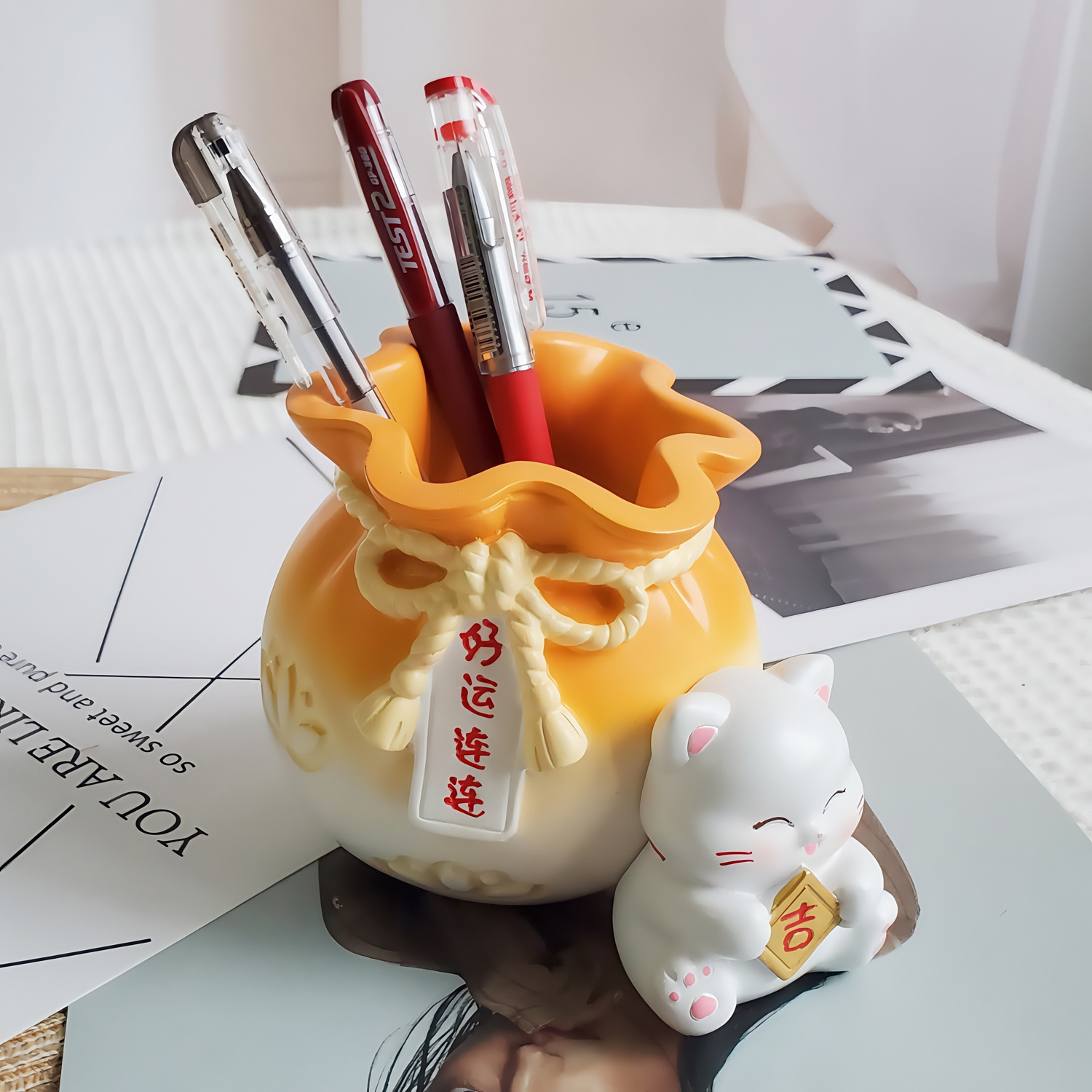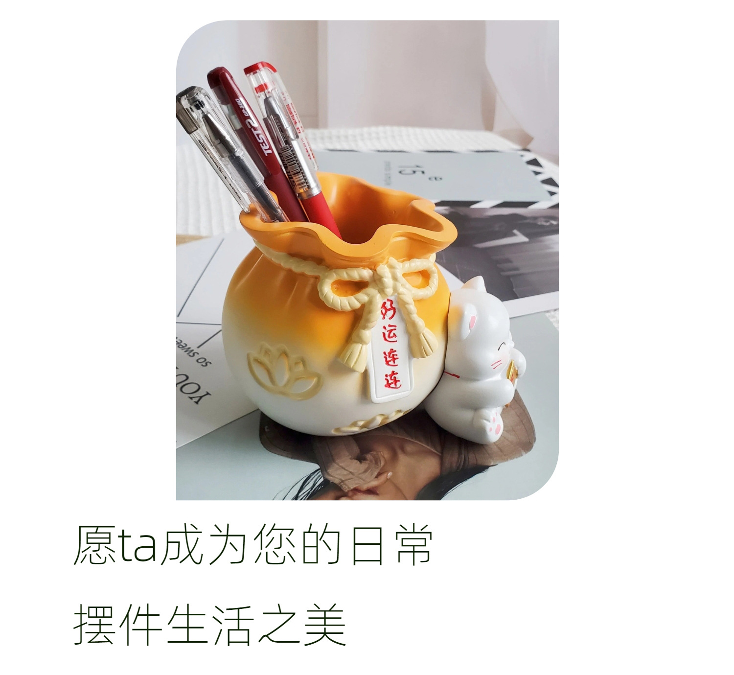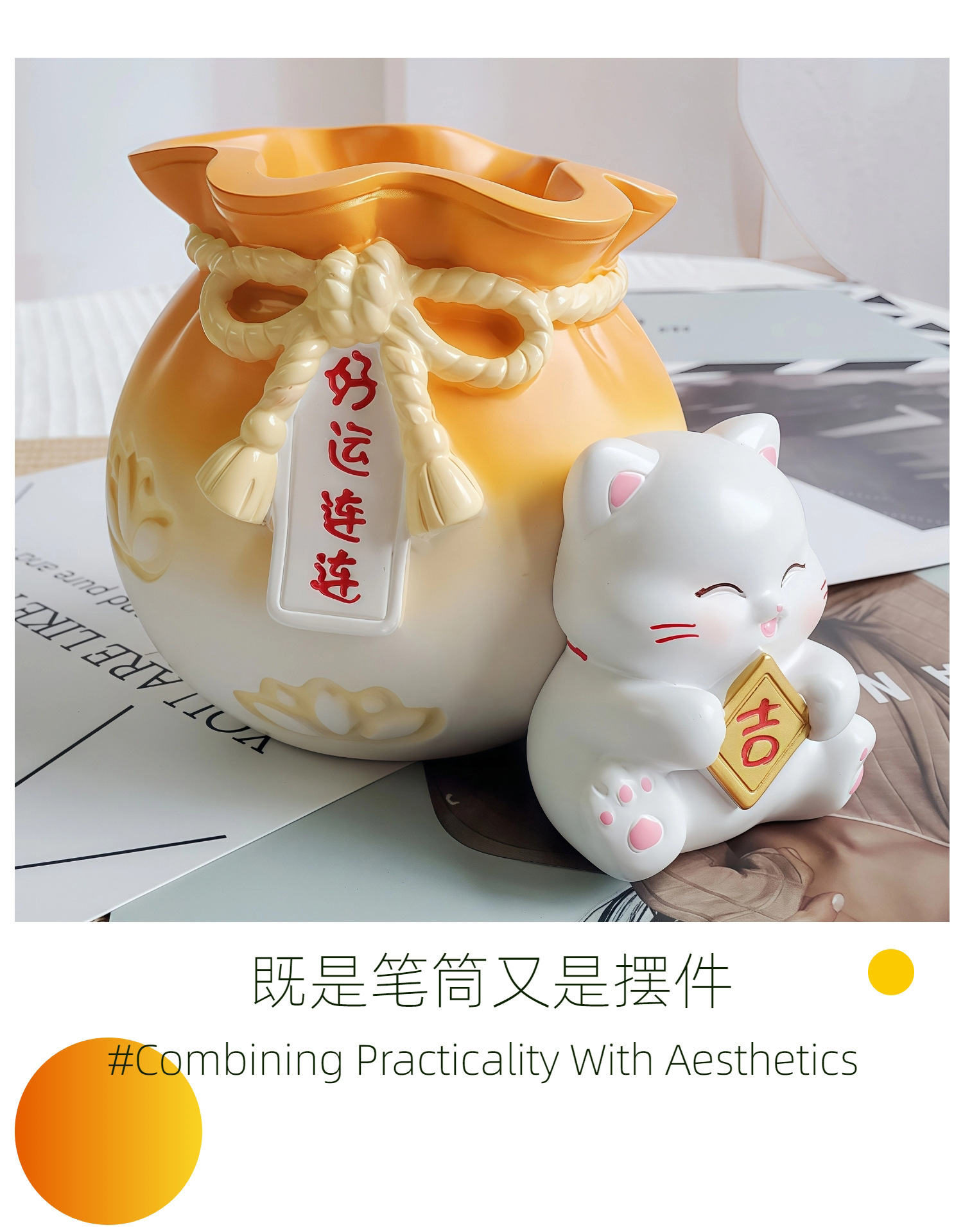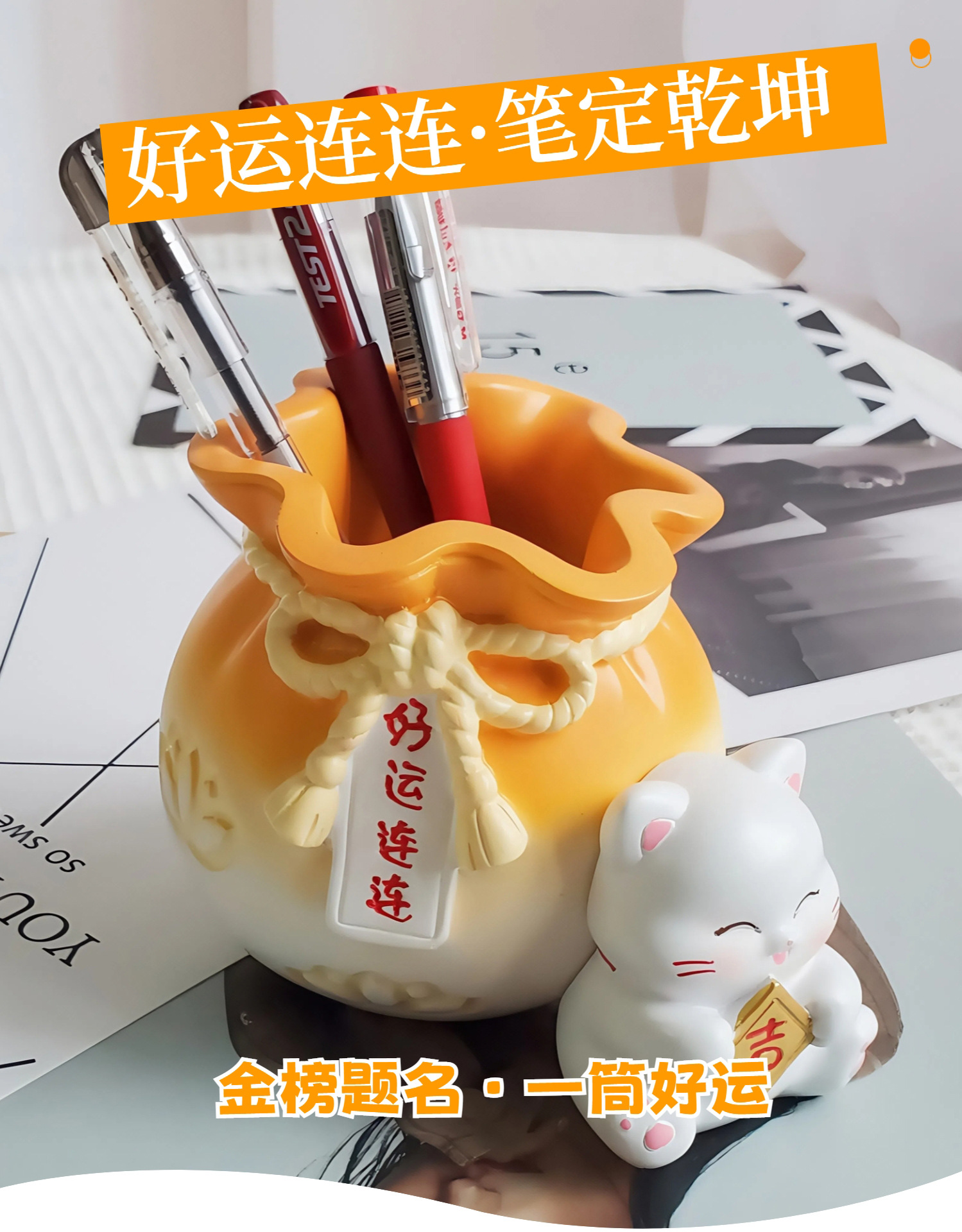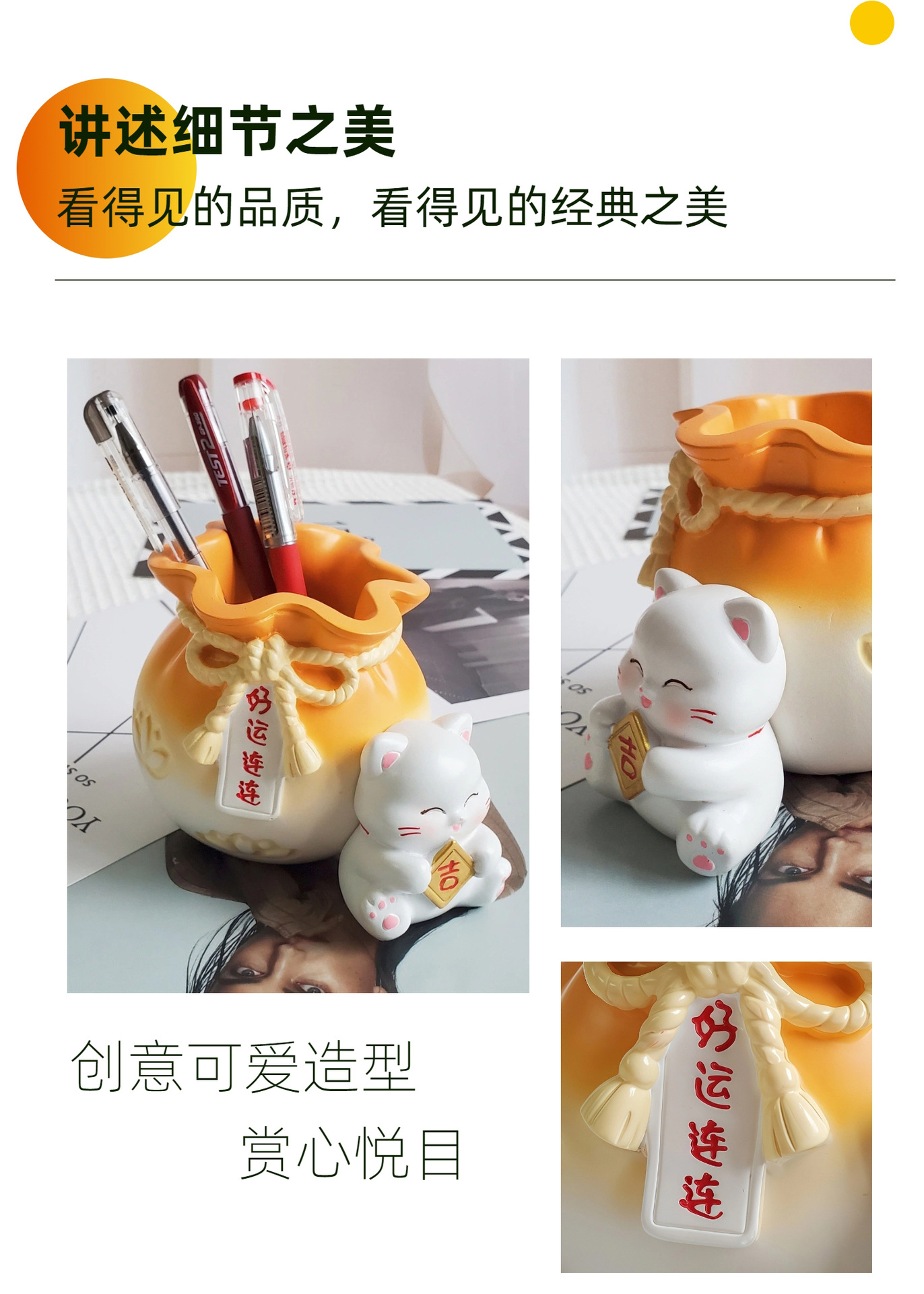 创意好运连连笔筒卡通招财猫咪学生礼物书房办公桌面树脂笔筒摆件