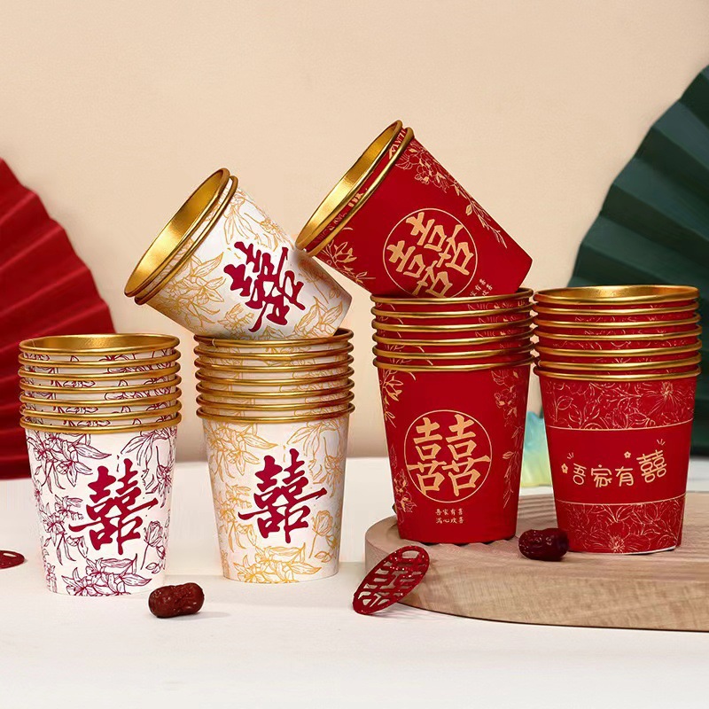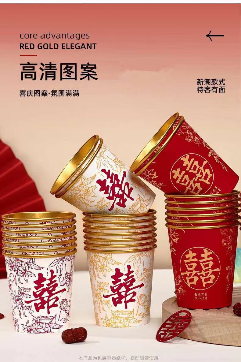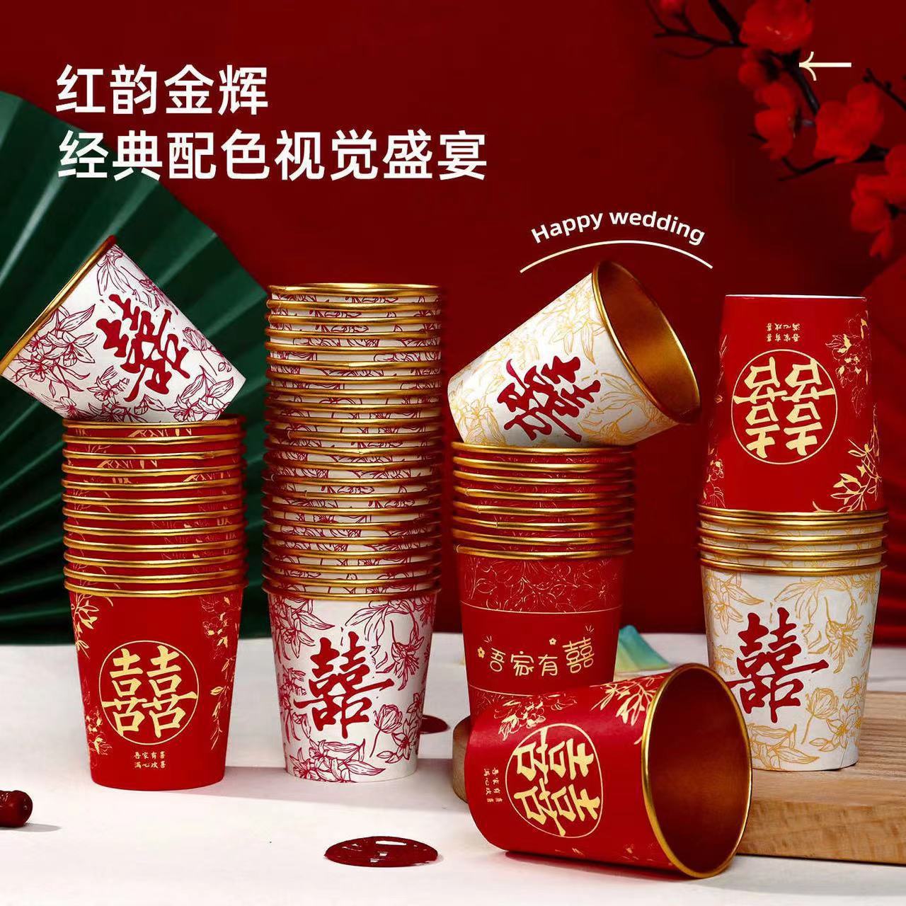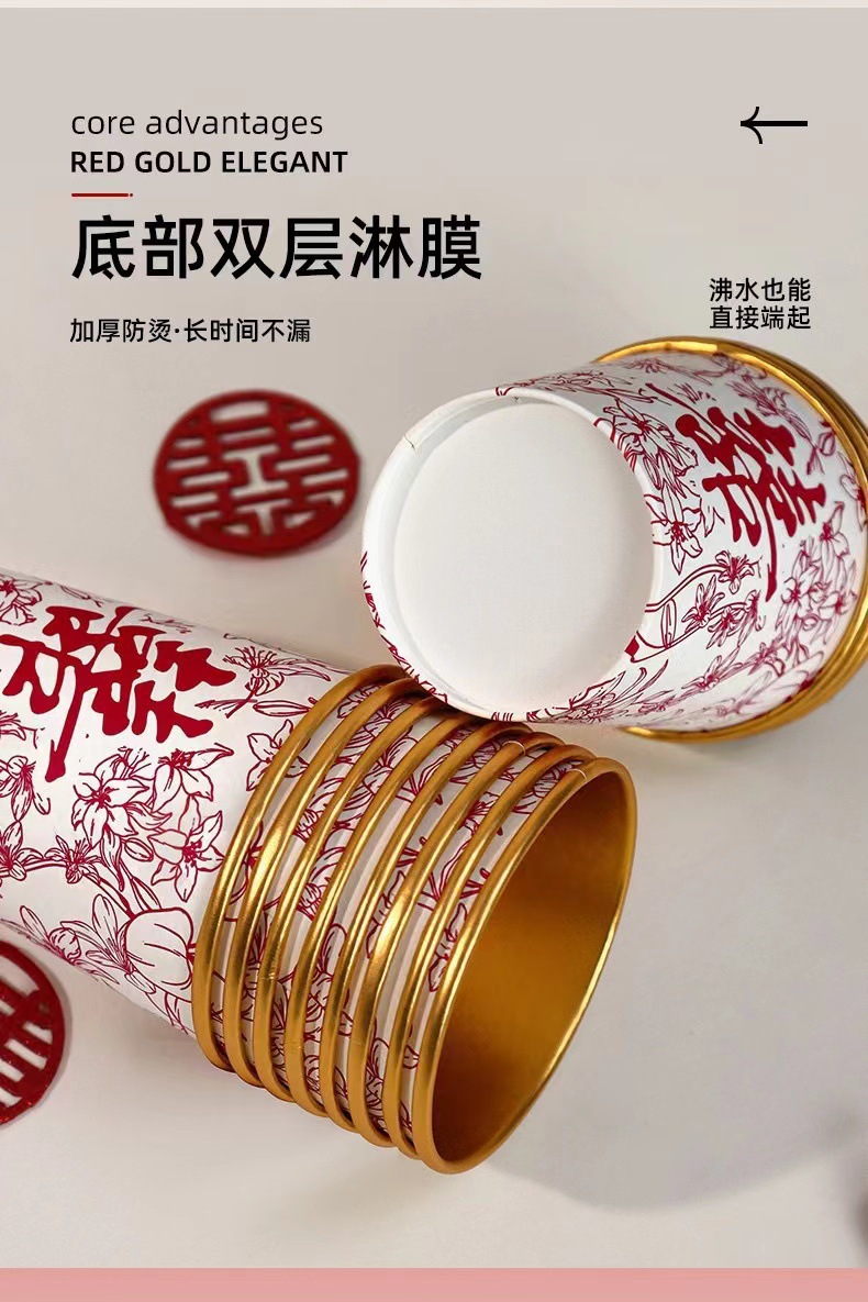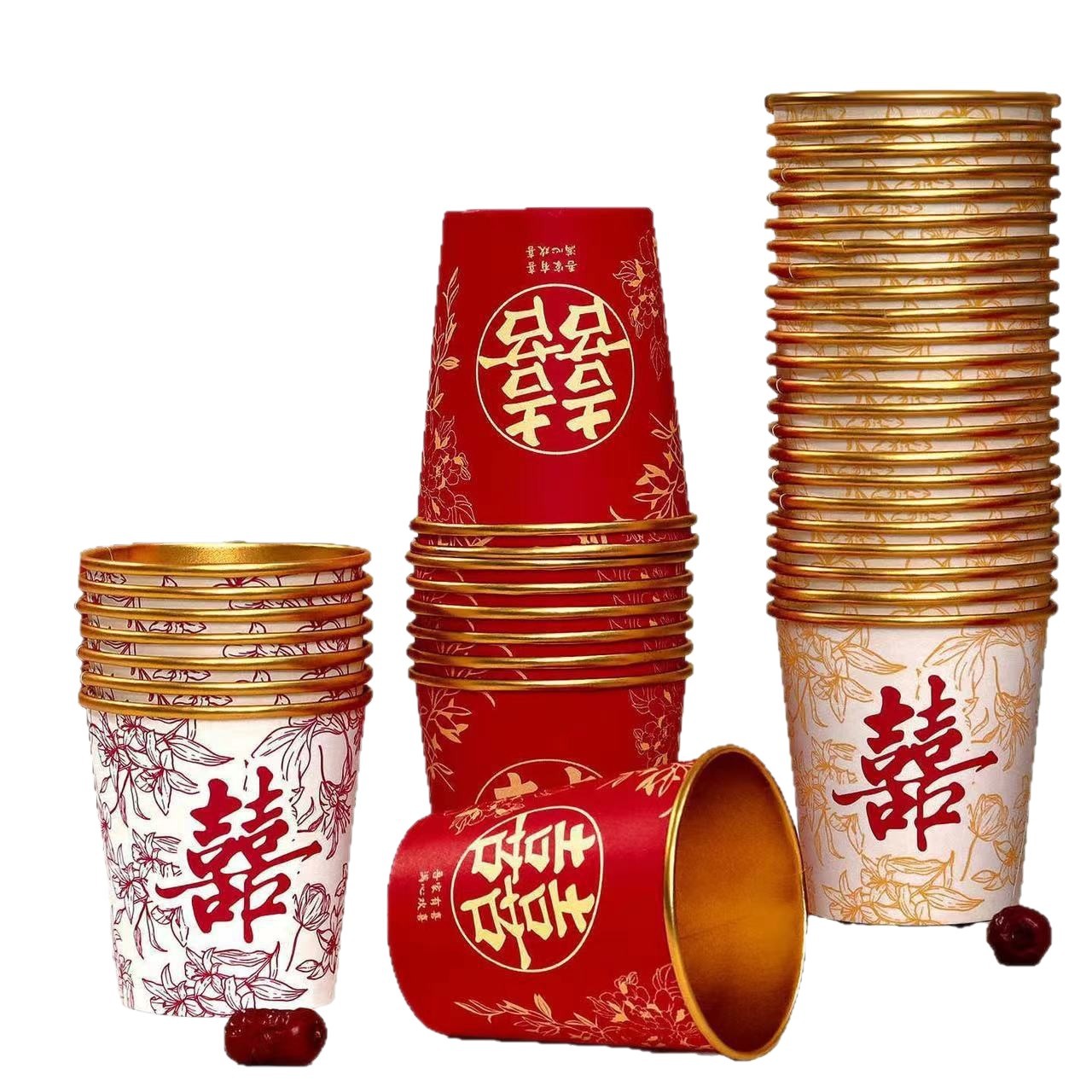 马年金箔纸杯婚礼红色喜茶纸杯金箔纸杯加厚杯子结婚纸杯一次性