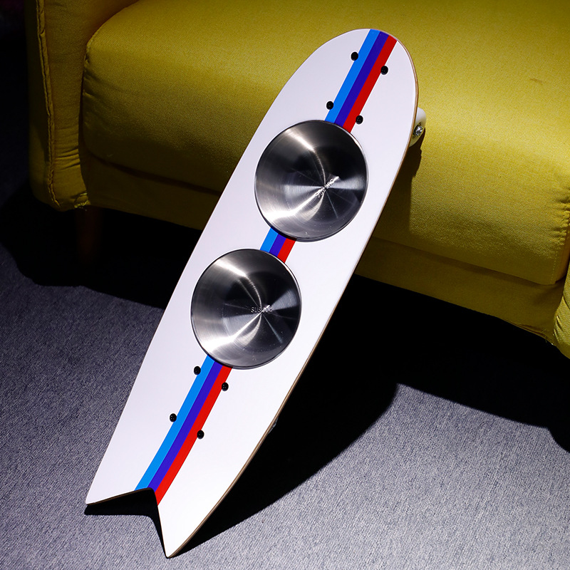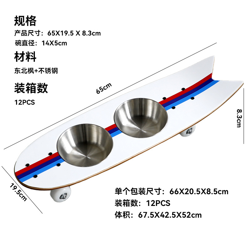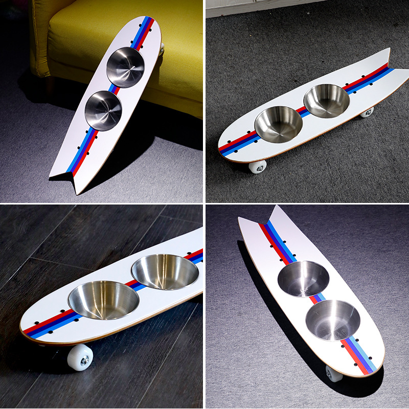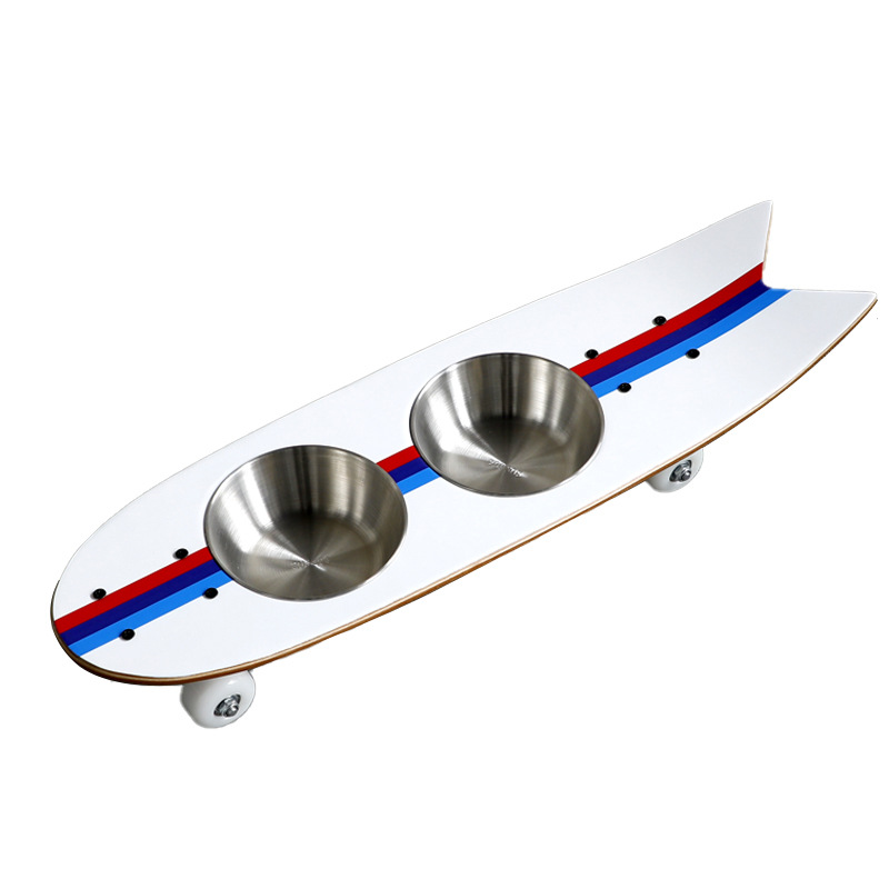 跨境狗狗不锈钢双碗滑板形状趣味宠物喂水喂食不锈钢双碗狗碗新款