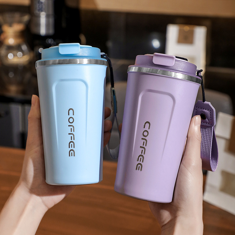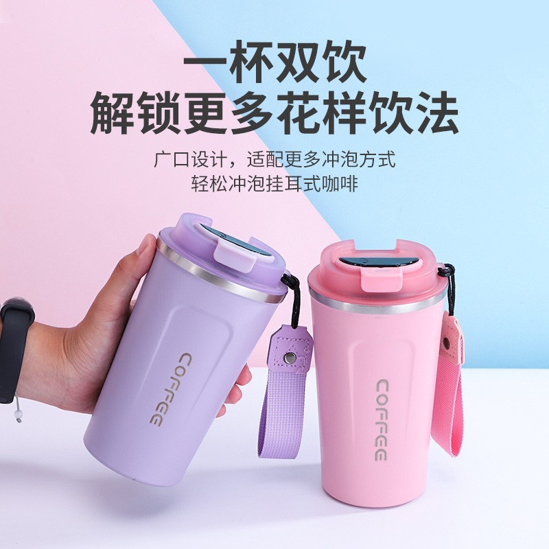 跨境提绳温度咖啡杯304喷塑马卡龙色男女保温水杯便携车载马克杯