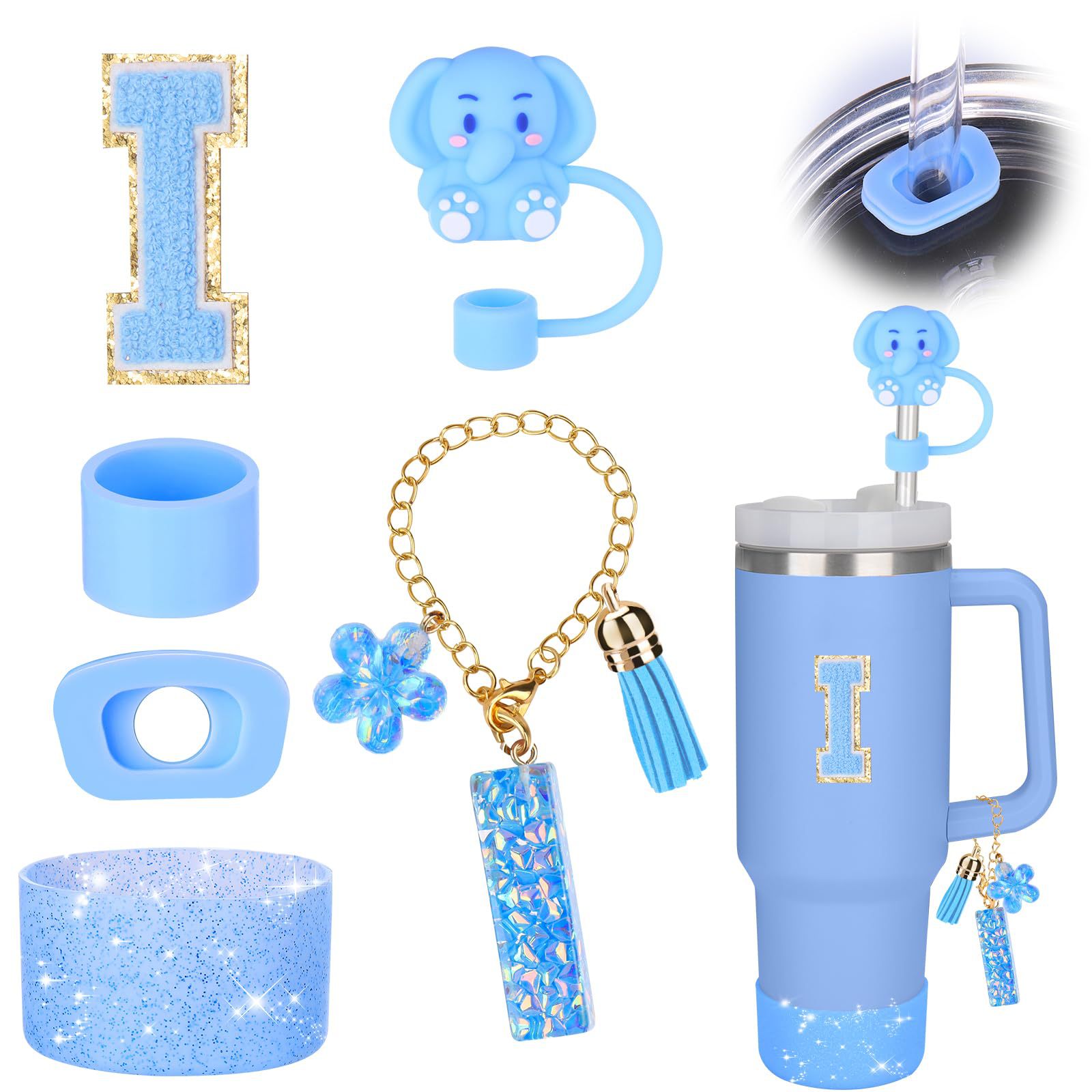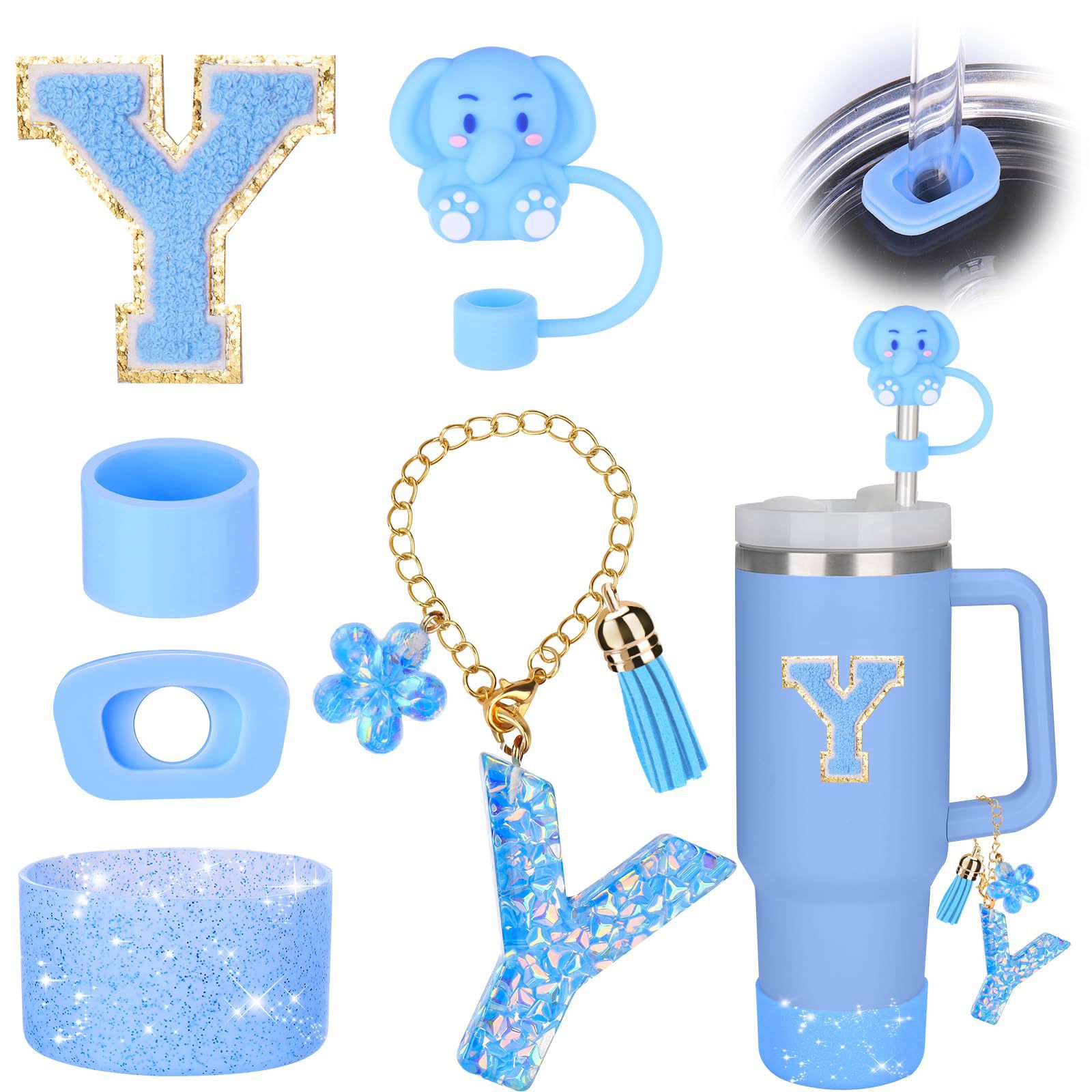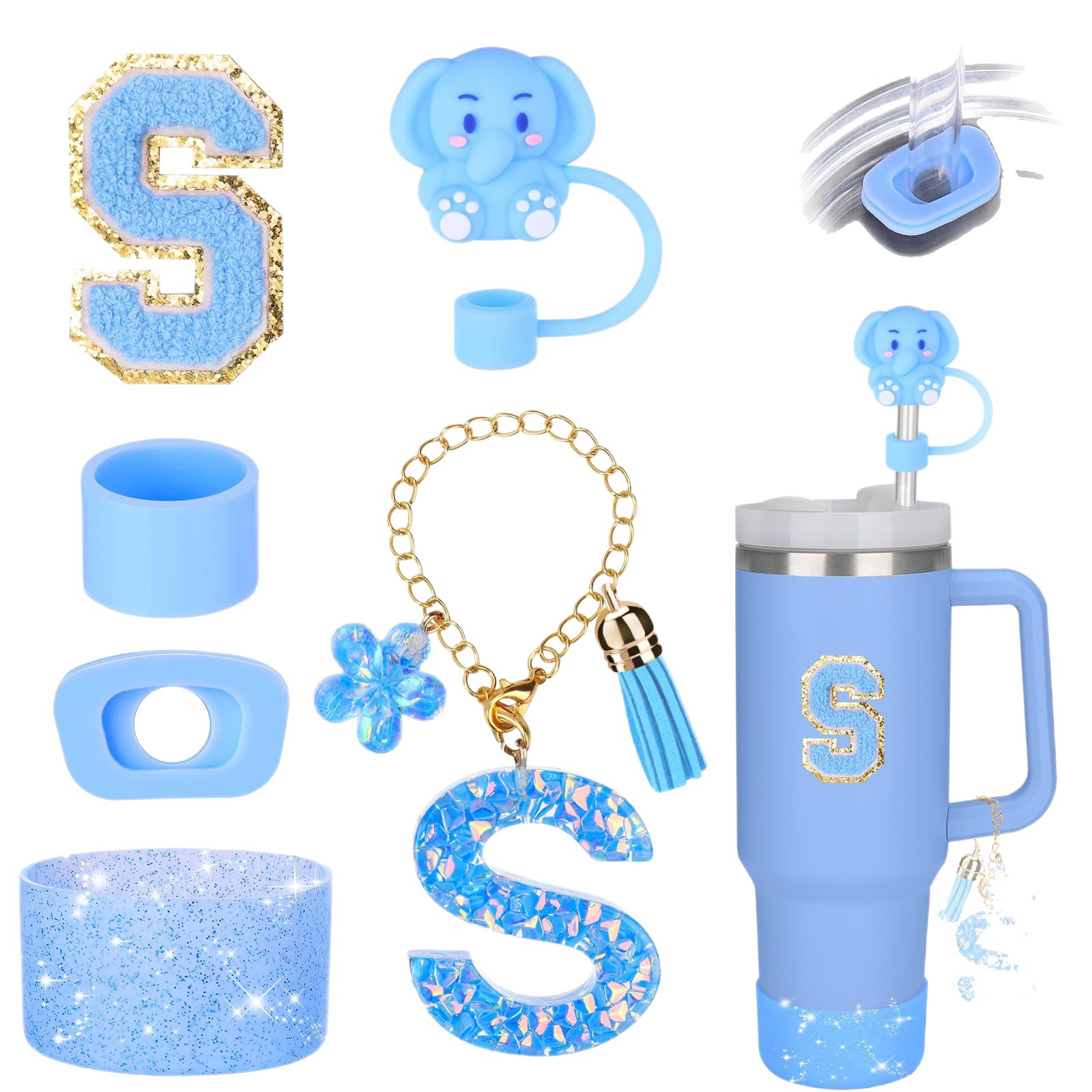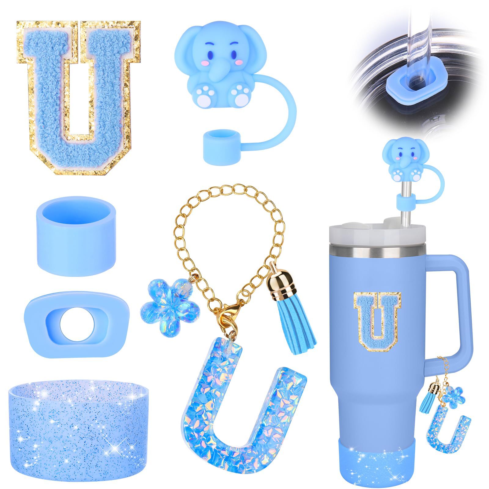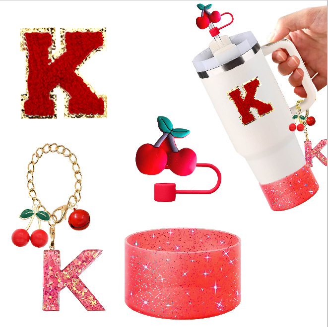 蓝色杯托树脂亮片花朵流苏杯链可爱吸管帽字母毛巾刺绣硅胶杯套