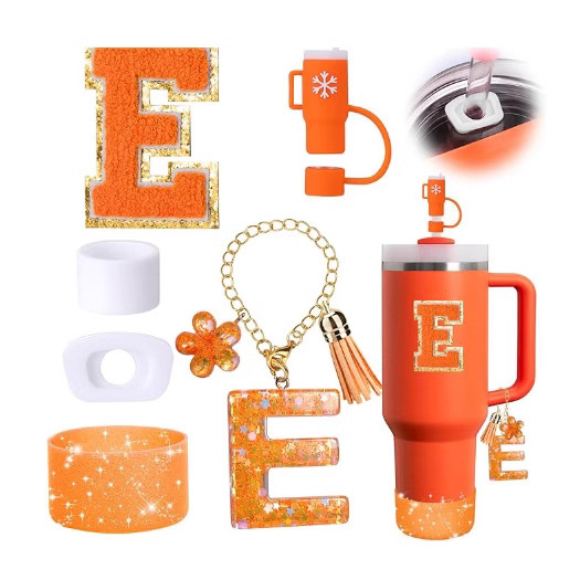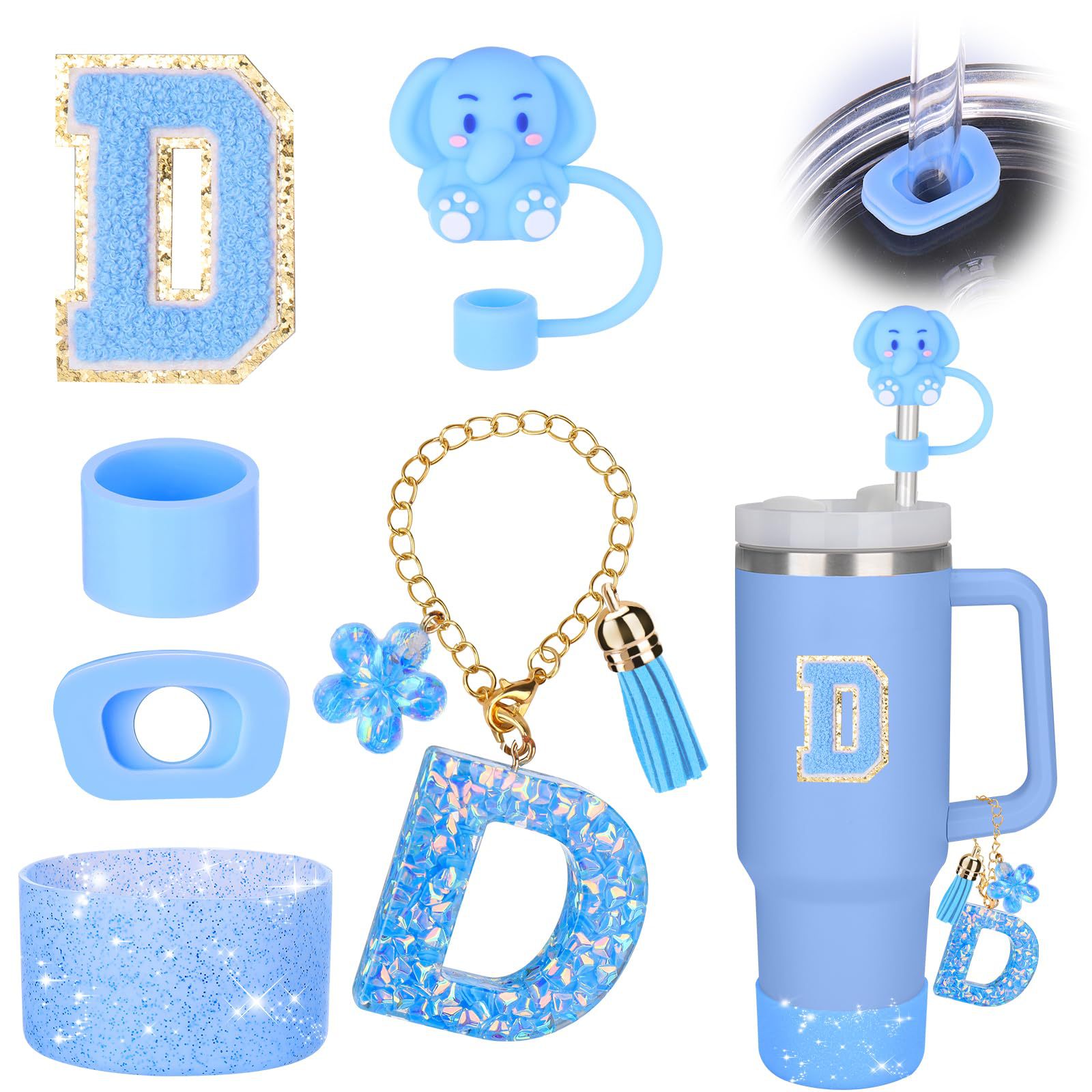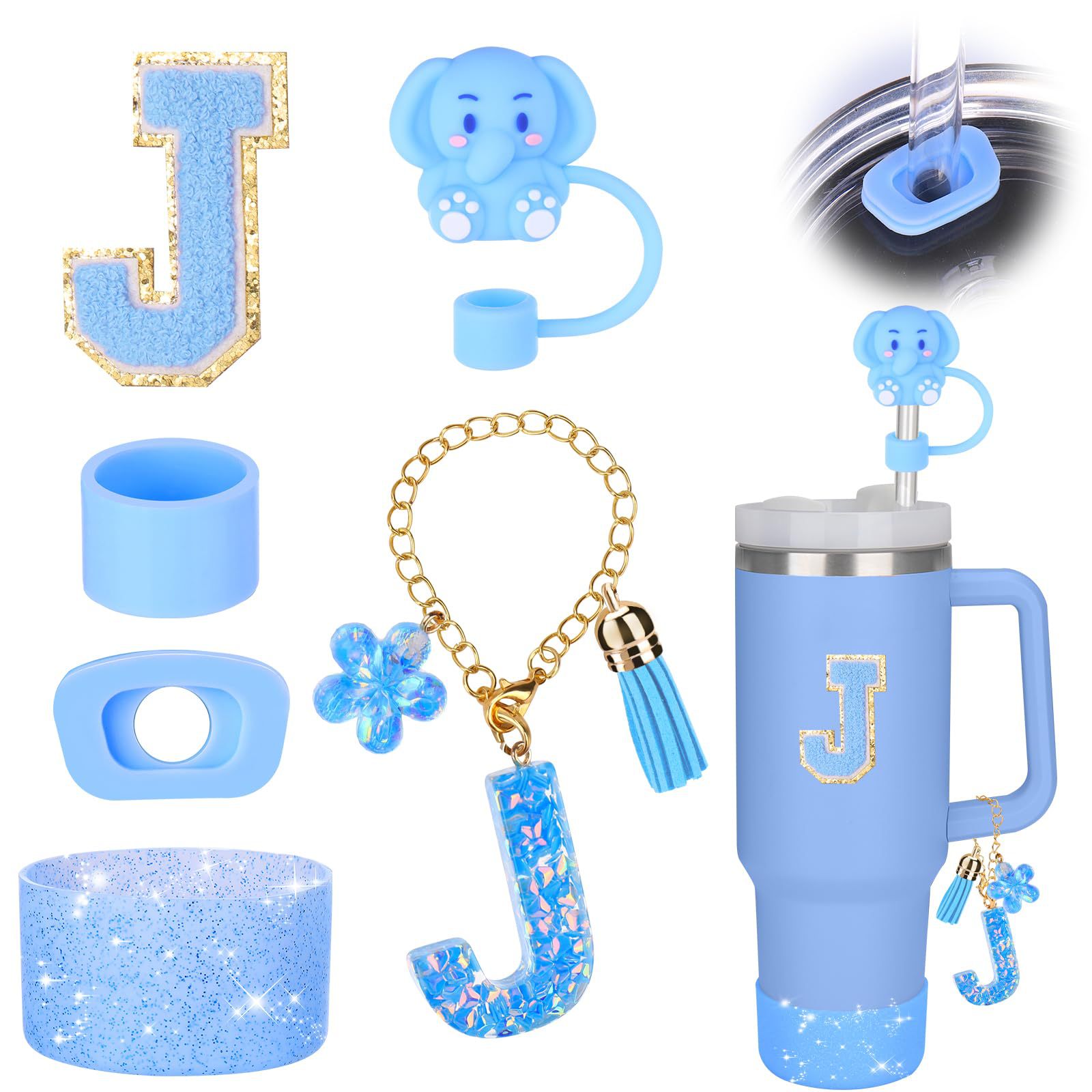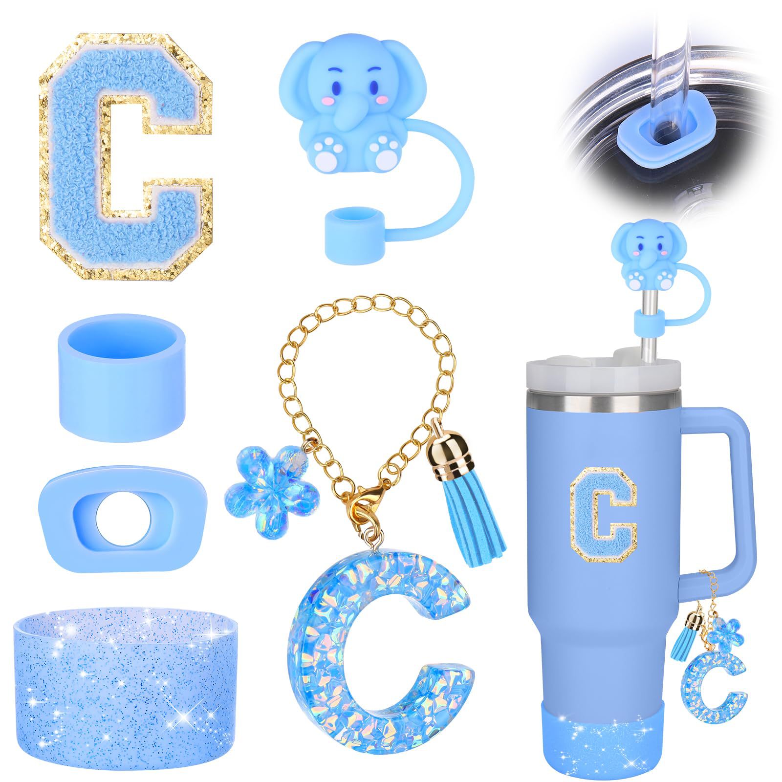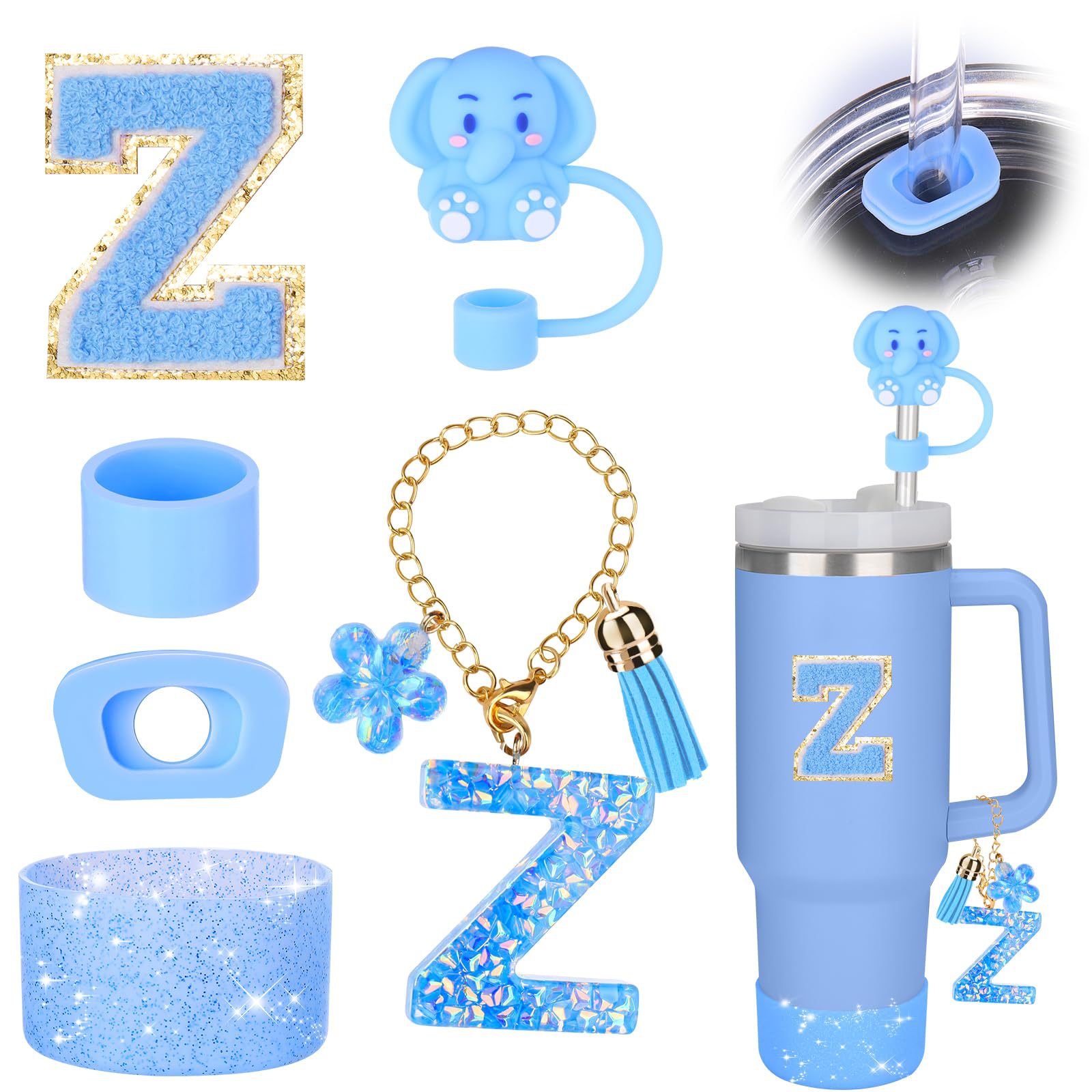 蓝色杯托树脂亮片花朵流苏杯链可爱吸管帽字母毛巾刺绣硅胶杯套