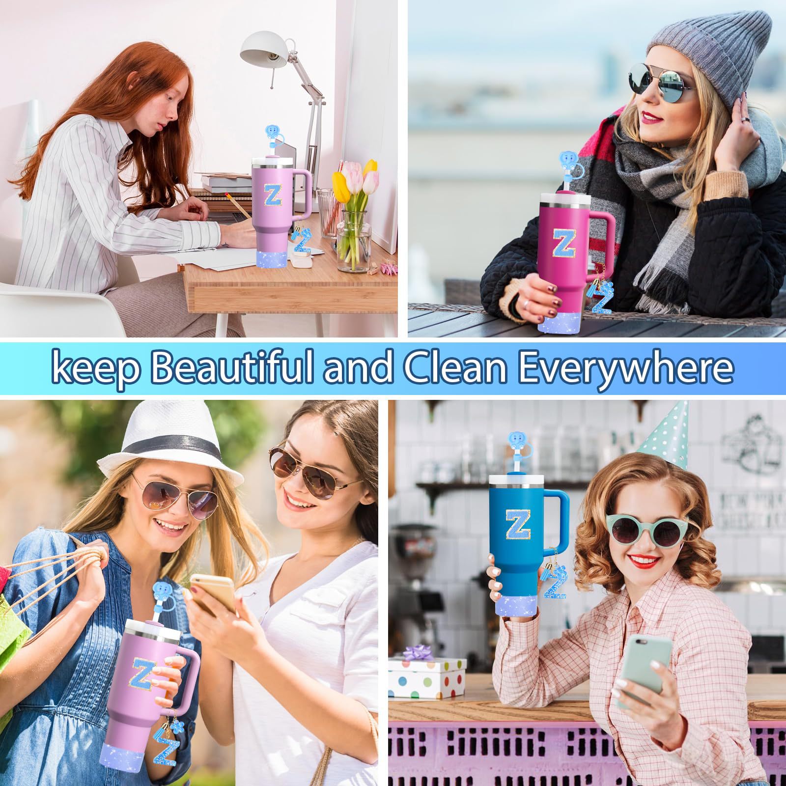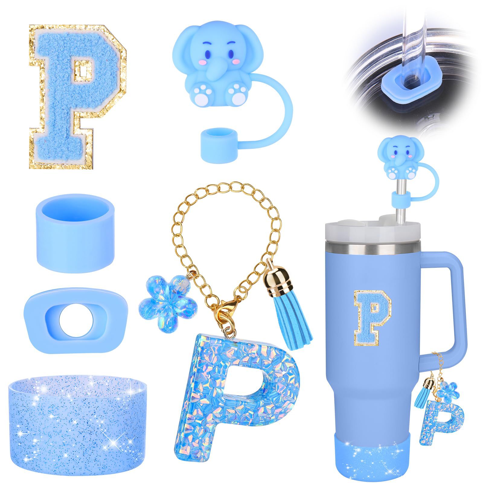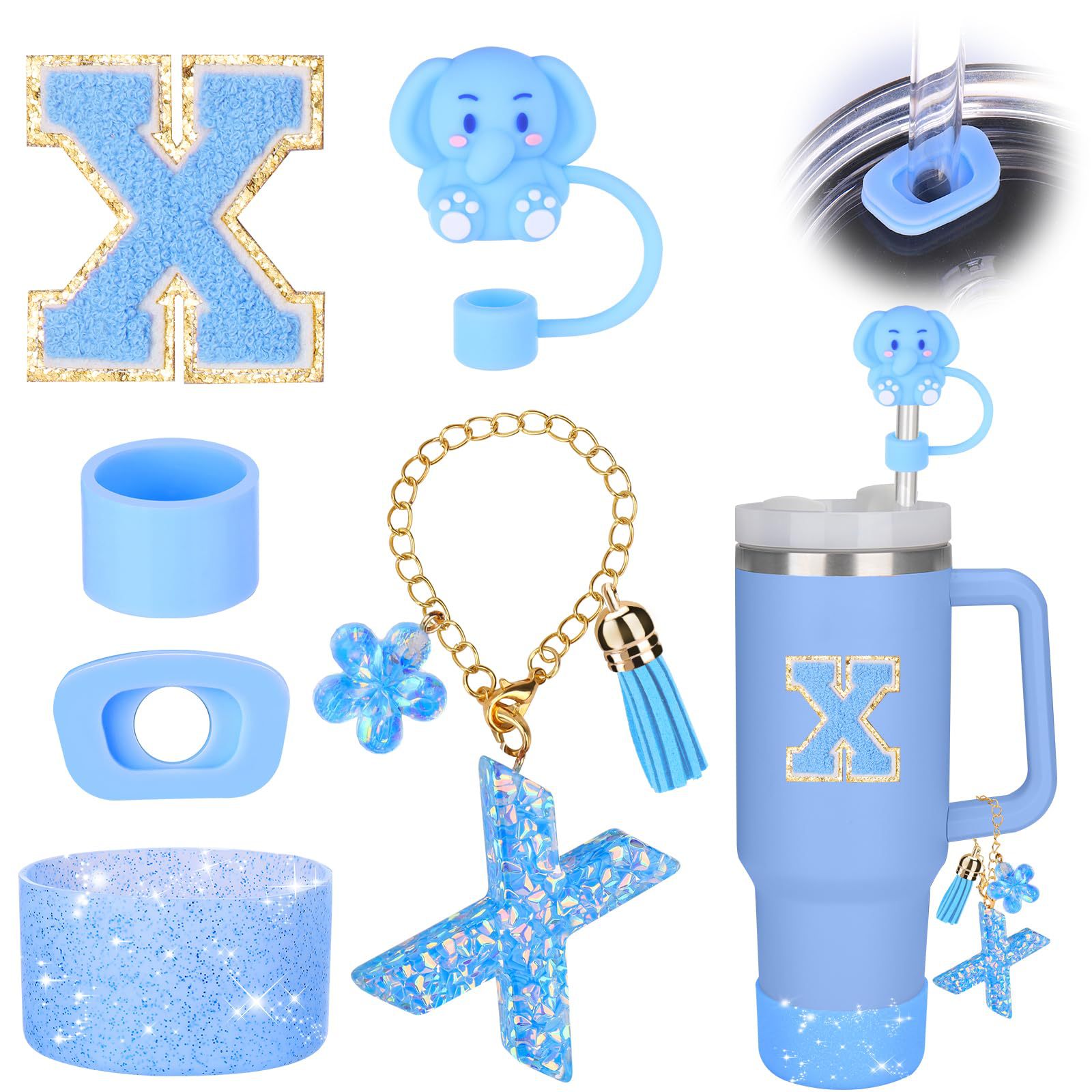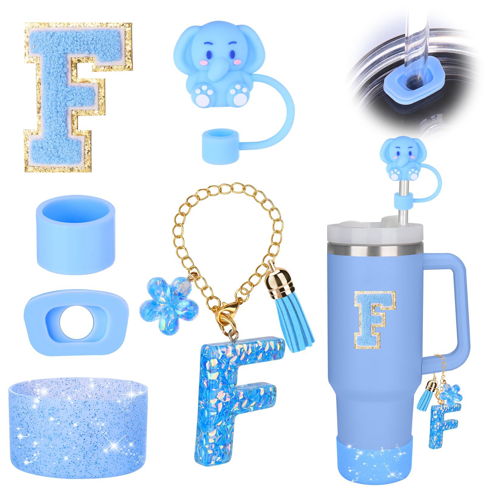 蓝色杯托树脂亮片花朵流苏杯链可爱吸管帽字母毛巾刺绣硅胶杯套