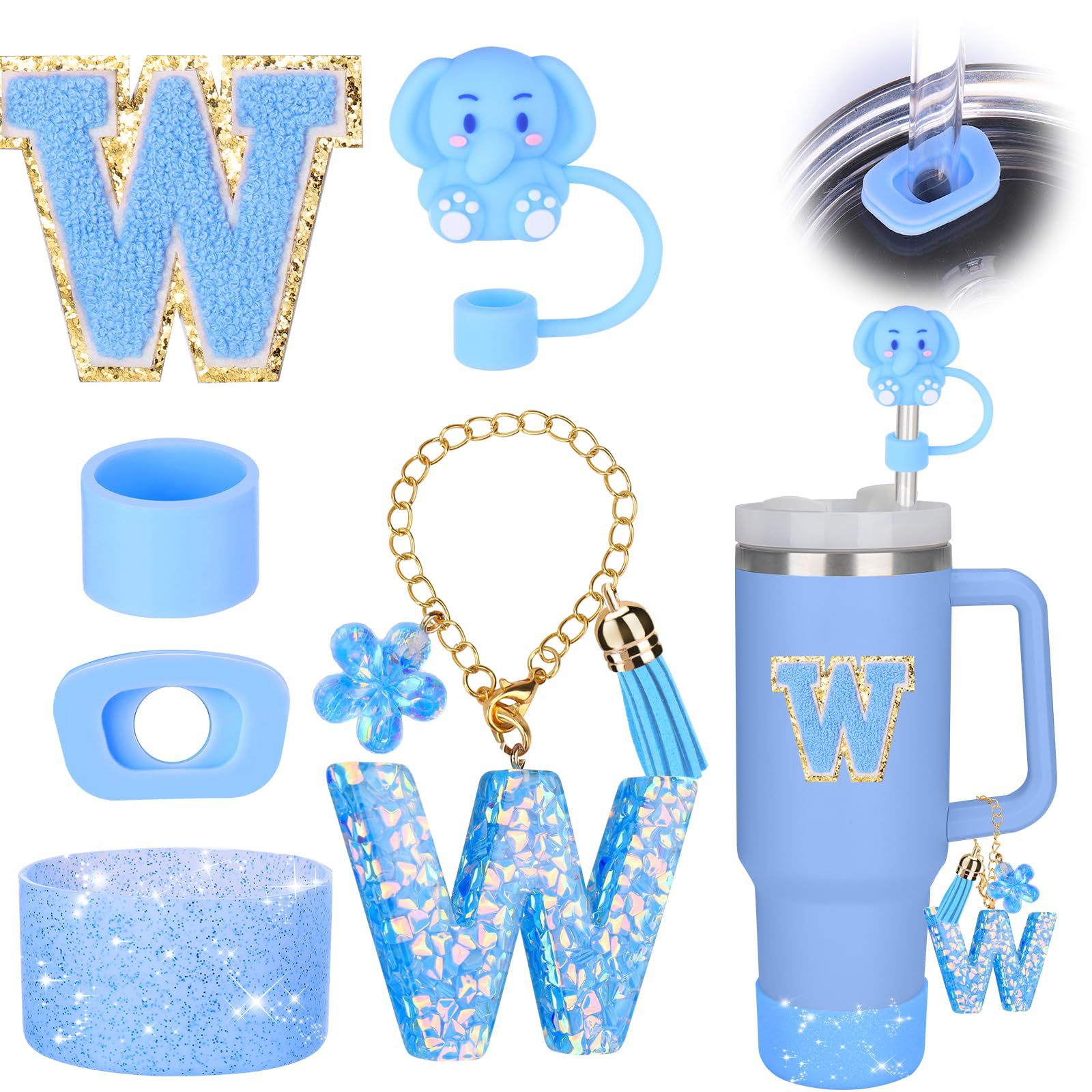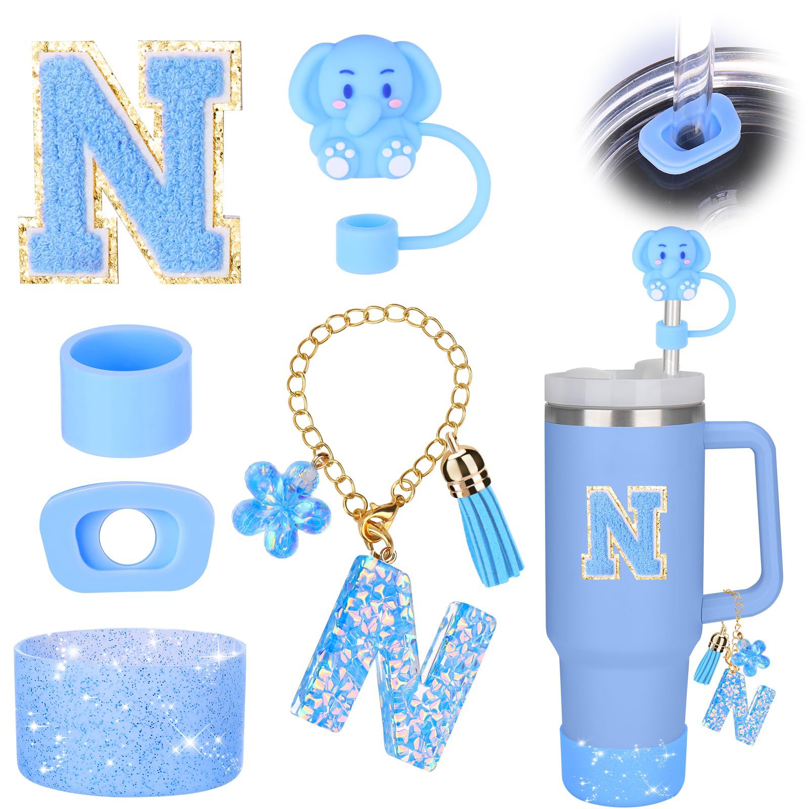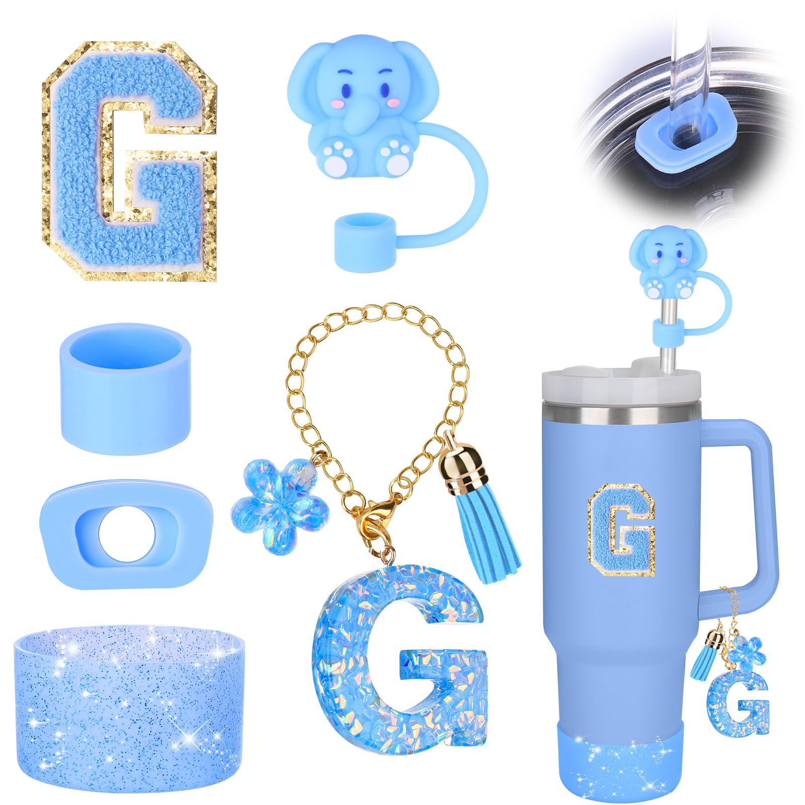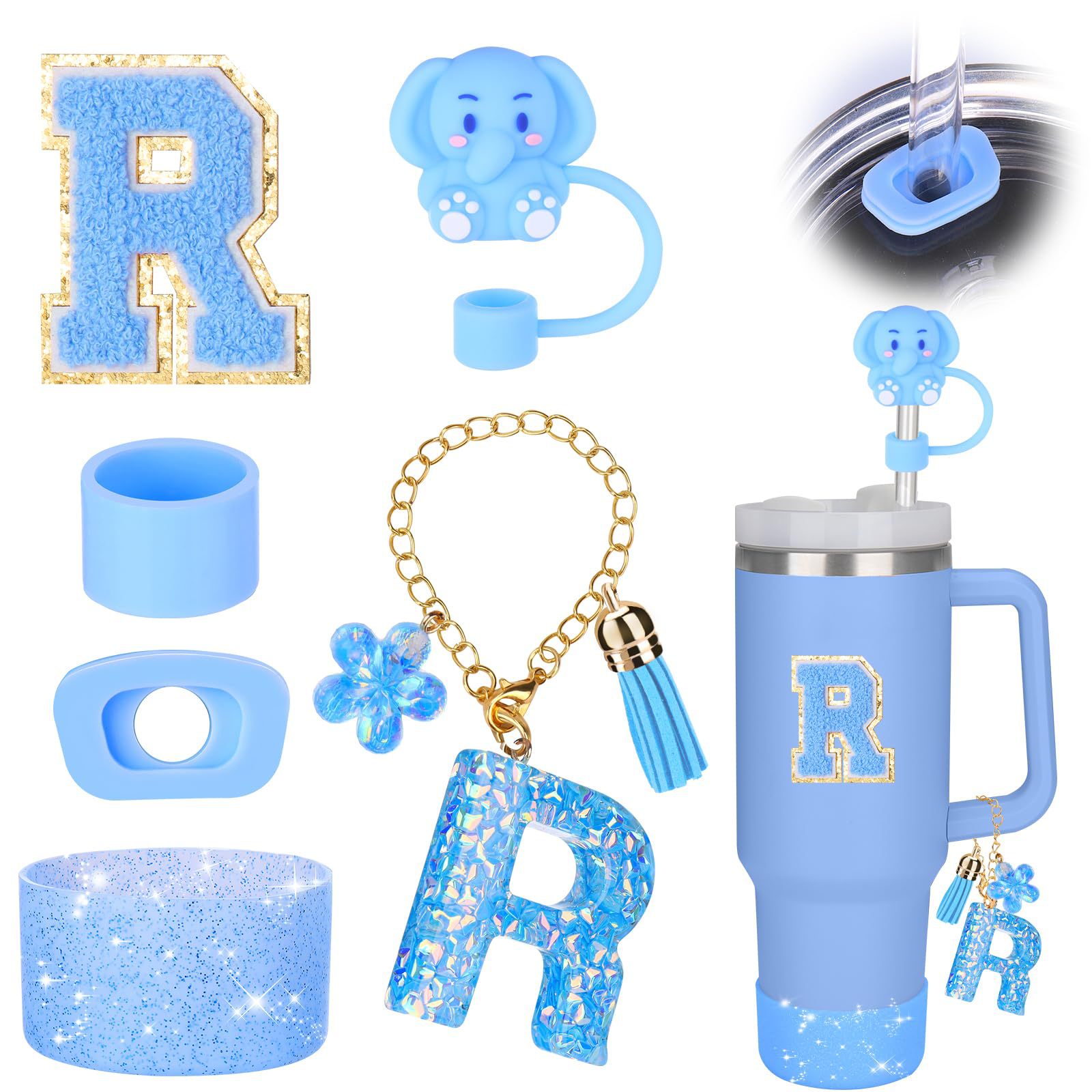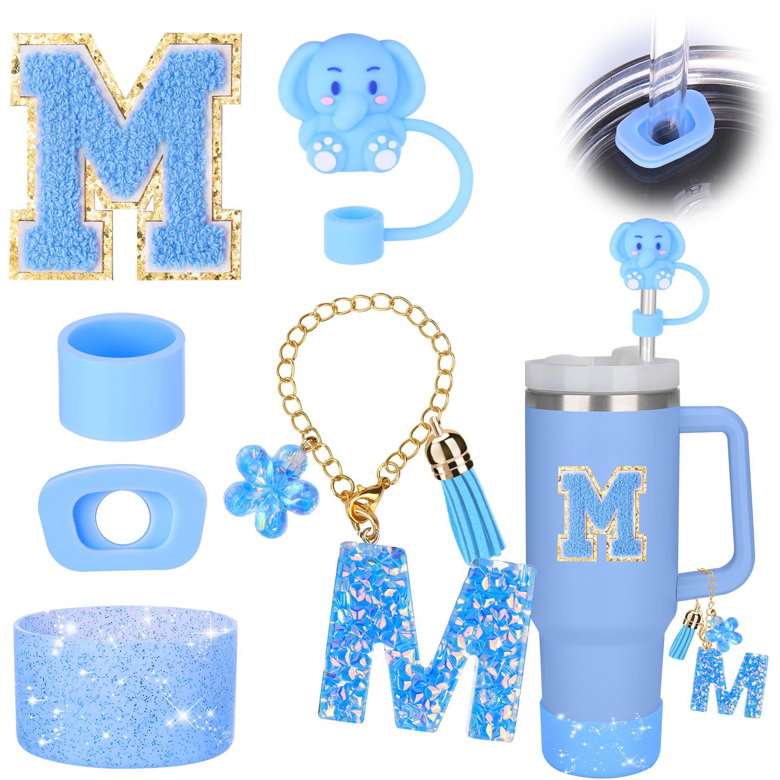 蓝色杯托树脂亮片花朵流苏杯链可爱吸管帽字母毛巾刺绣硅胶杯套