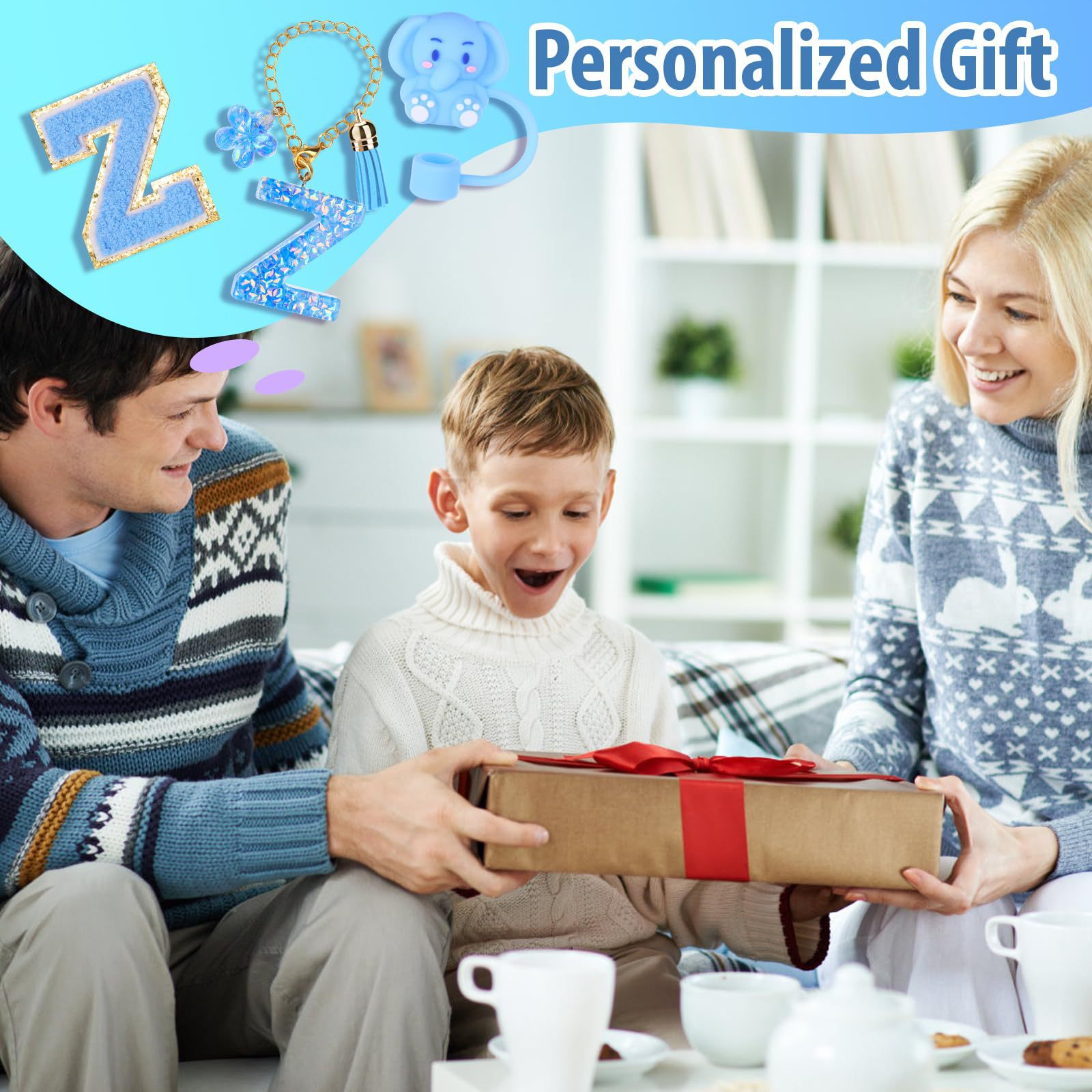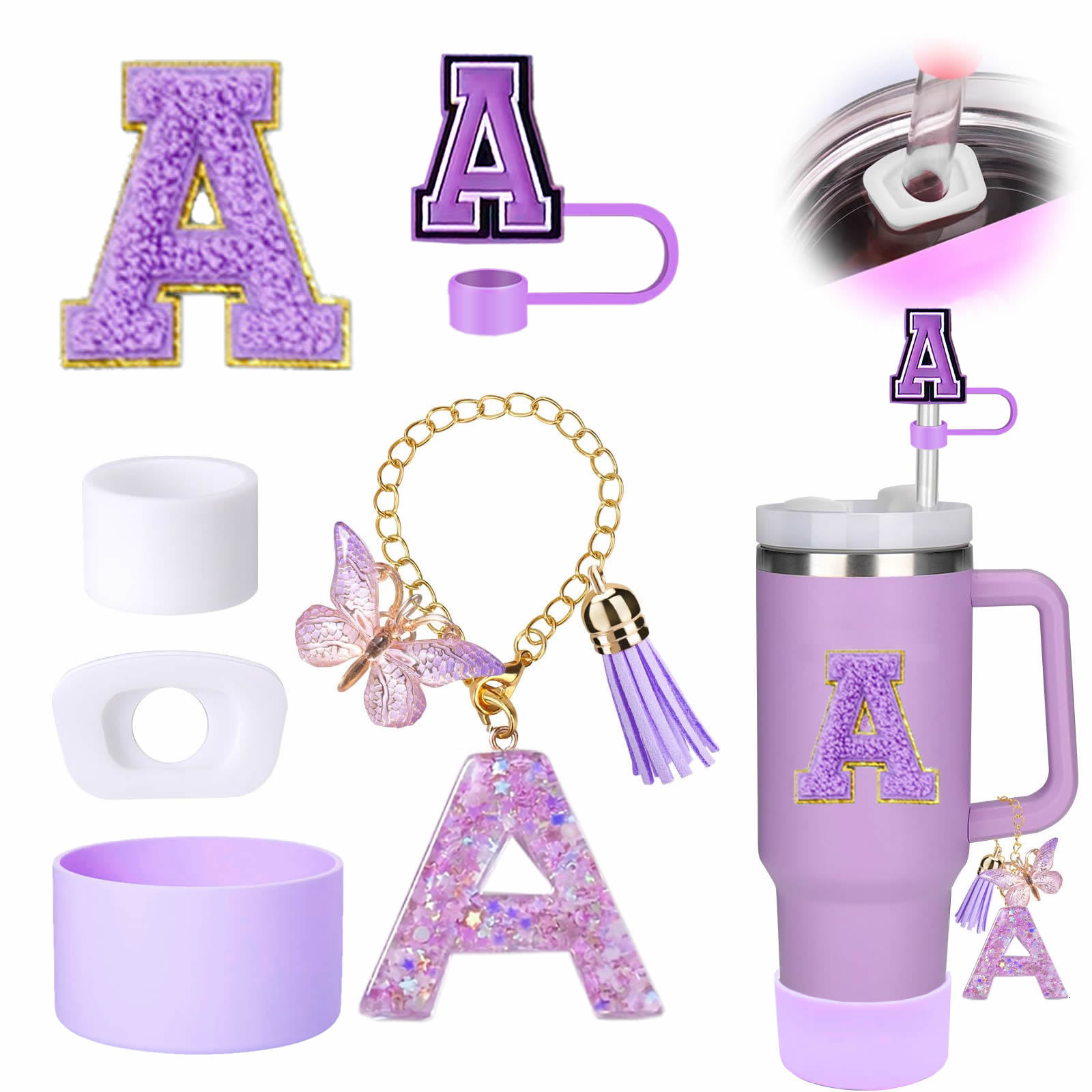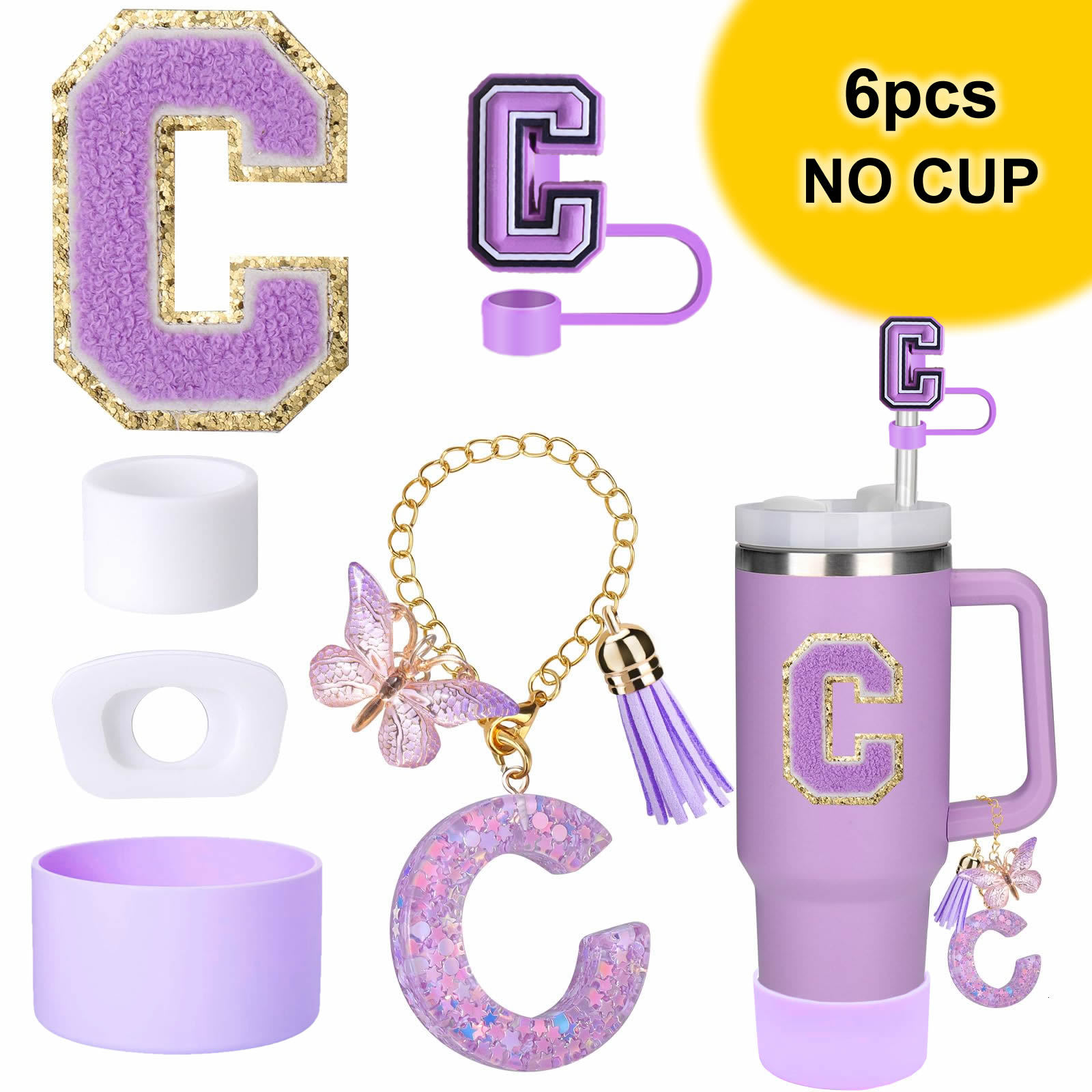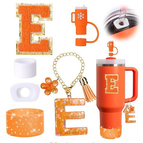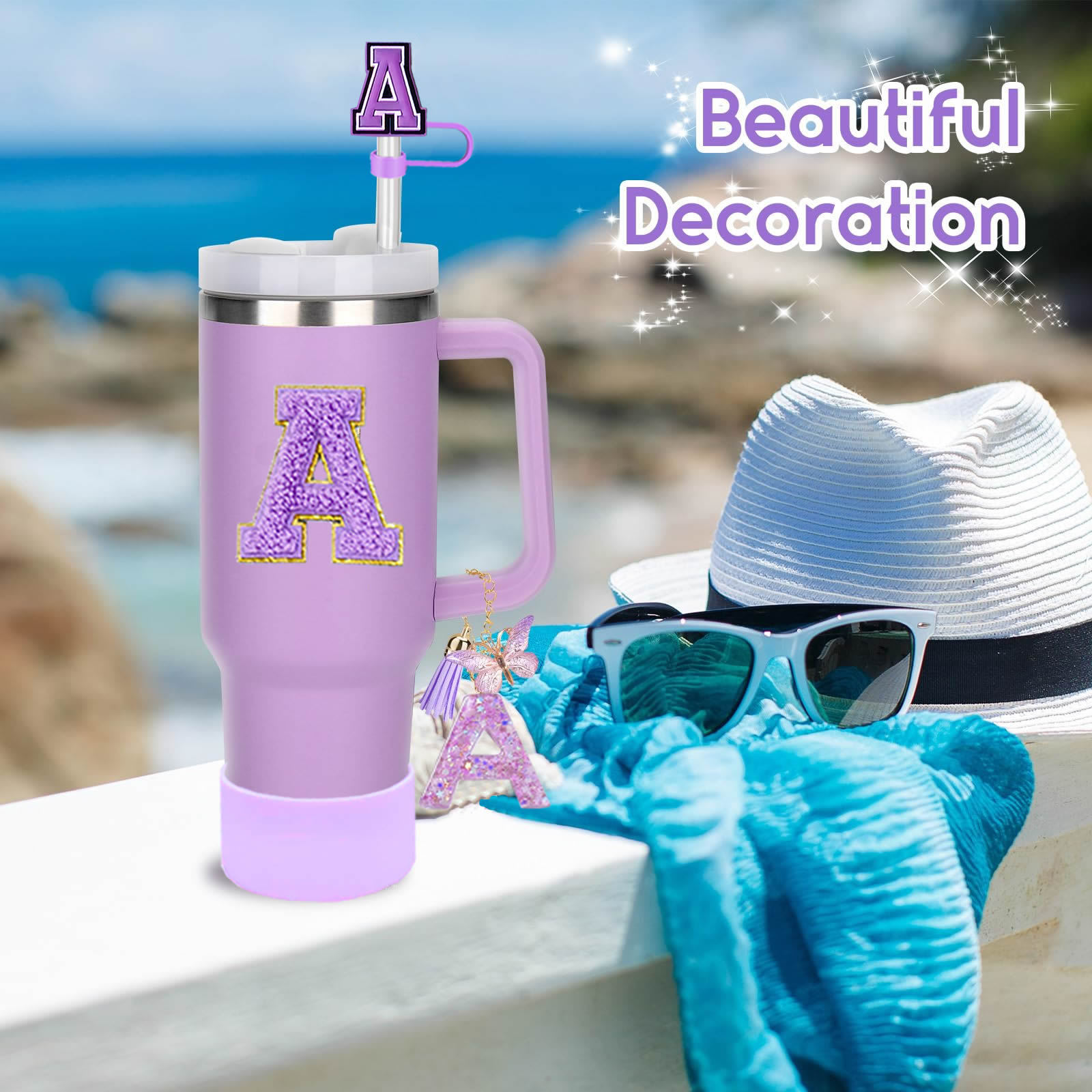蓝色杯托树脂亮片花朵流苏杯链可爱吸管帽字母毛巾刺绣硅胶杯套