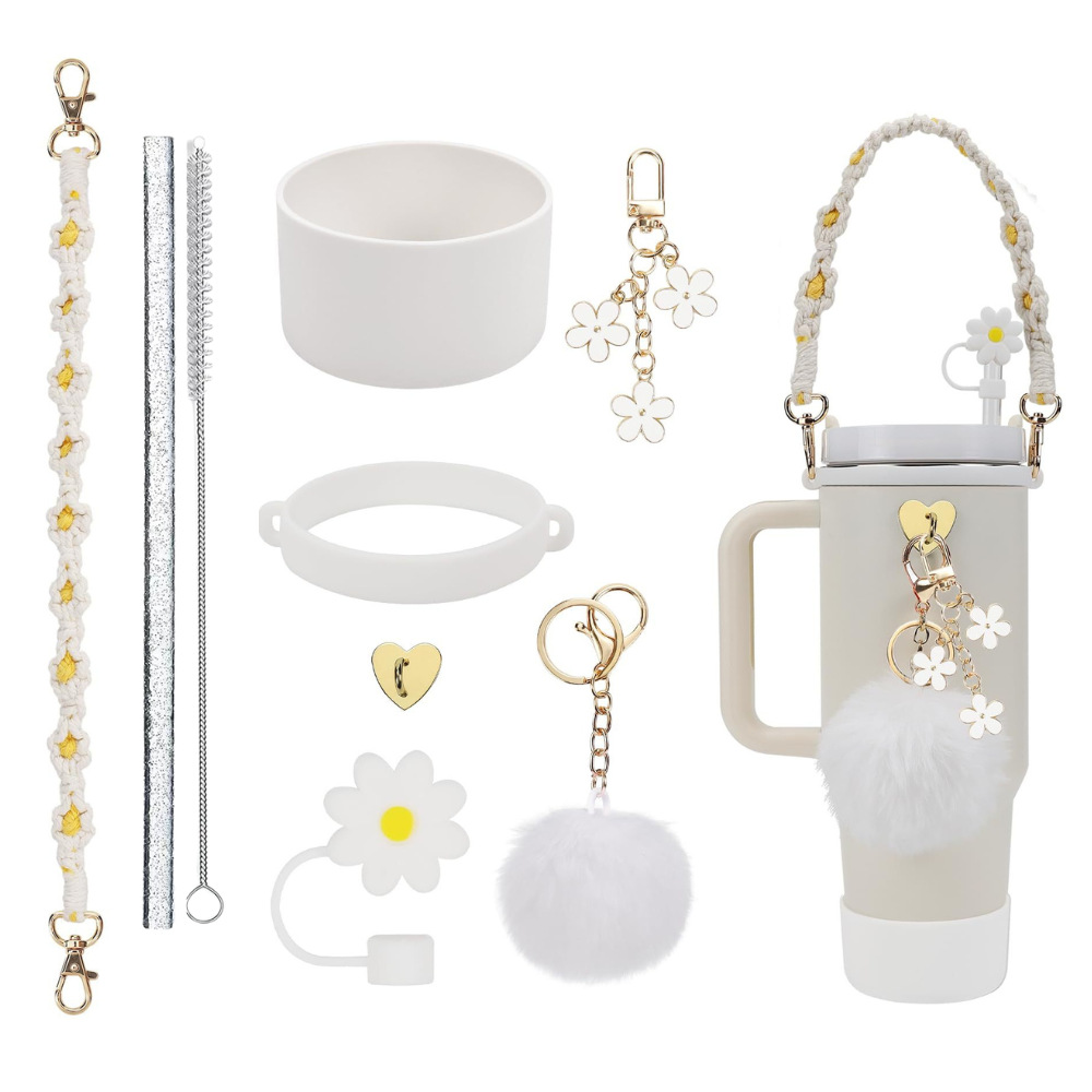 斯坦利杯彩色吸管配件手工杯链毛绒爱心花朵挂饰套装桃花结编织手