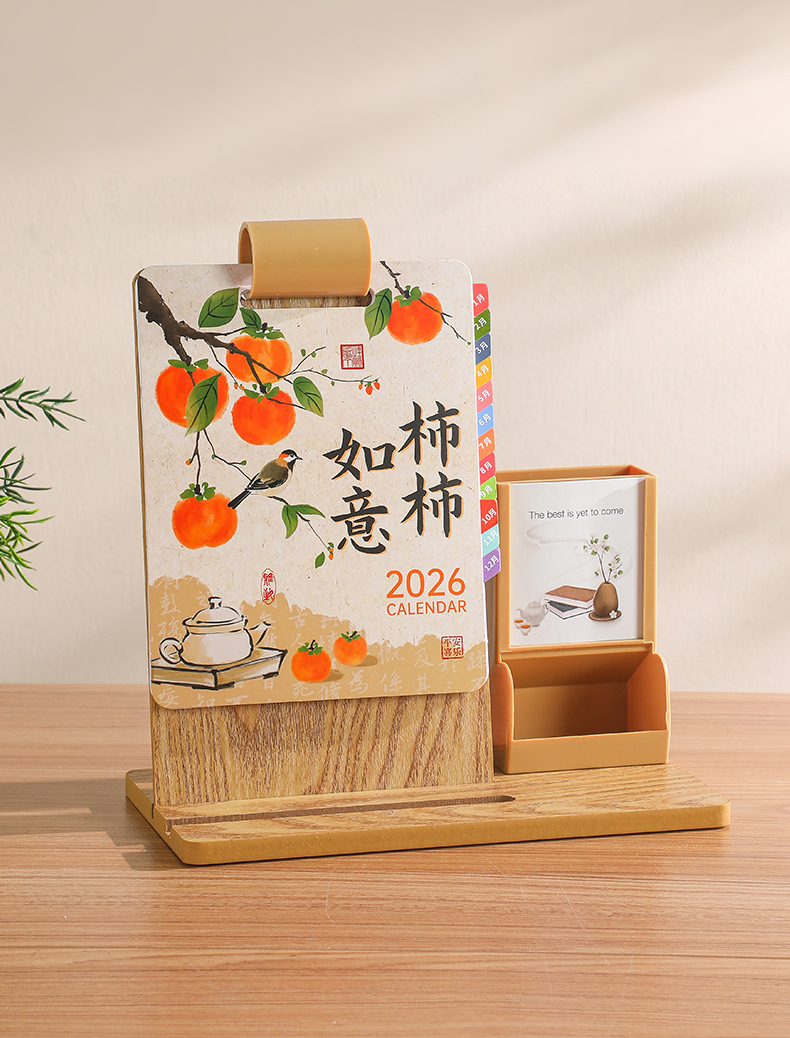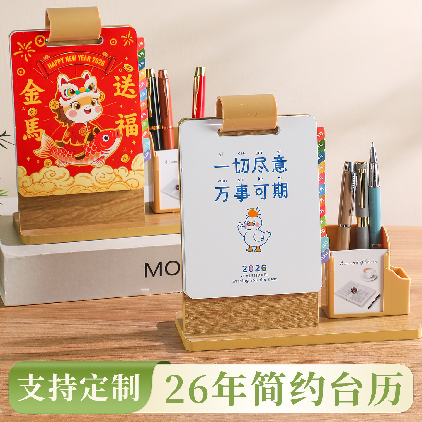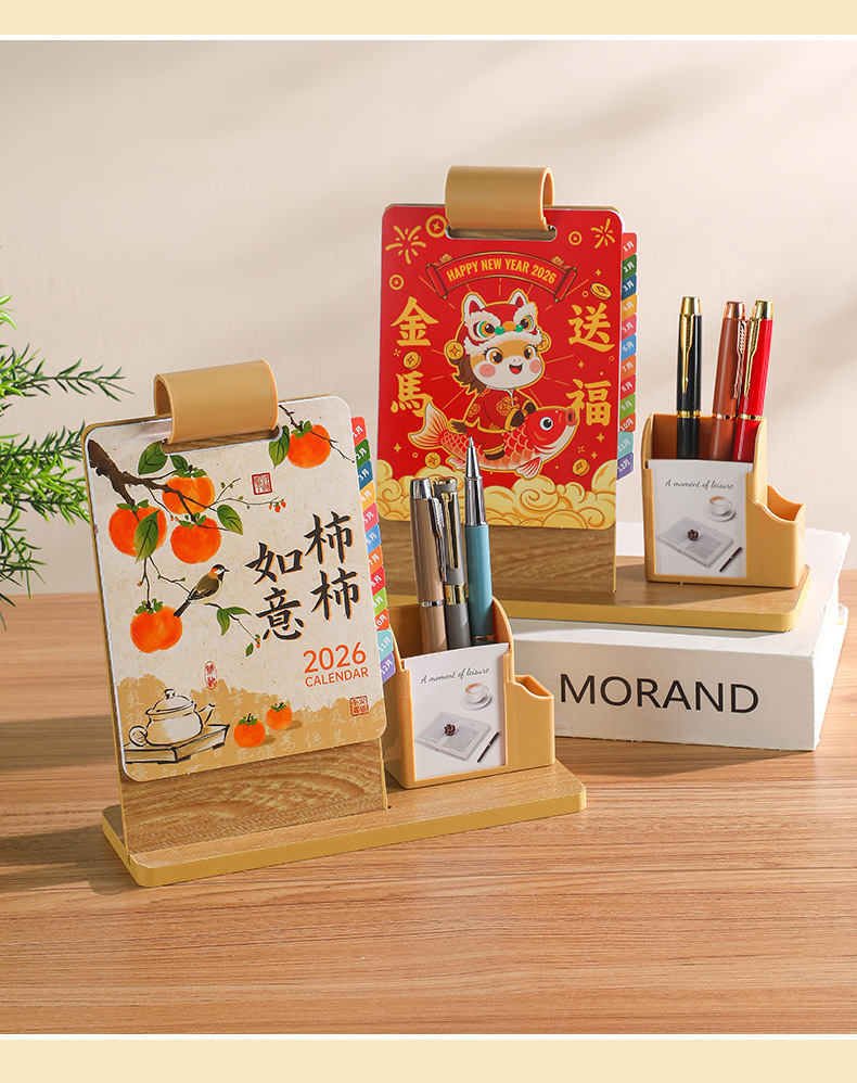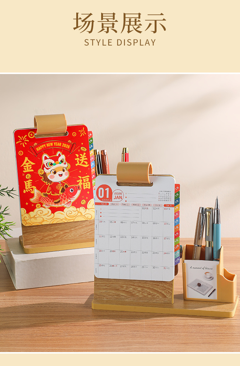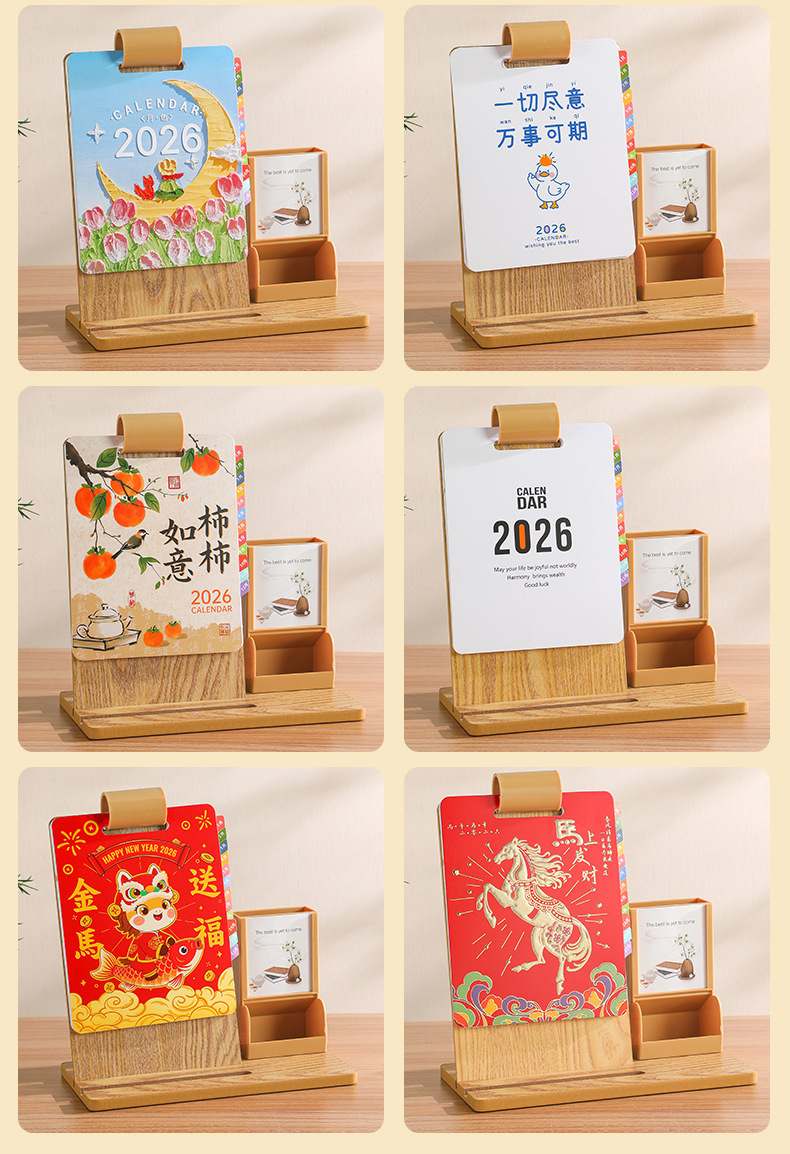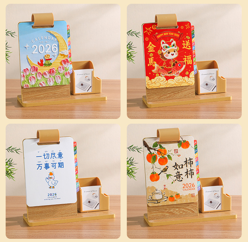 2026年新款台历定制创意桌面摆件蛇年企业logo木质笔筒办公日月历