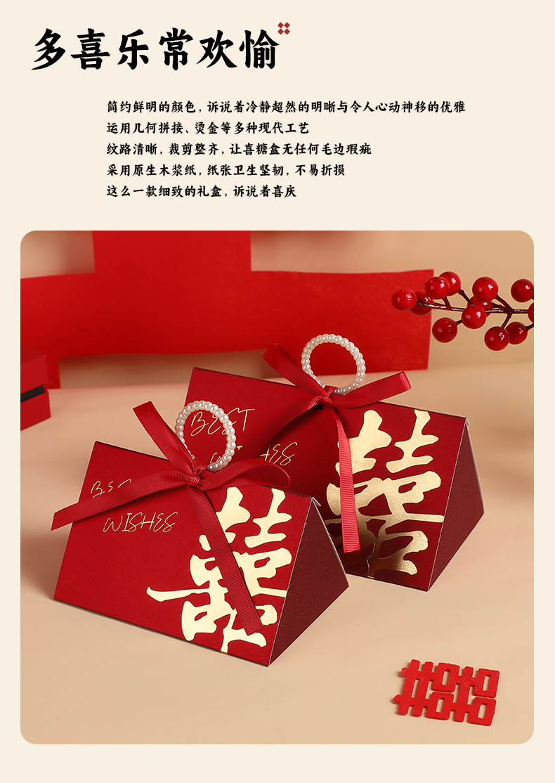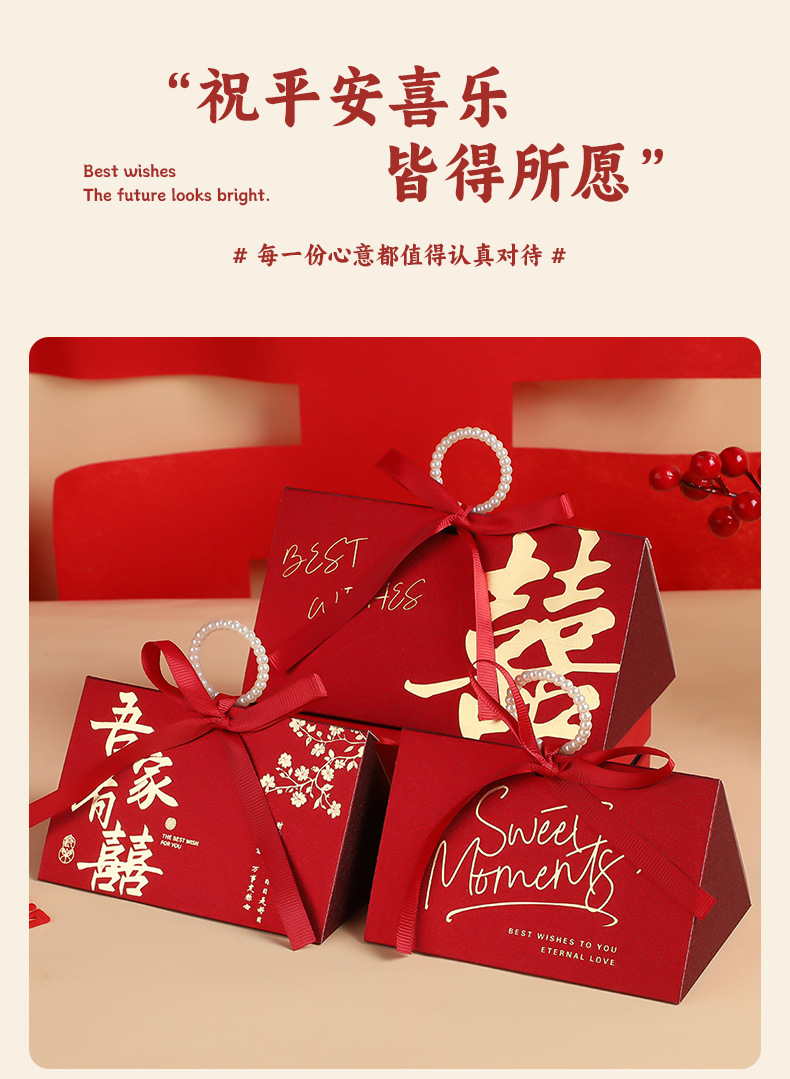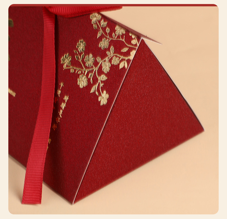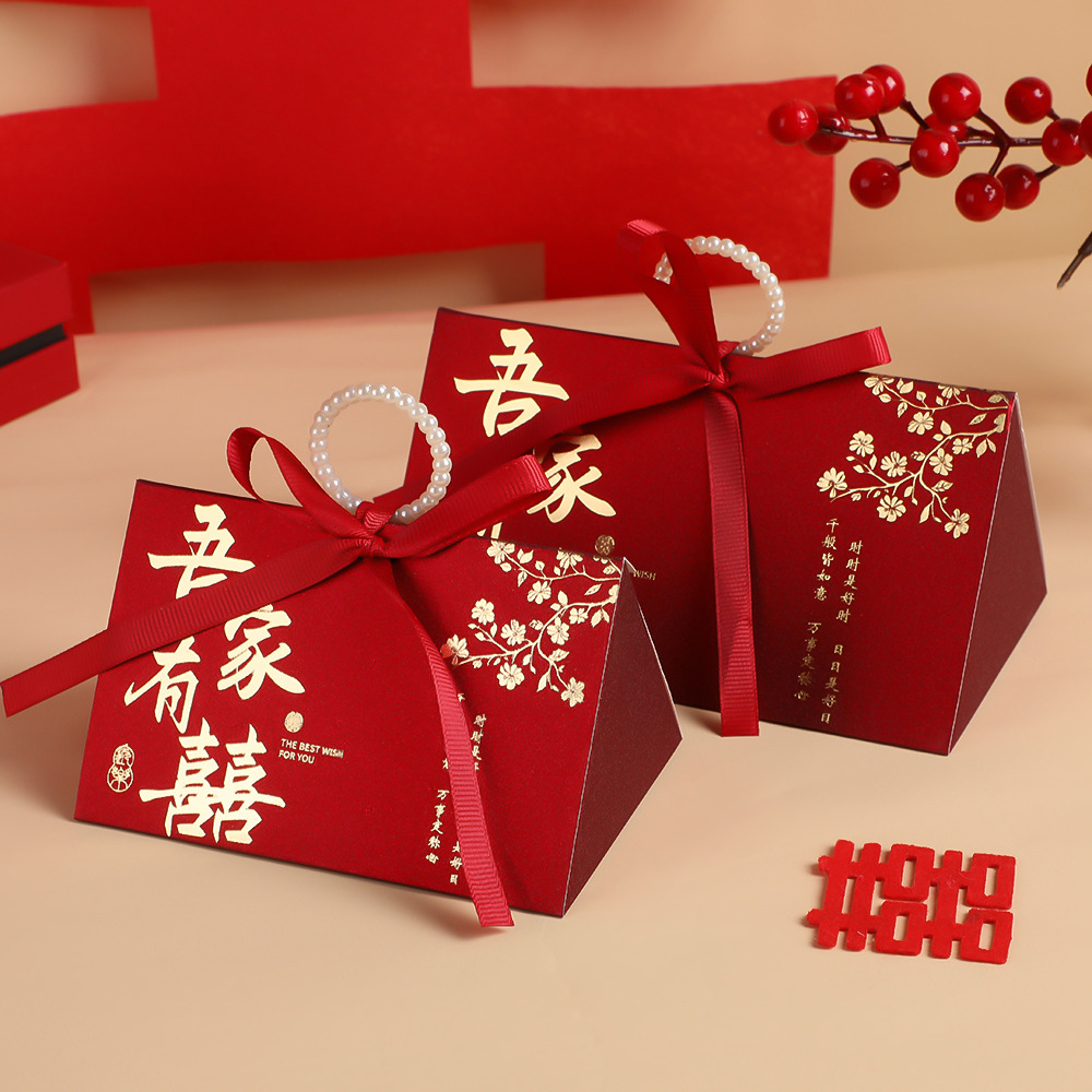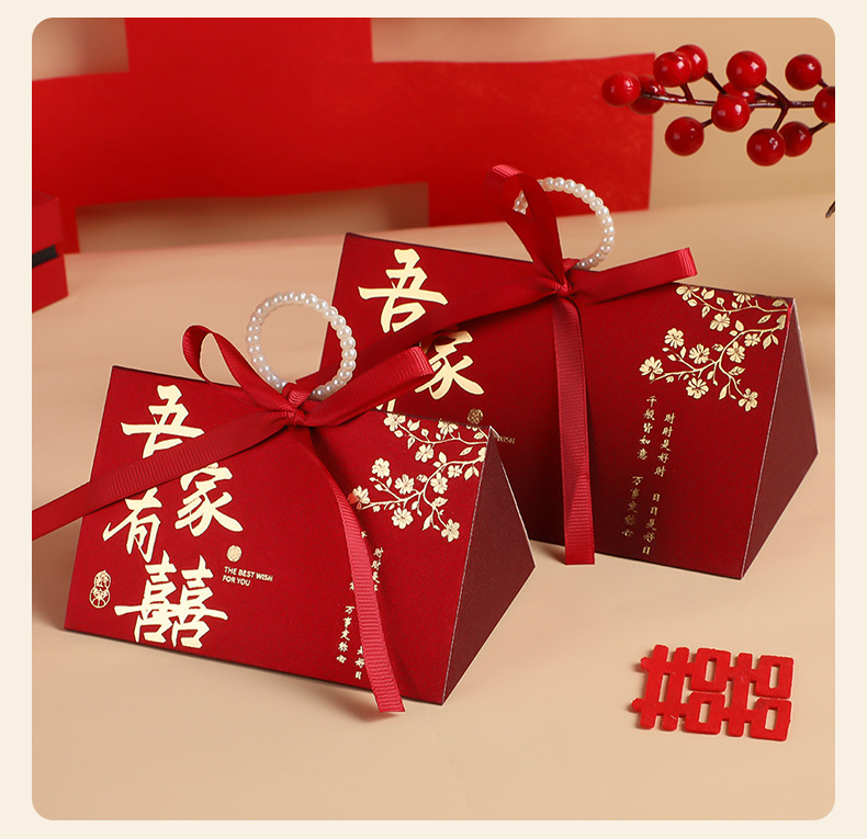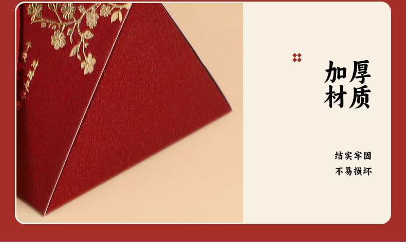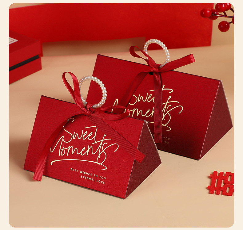 国风精美喜糖盒糖果包装盒三角形桌糖酒红磨砂烫金珍珠手提喜糖盒