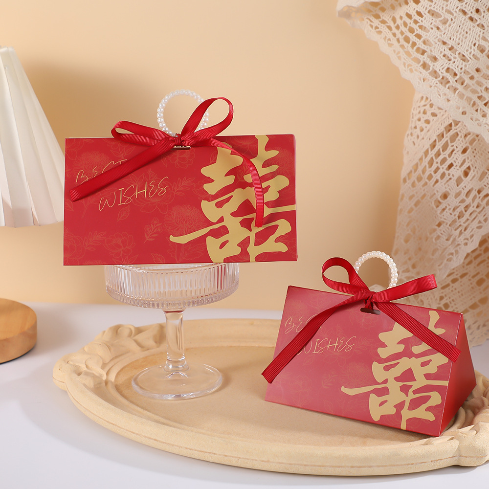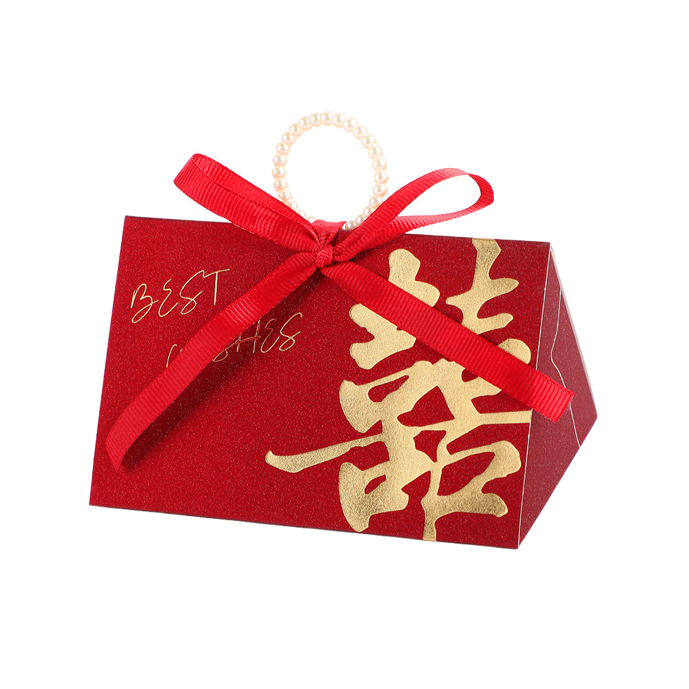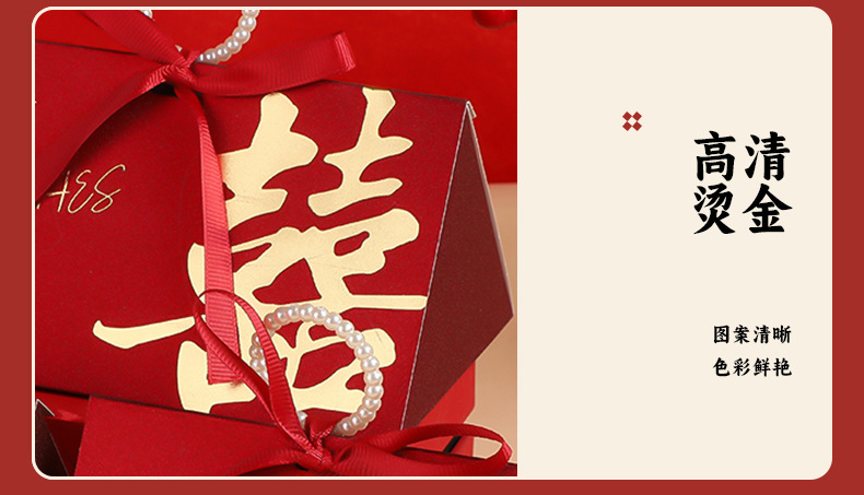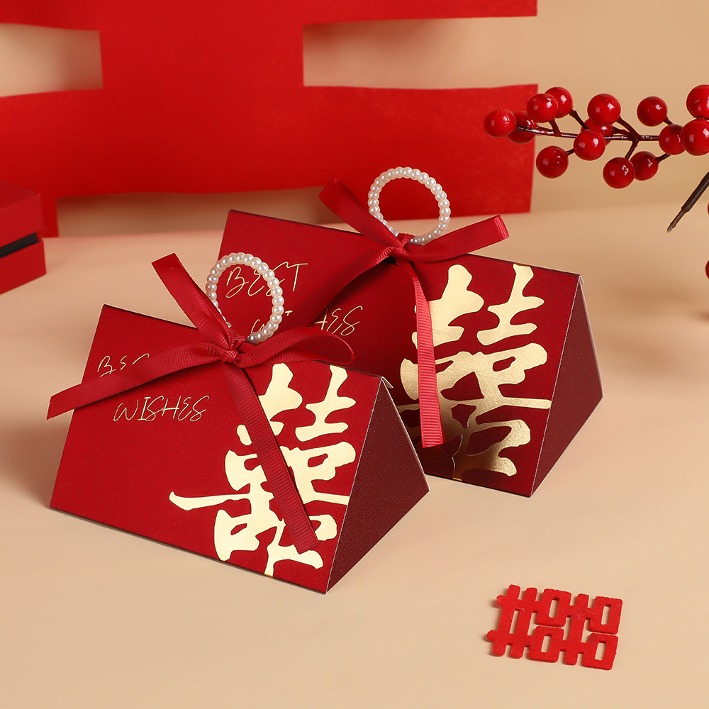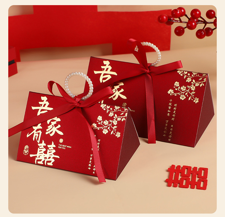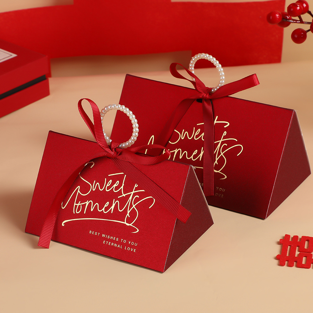 国风精美喜糖盒糖果包装盒三角形桌糖酒红磨砂烫金珍珠手提喜糖盒