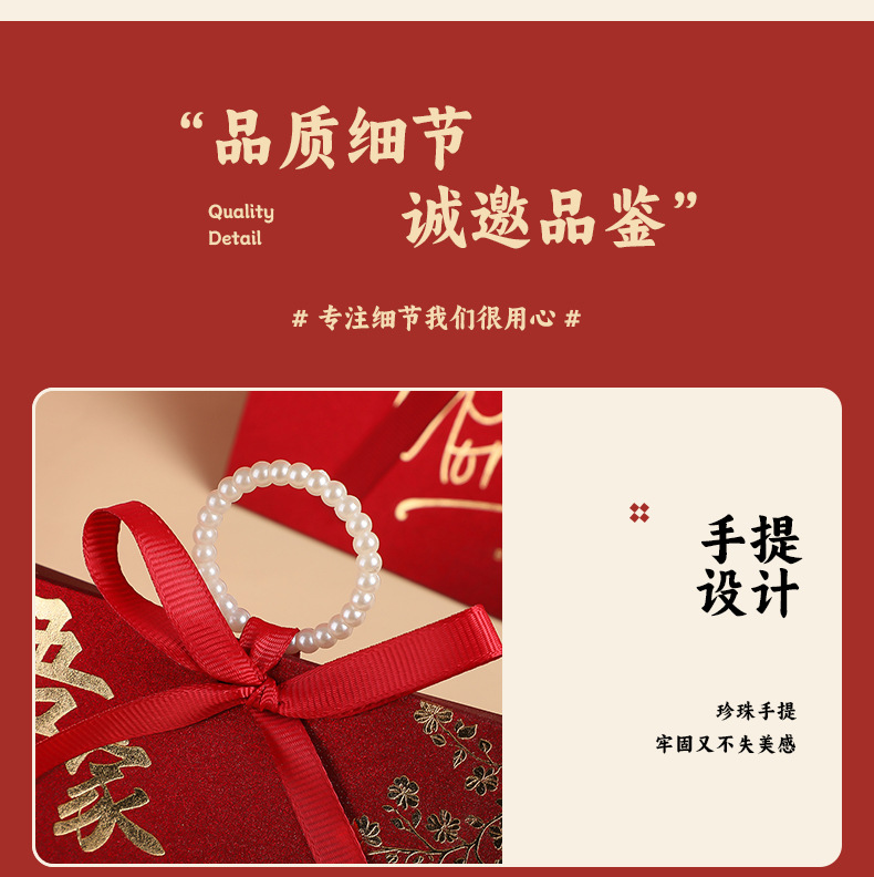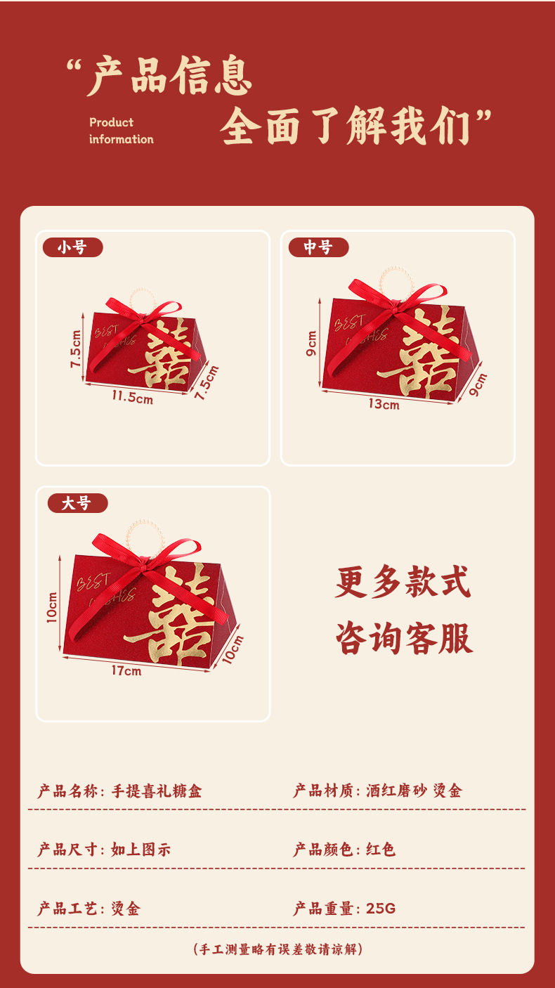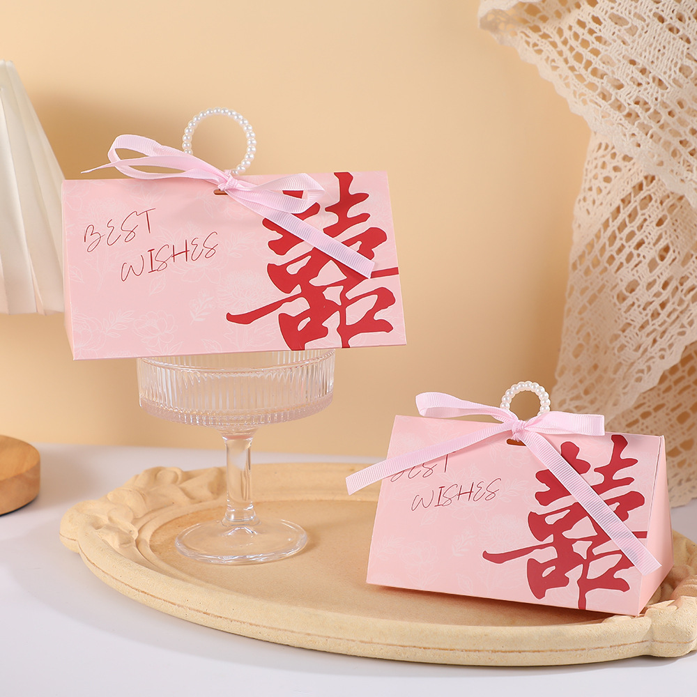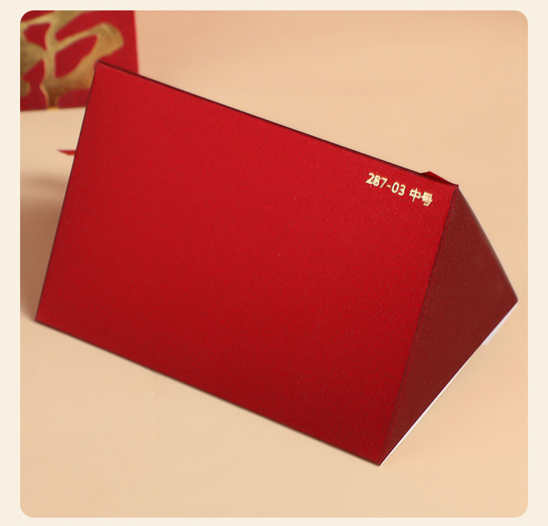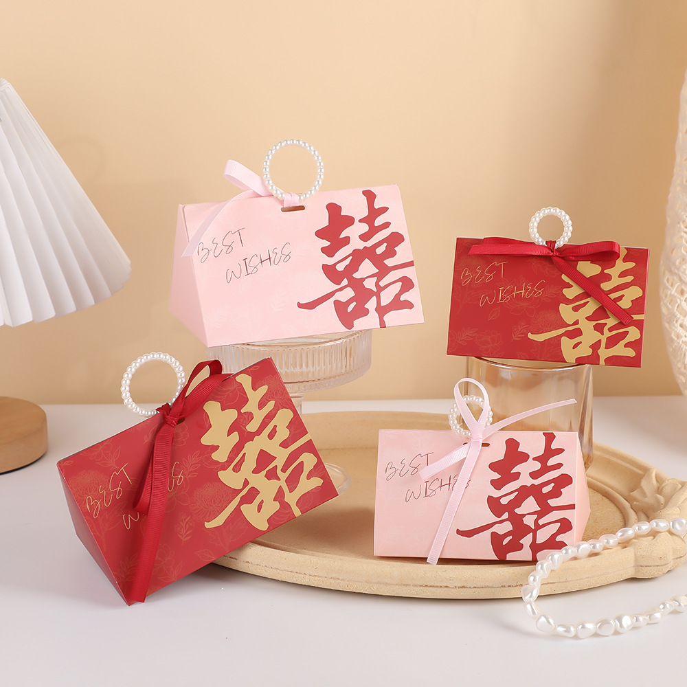 国风精美喜糖盒糖果包装盒三角形桌糖酒红磨砂烫金珍珠手提喜糖盒