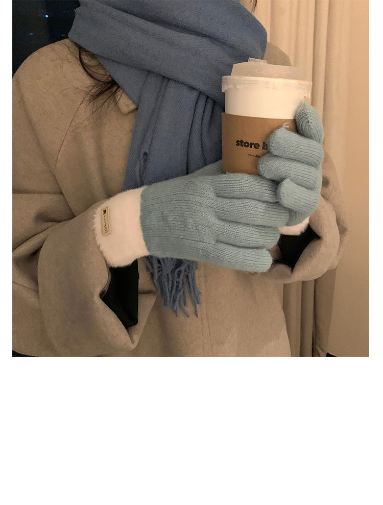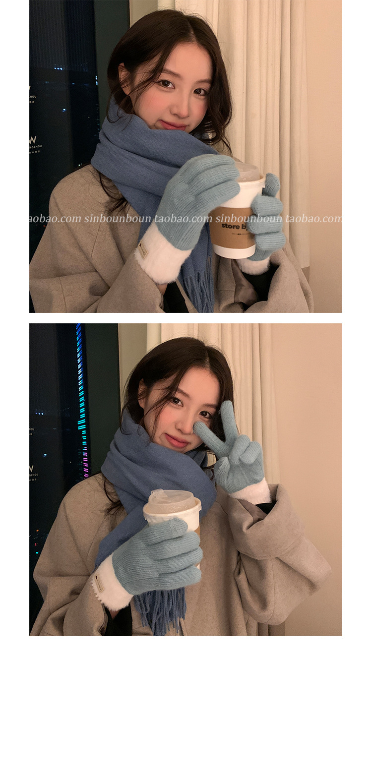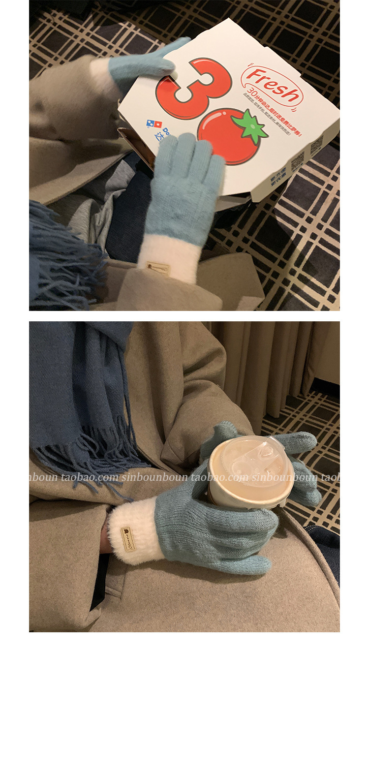 金泰韩版冬季加厚拼色手套保暖毛绒双层触屏分指针织女骑车学生
