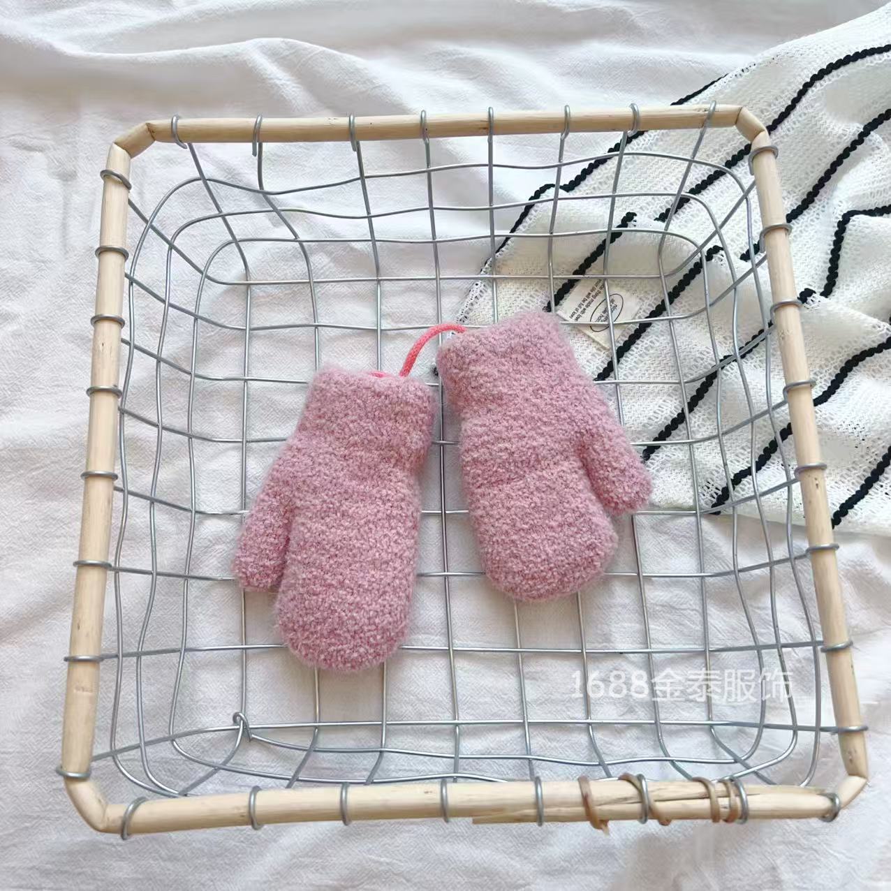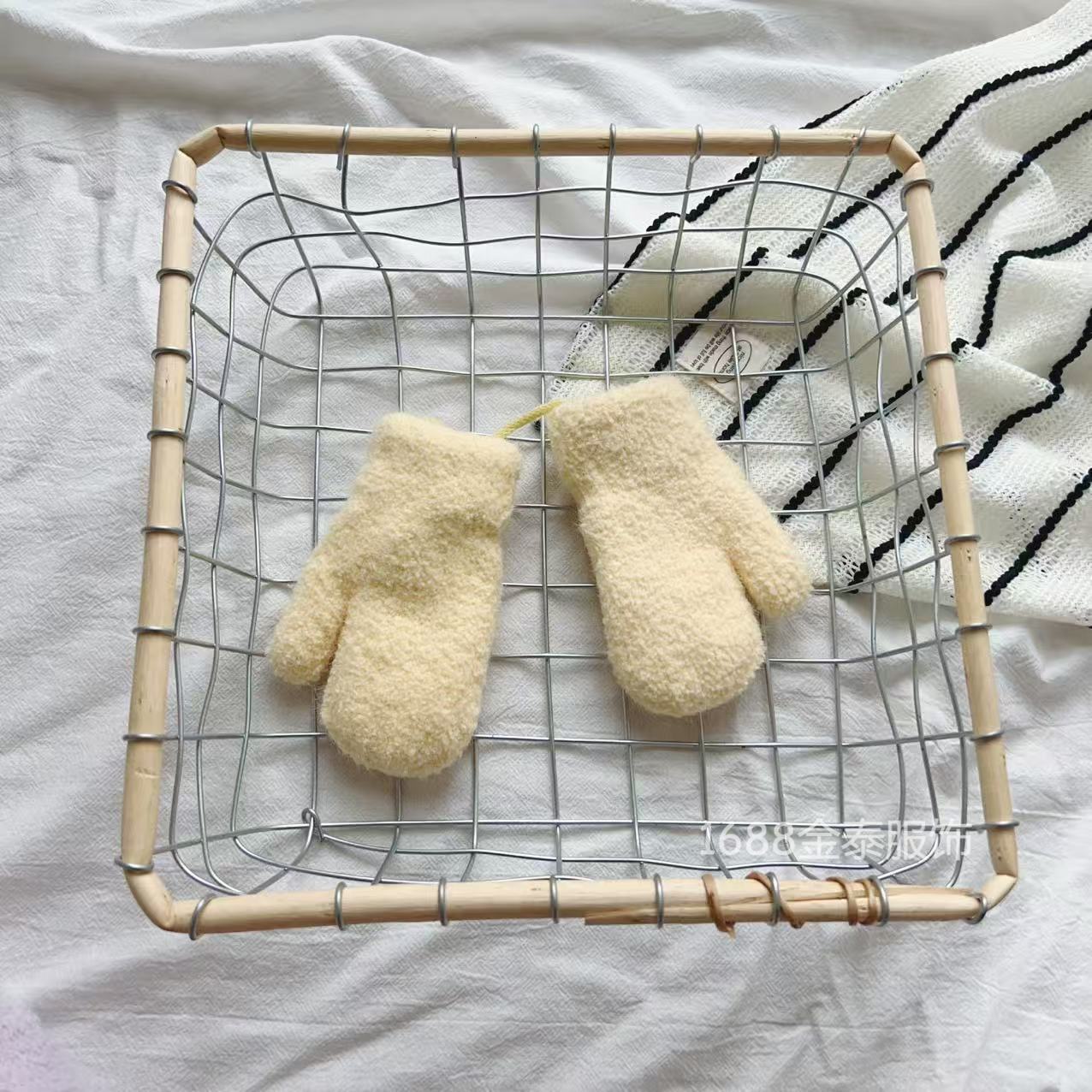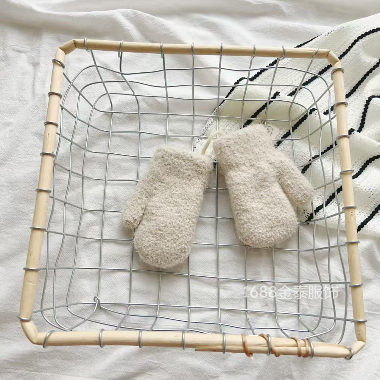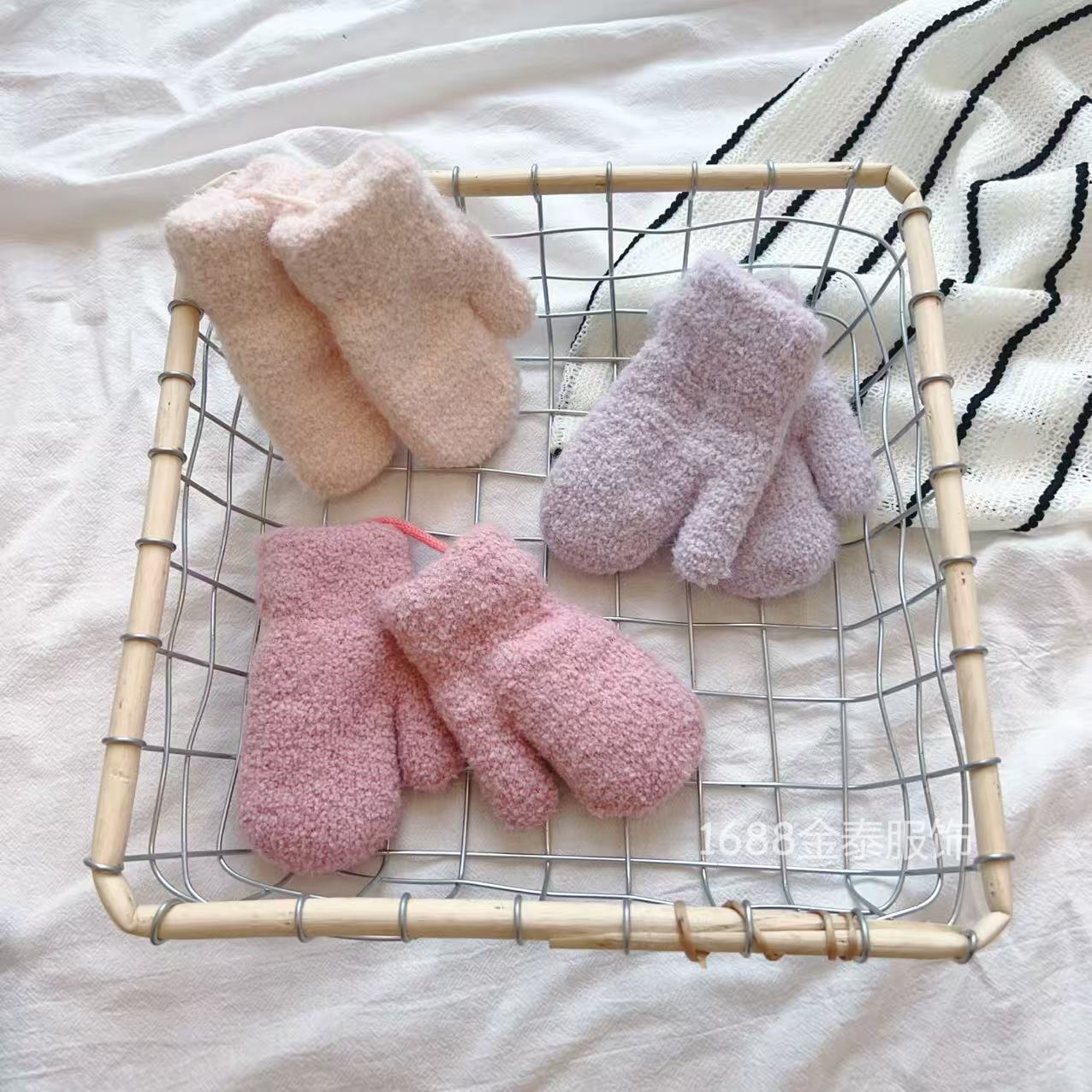 宝宝手套ins软糯糯~韩系简约纯色毛绒绒婴儿冬季加厚保暖挂脖包指