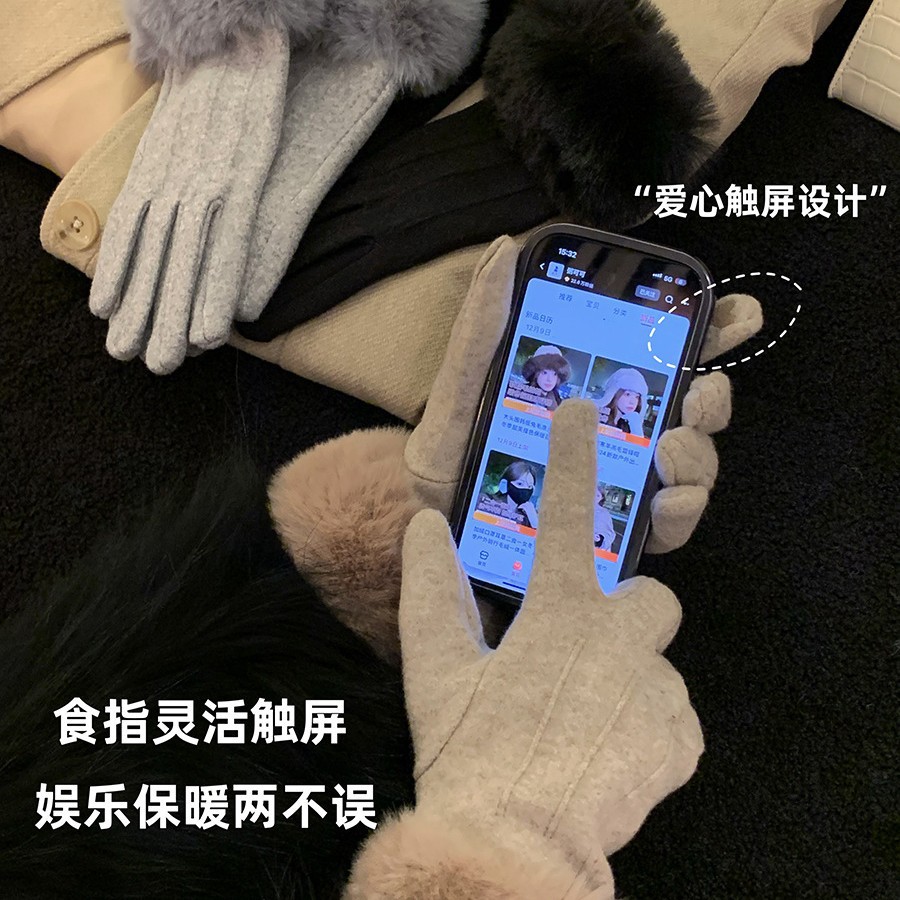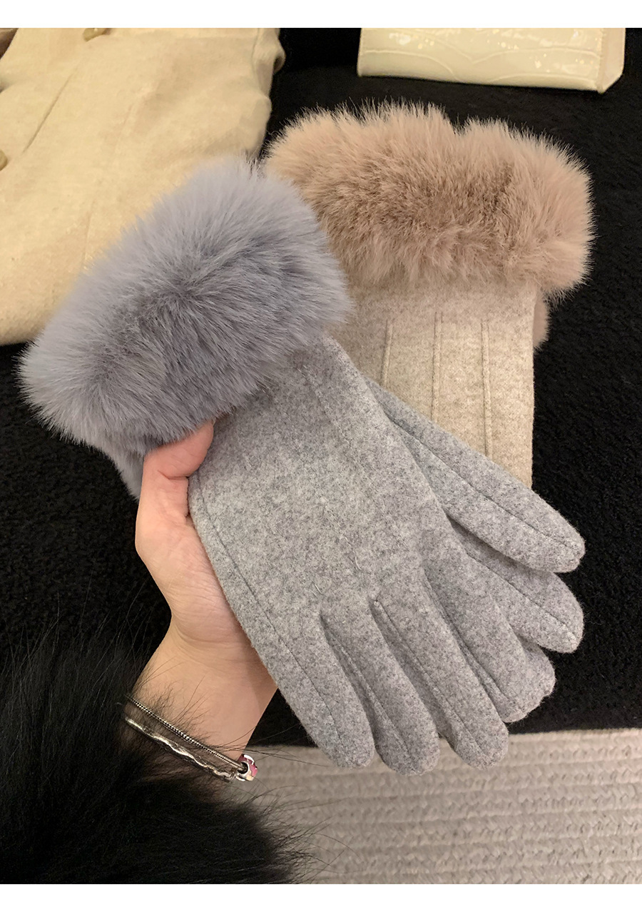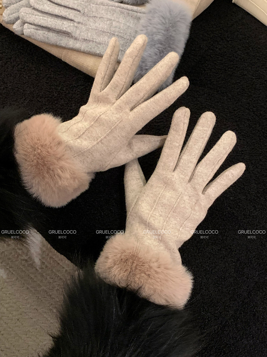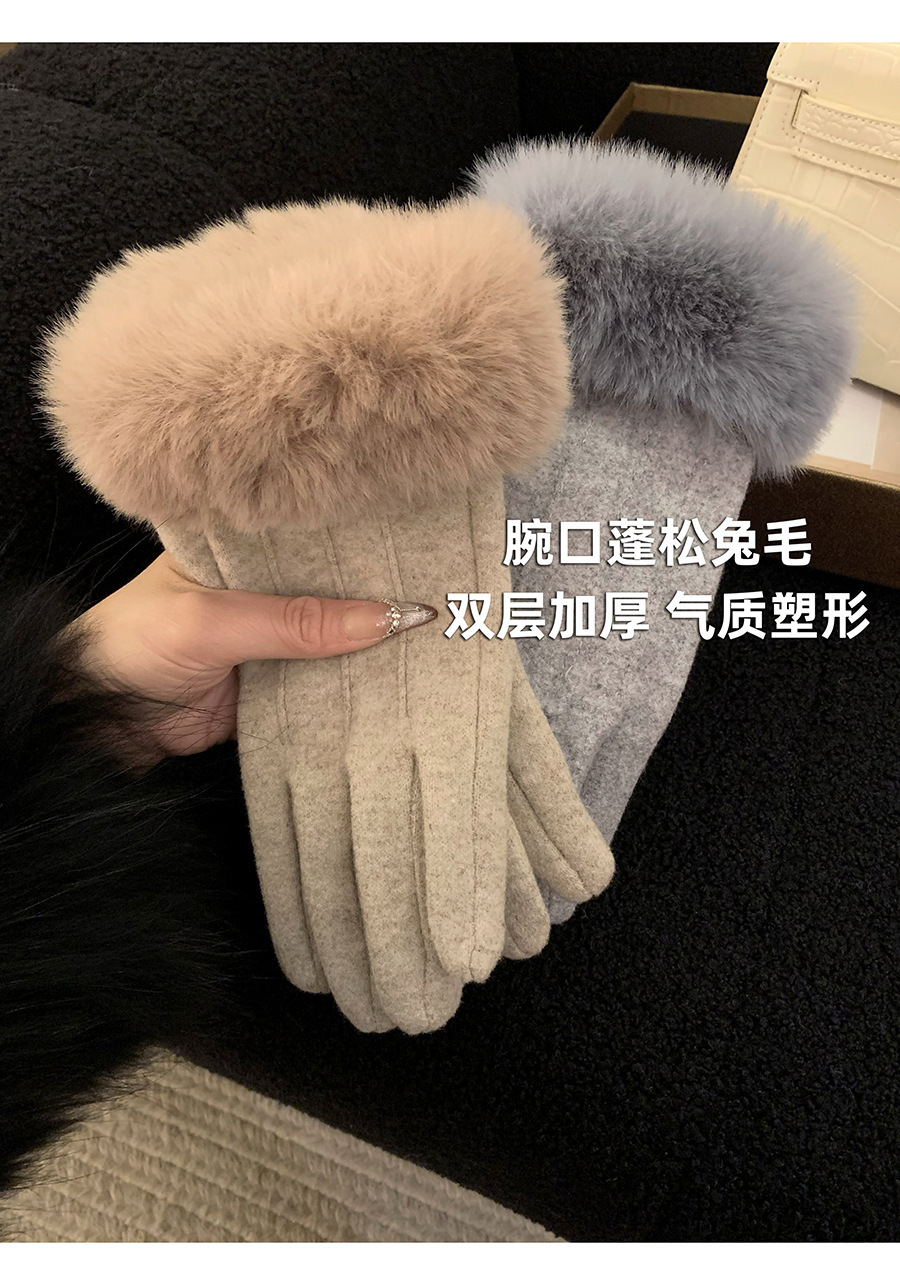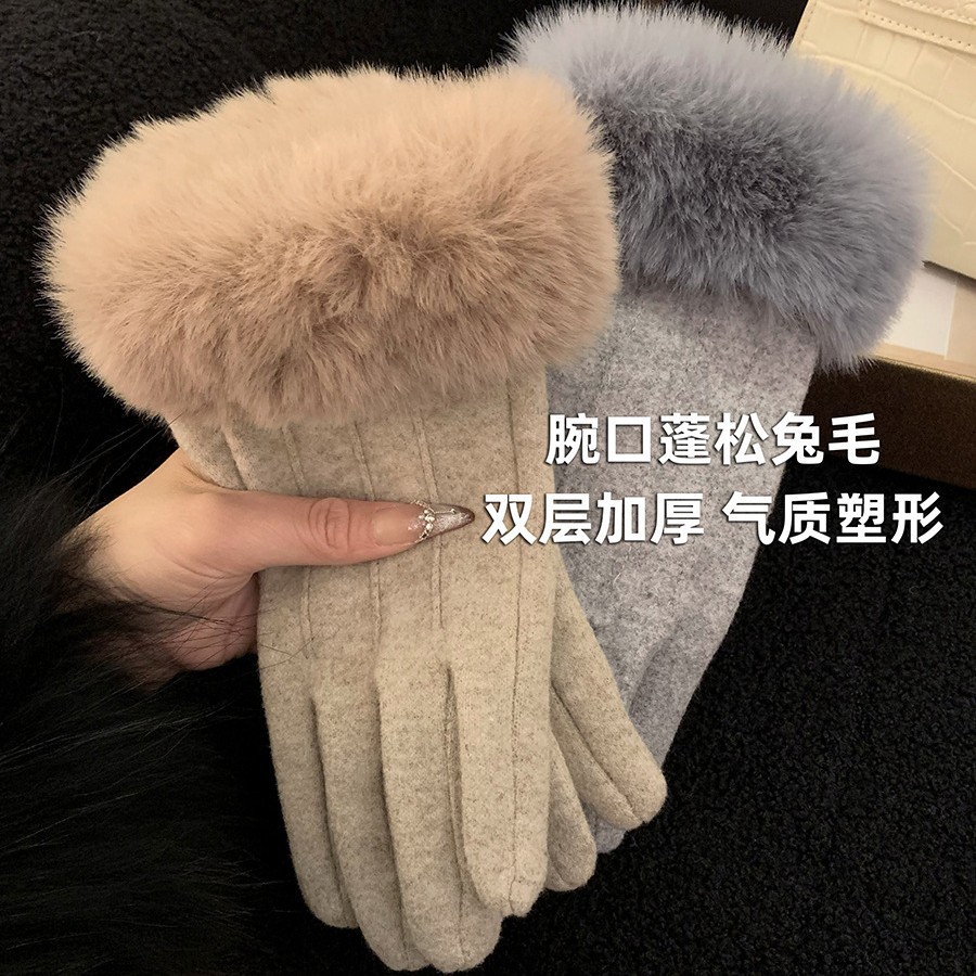 羊绒手套女冬季时尚感兔毛加绒加厚保暖防寒开车骑行可触屏浅卡其