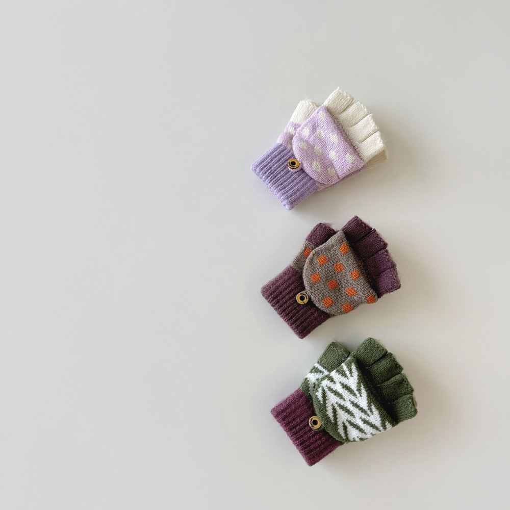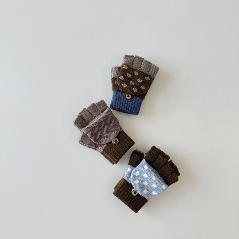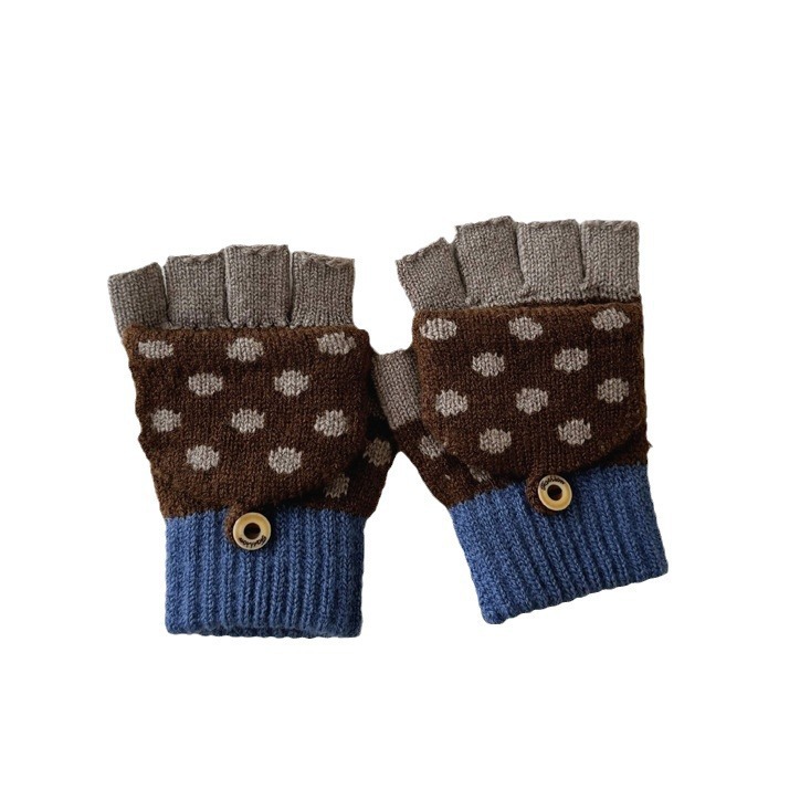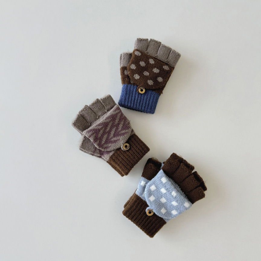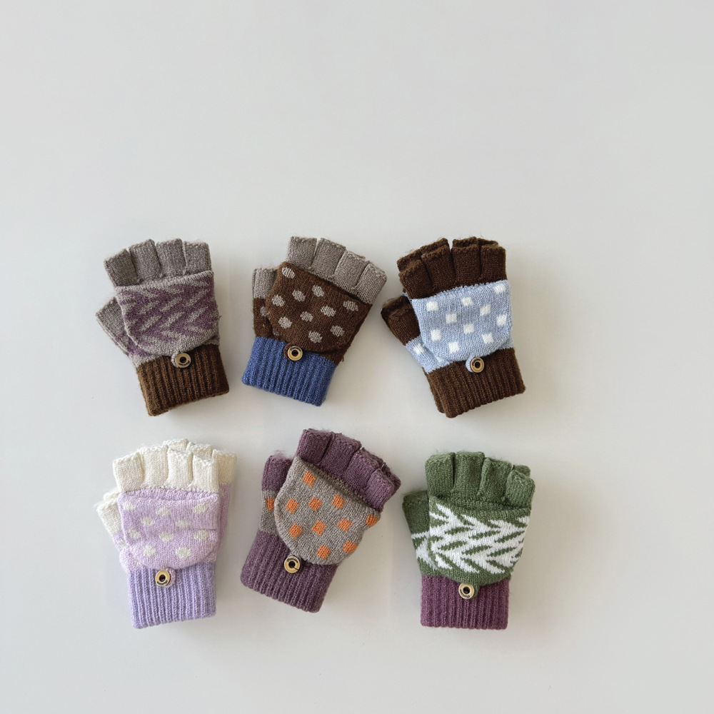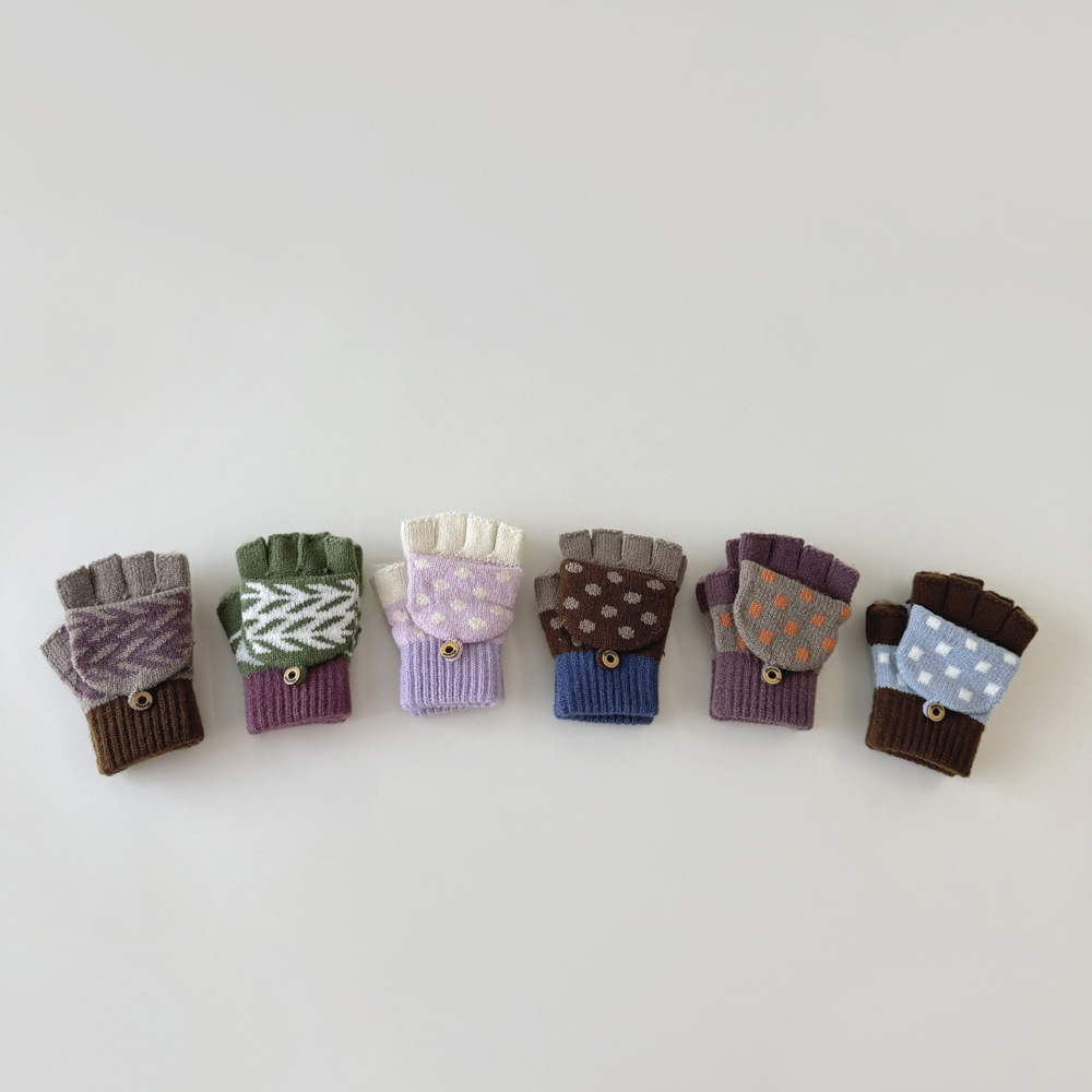 3-8岁儿童手套秋冬季半截韩版女孩写字翻盖男童保暖半指卡其树叶