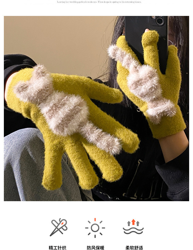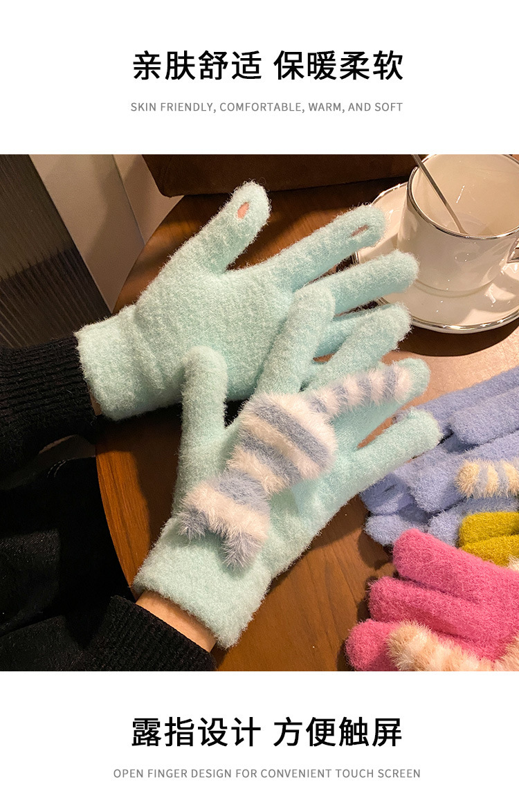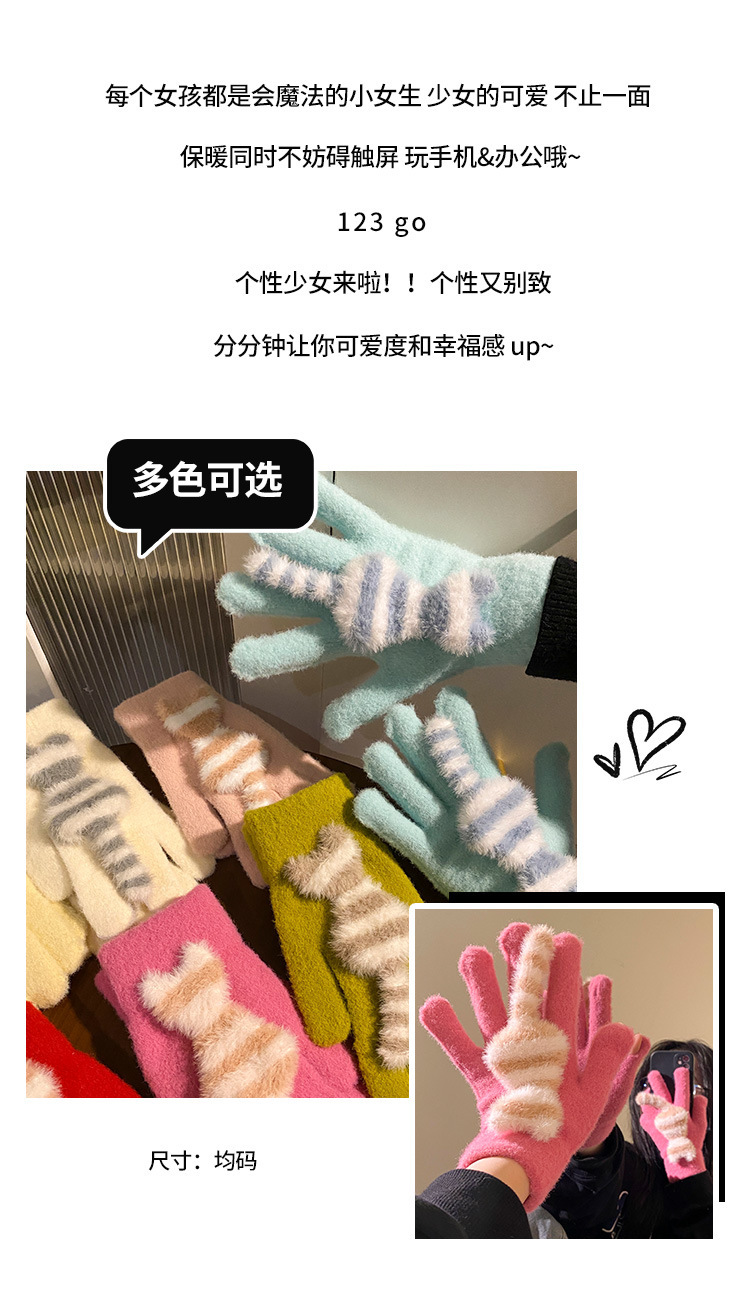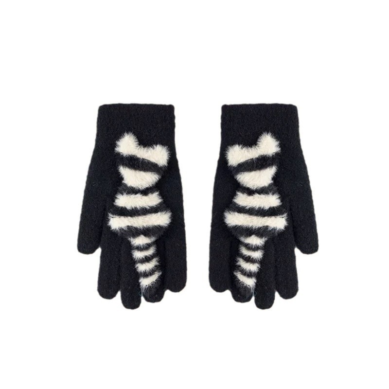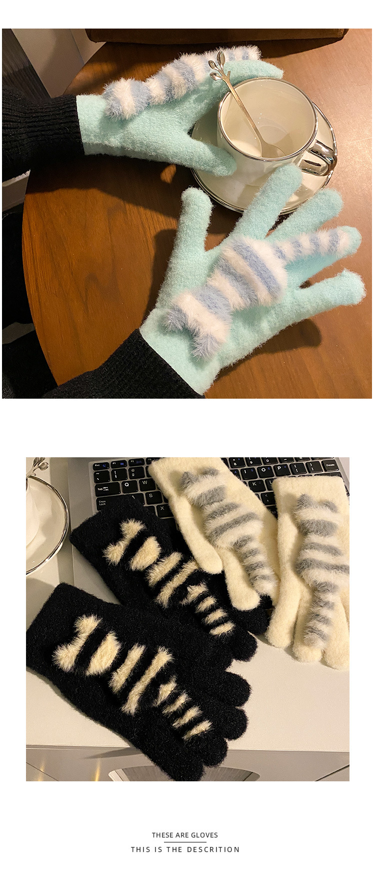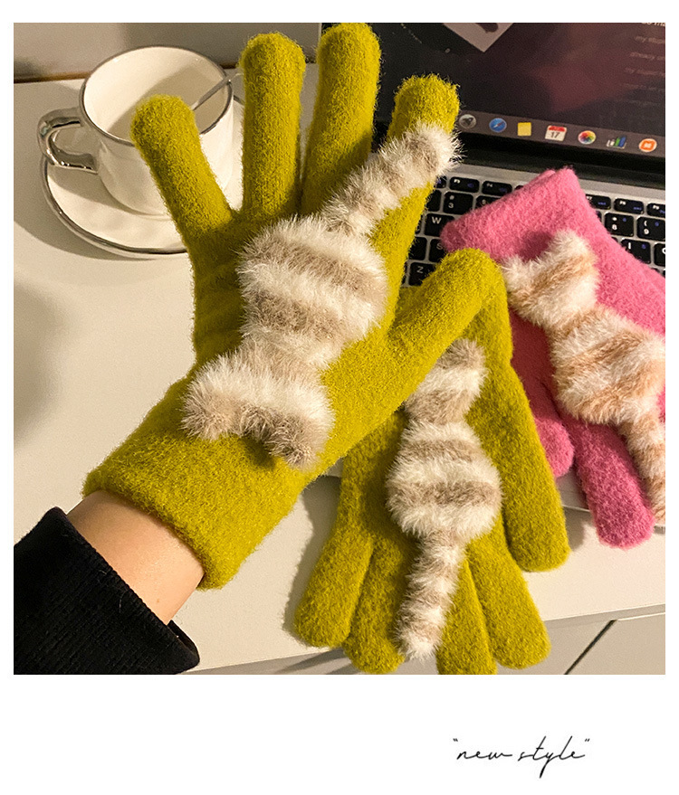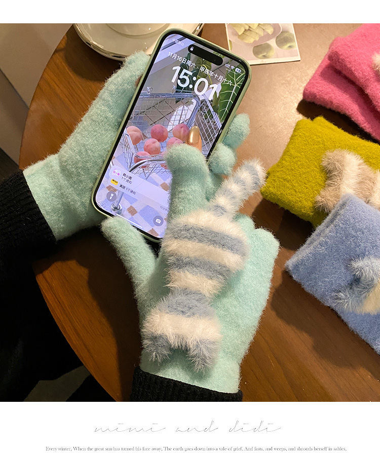 可爱条纹猫咪分指针织毛线手套女2024年冬季加厚保暖防寒学生骑行