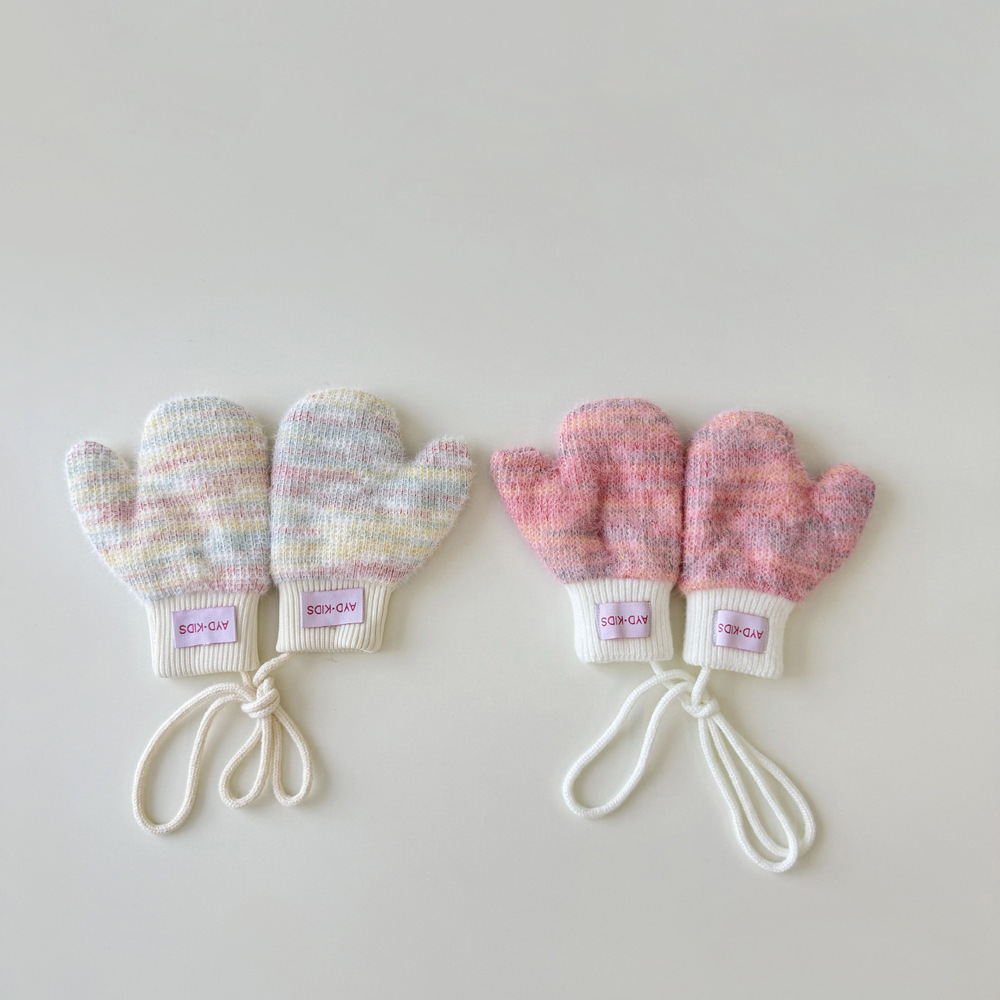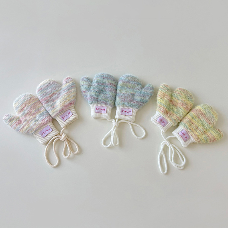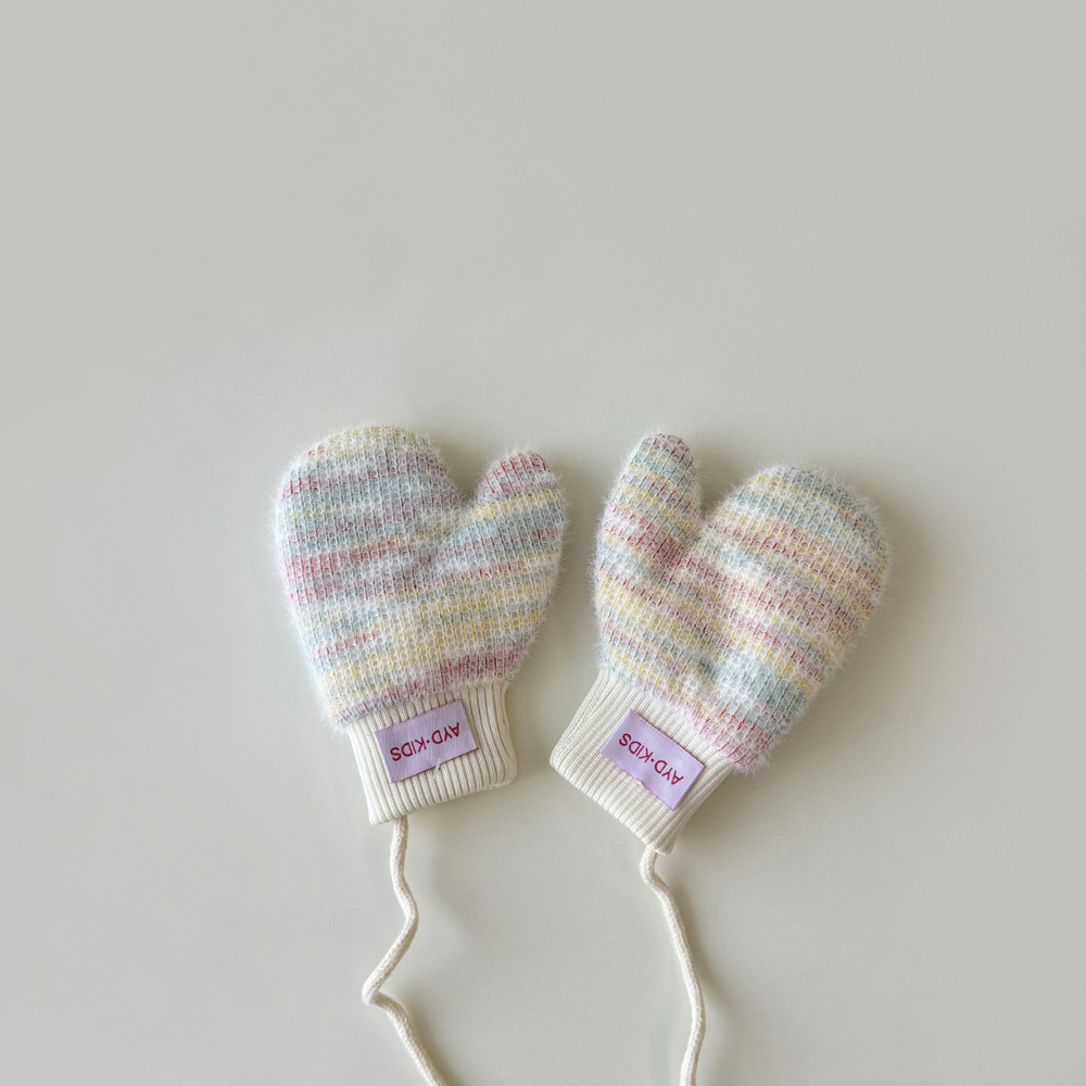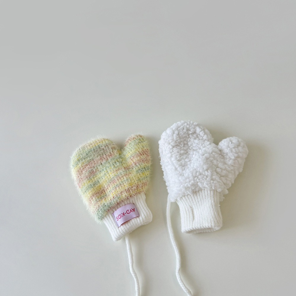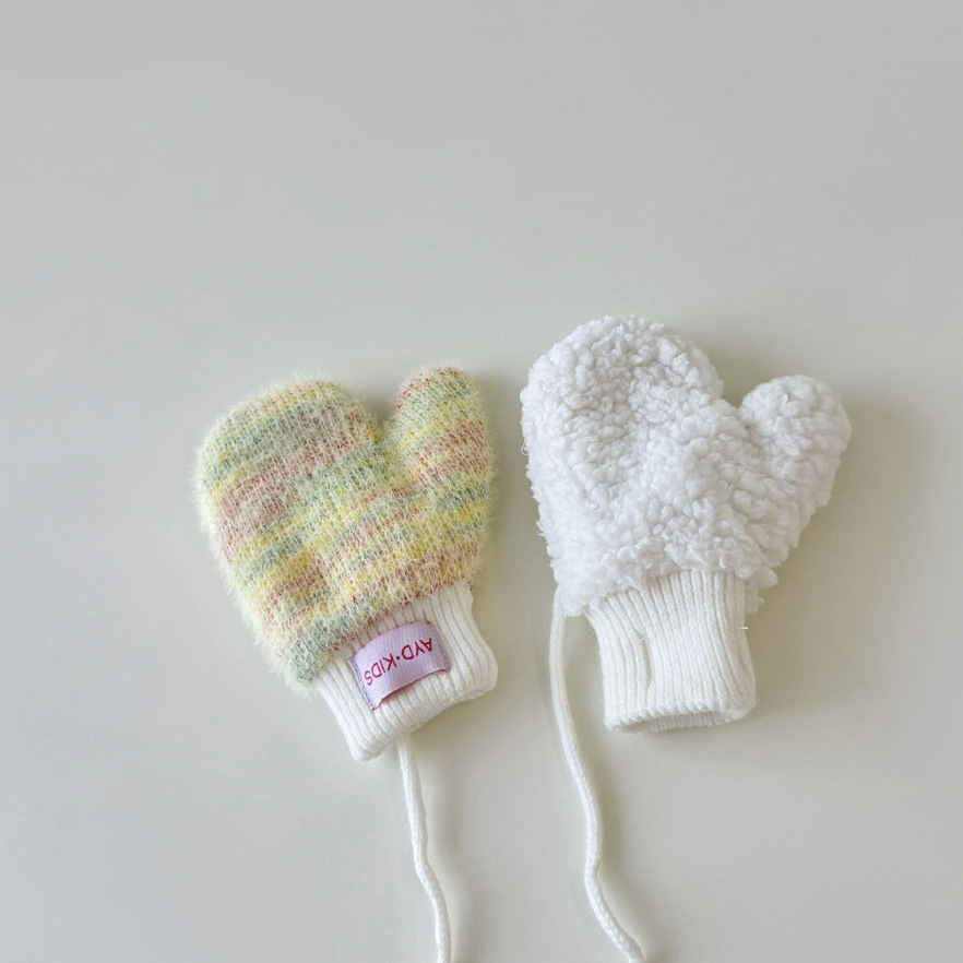 1-4岁宝宝加绒手套冬天儿童挂脖连指保暖男女童小孩加厚手套米色