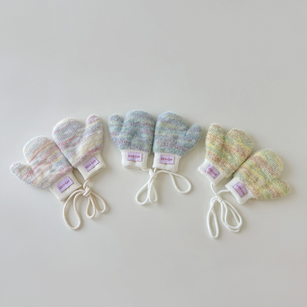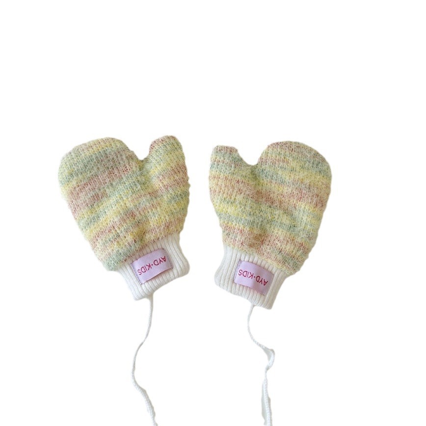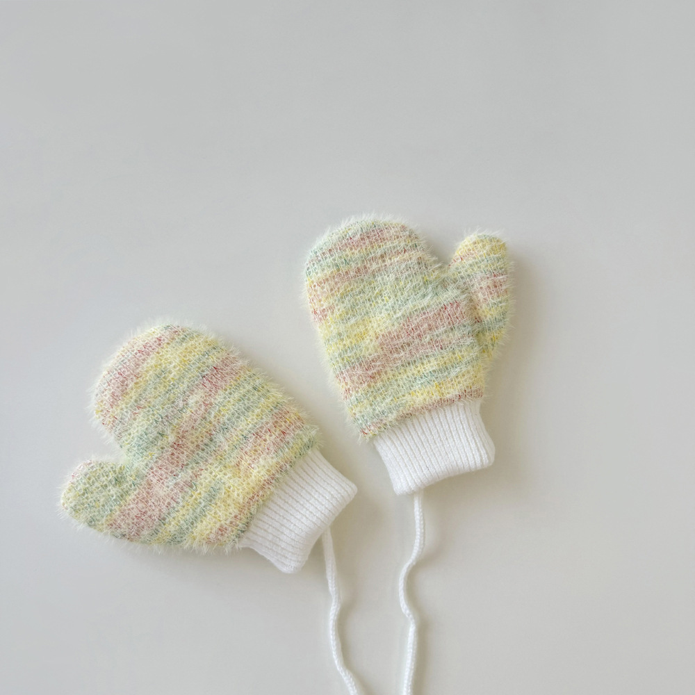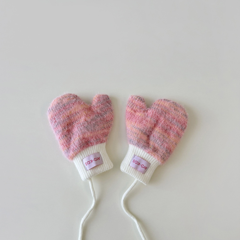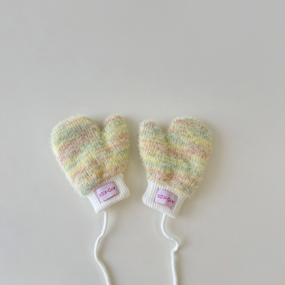 1-4岁宝宝加绒手套冬天儿童挂脖连指保暖男女童小孩加厚手套米色