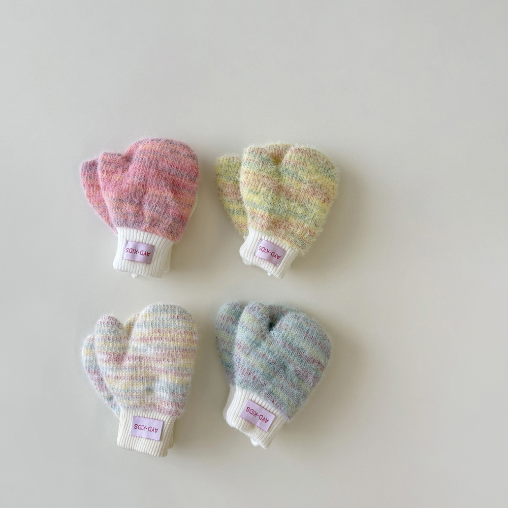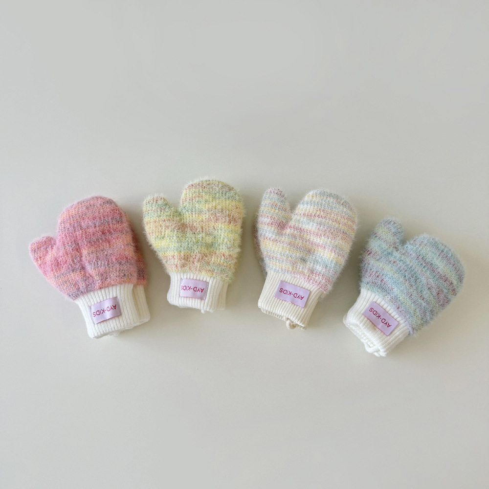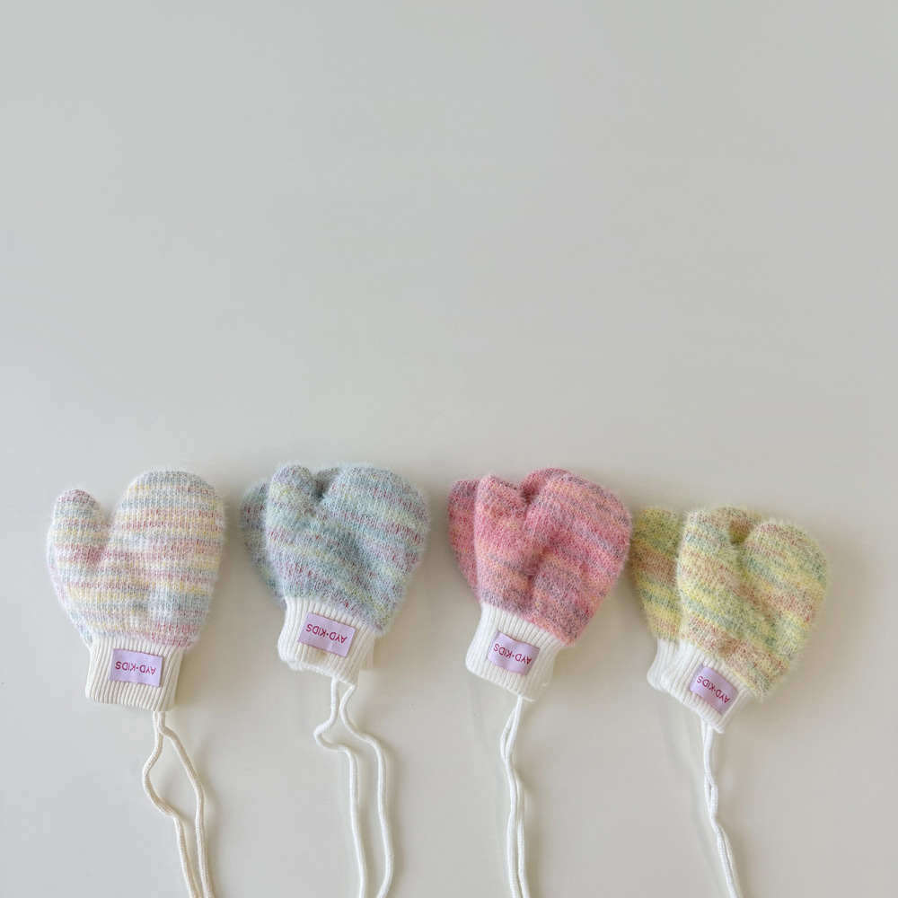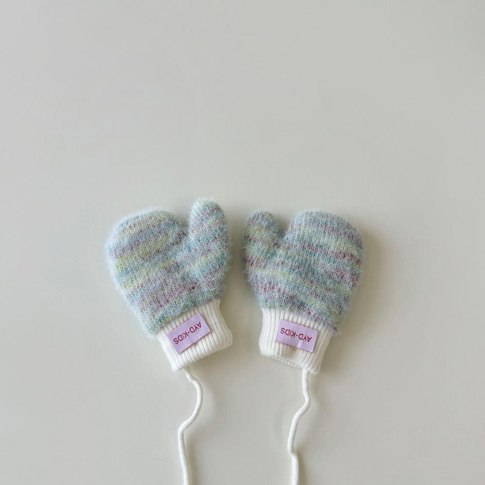 1-4岁宝宝加绒手套冬天儿童挂脖连指保暖男女童小孩加厚手套米色