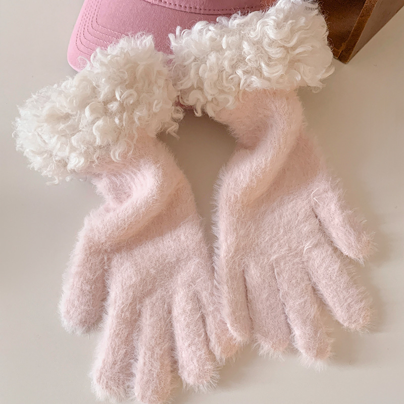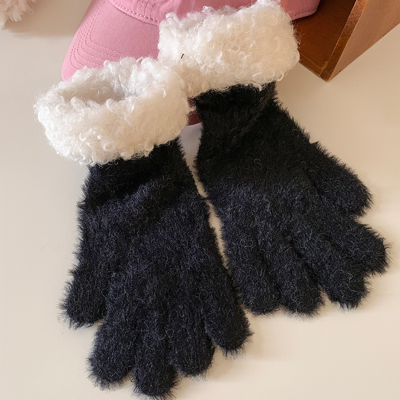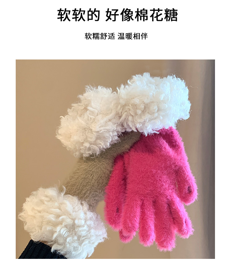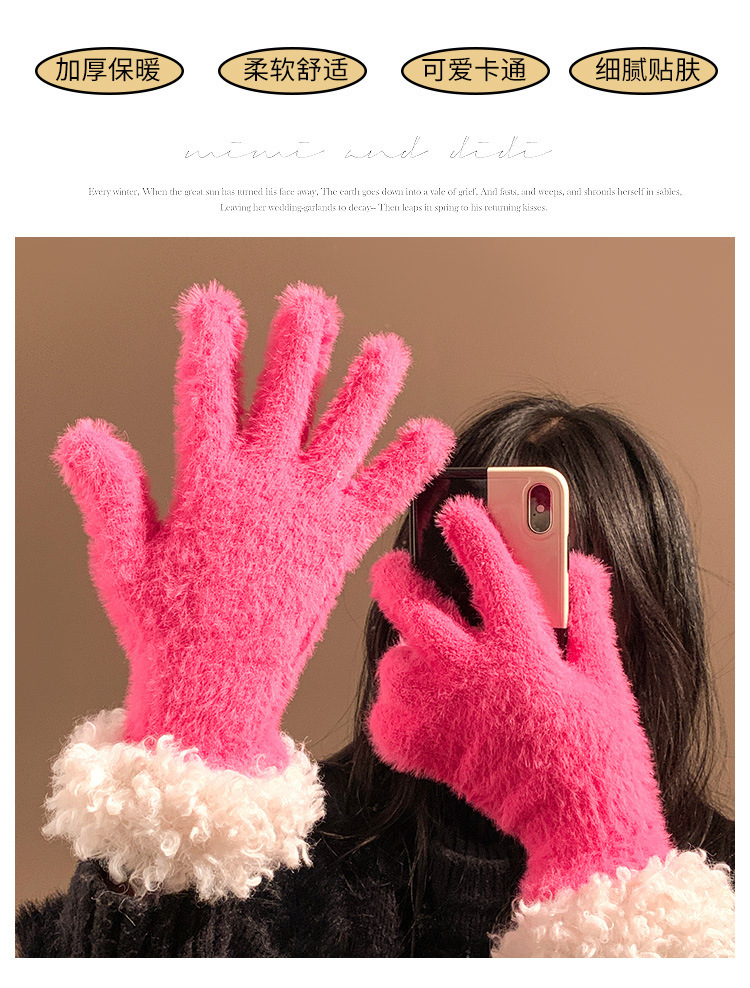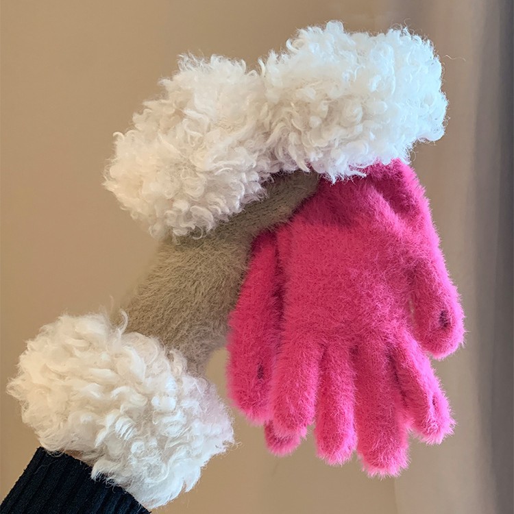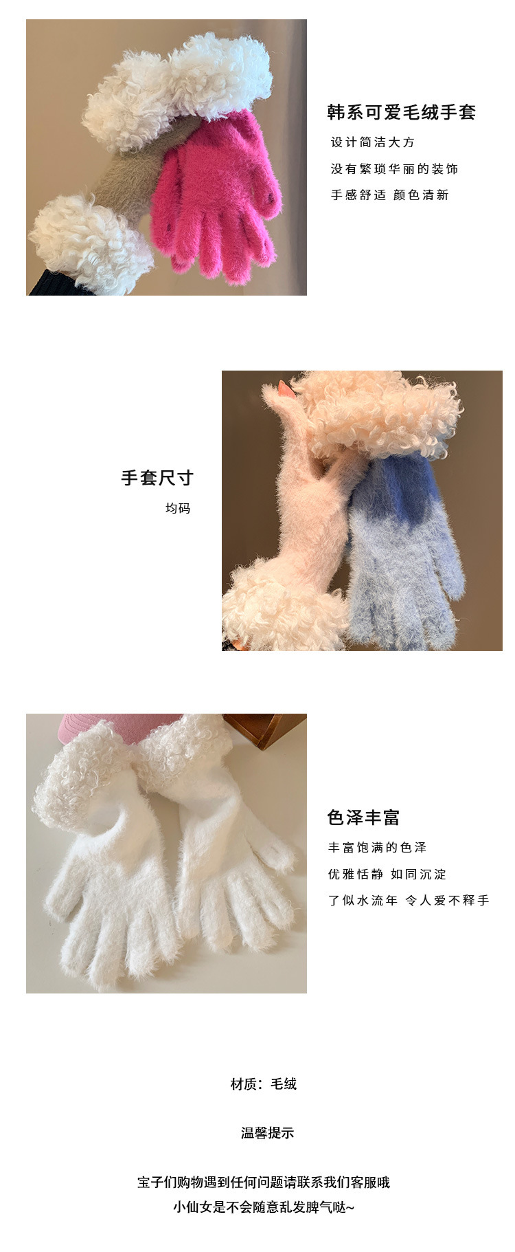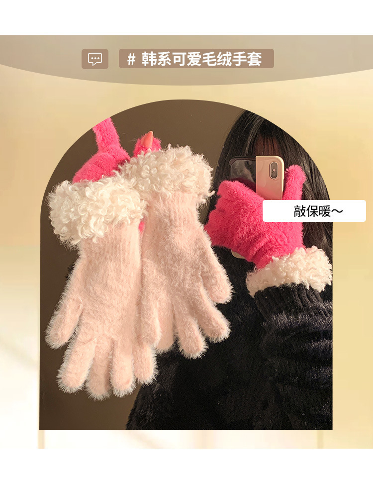 韩系可爱羊羔毛绒分指手套女冬季加绒保暖露指可触屏骑行防风防冻