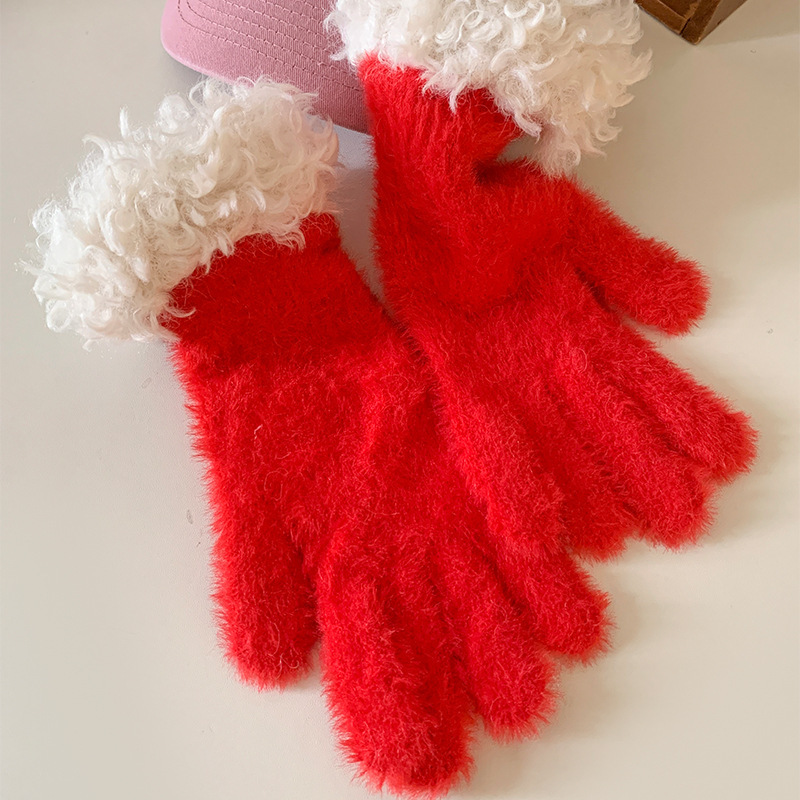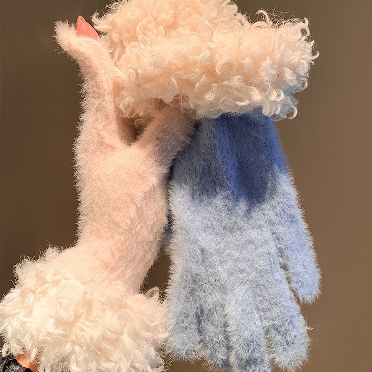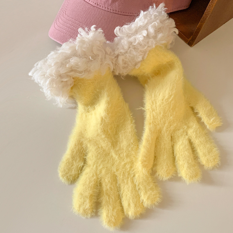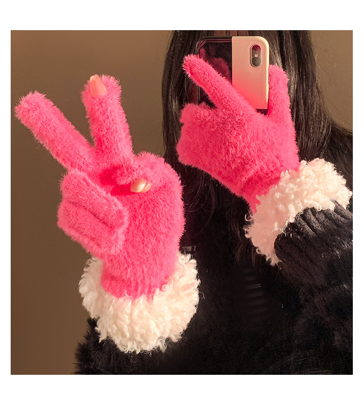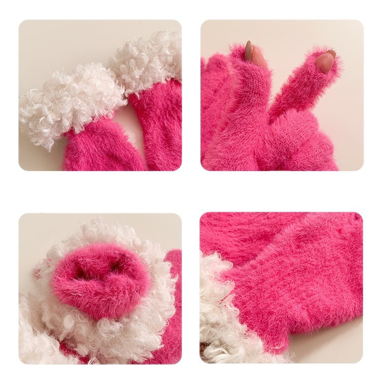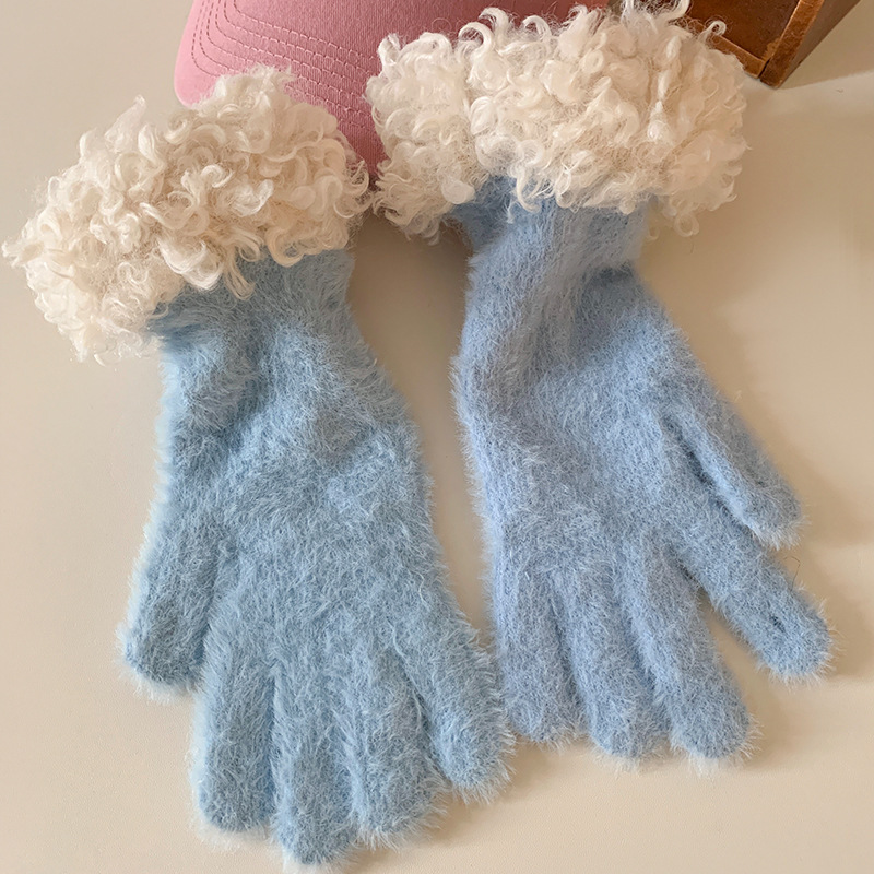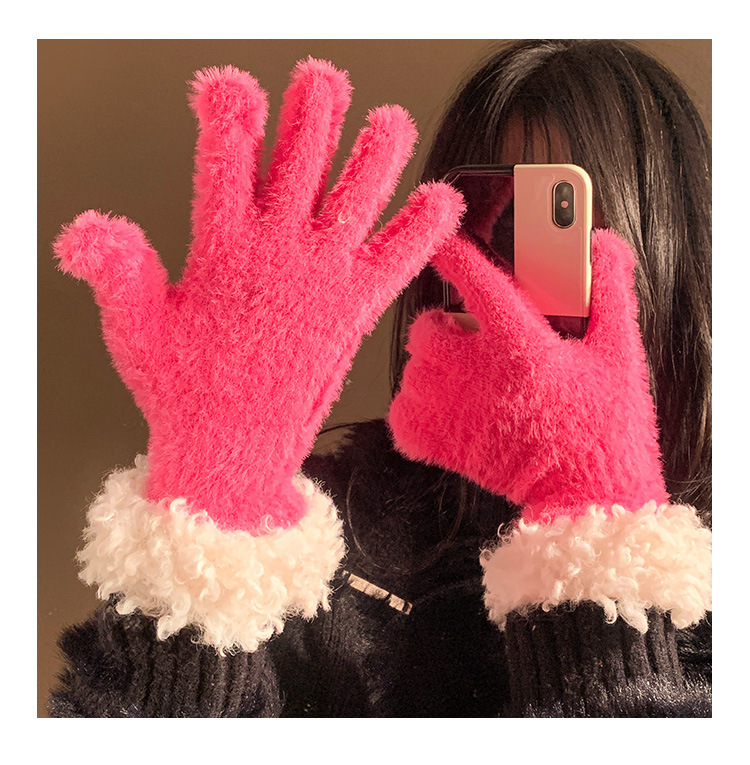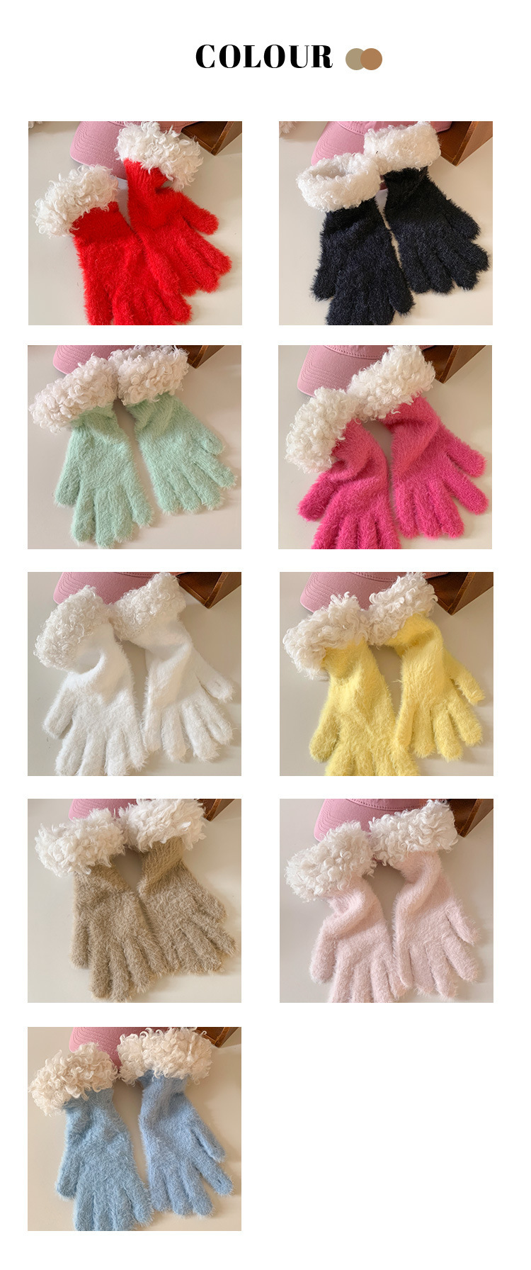 韩系可爱羊羔毛绒分指手套女冬季加绒保暖露指可触屏骑行防风防冻
