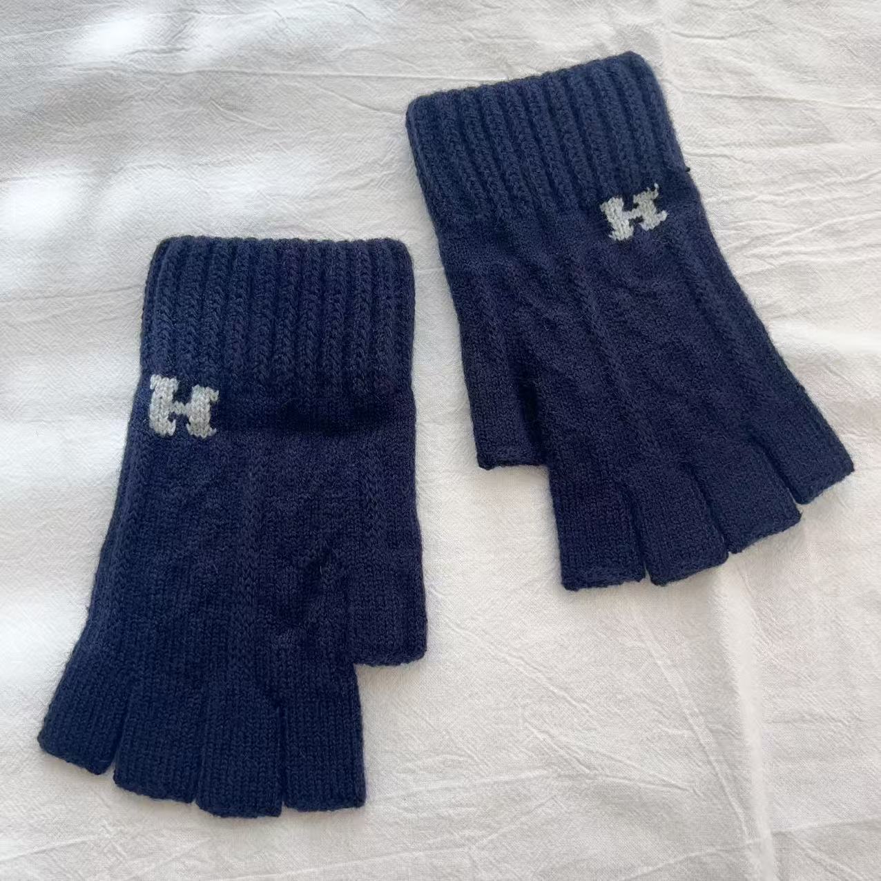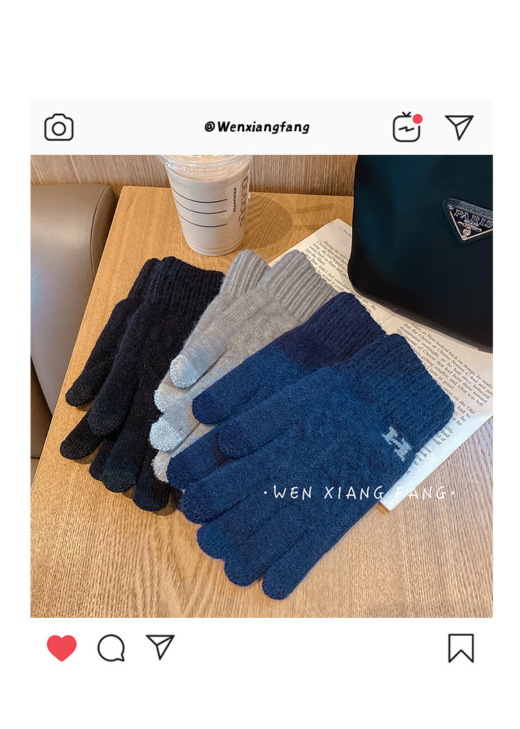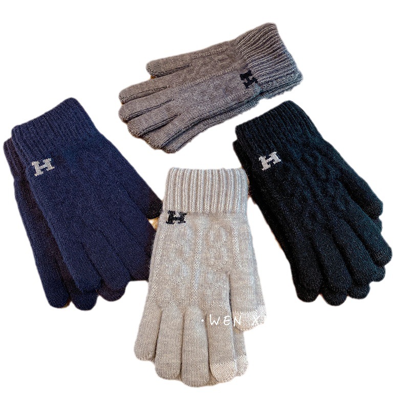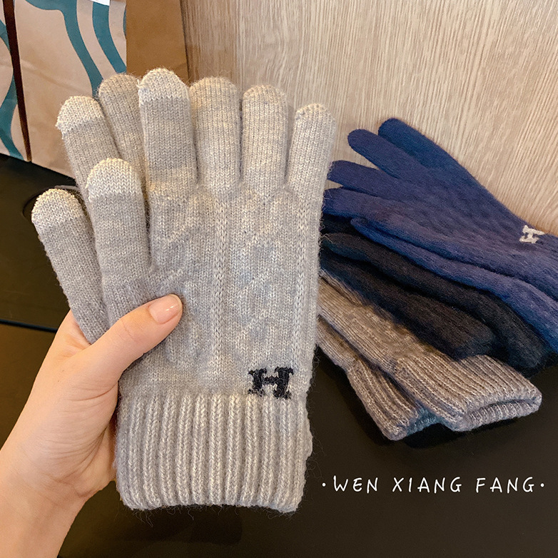 韩版针织触屏手套冬季男字母五指情侣骑车加绒学生加厚保暖复古女