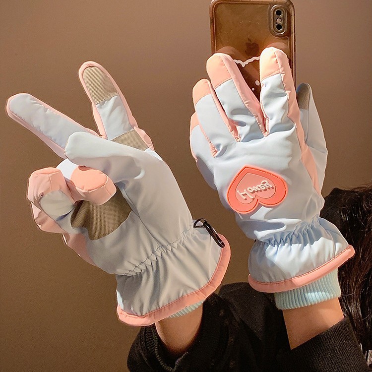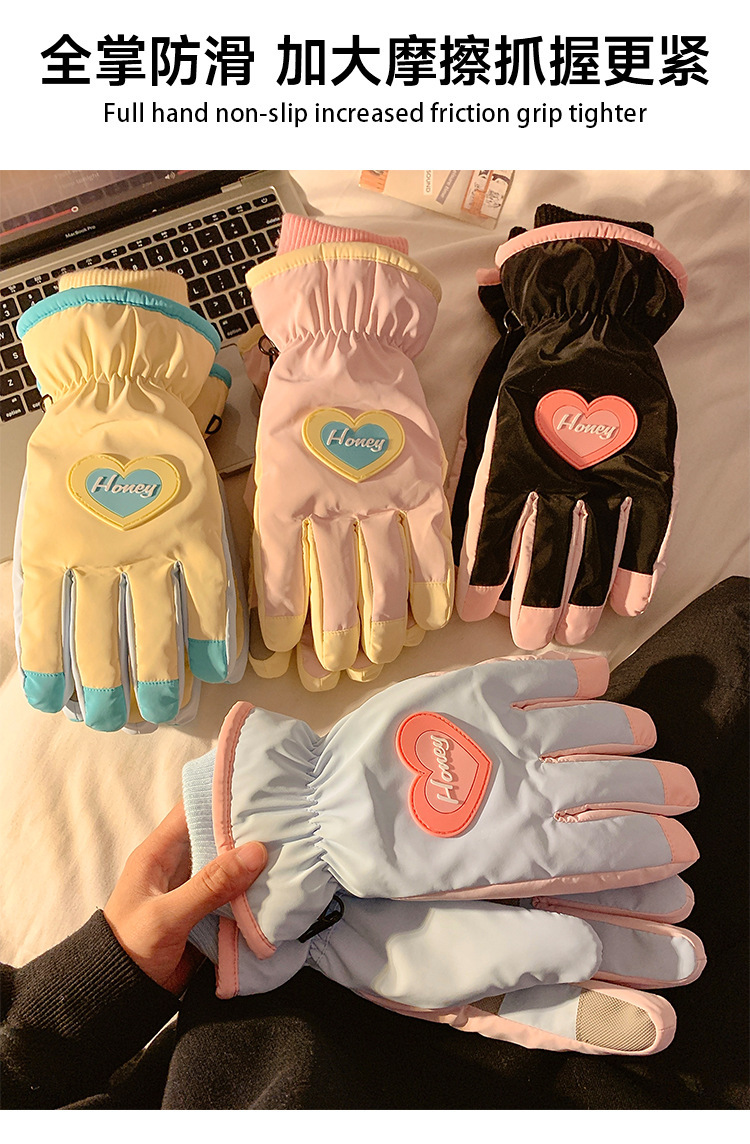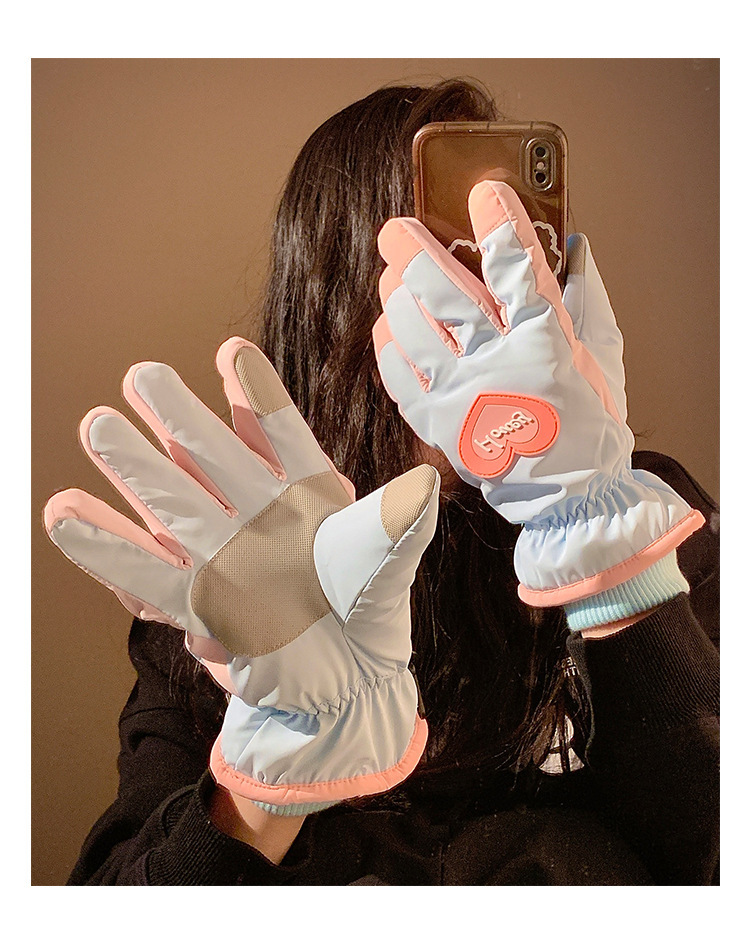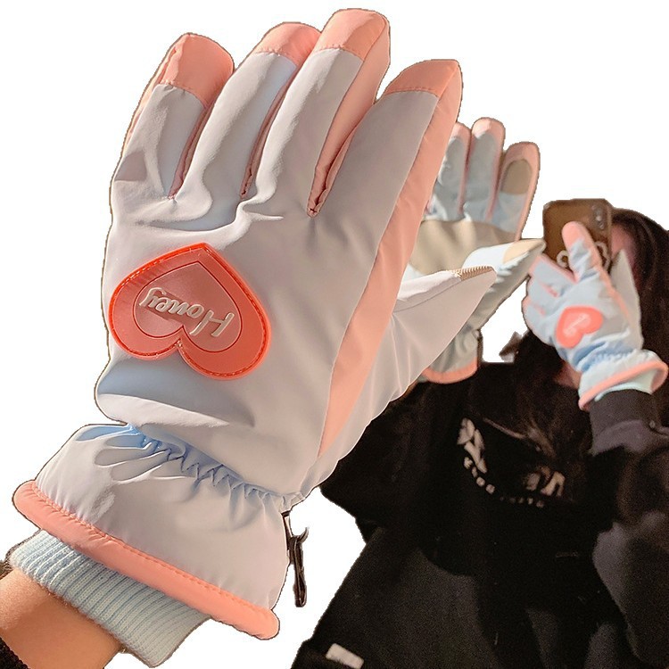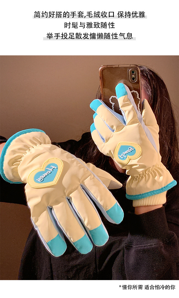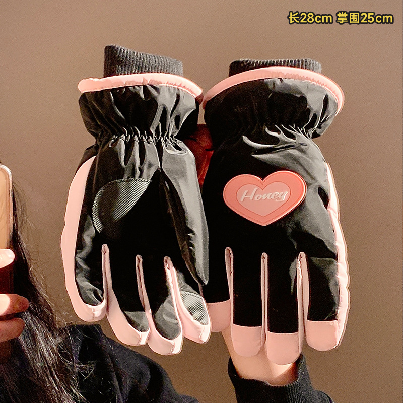 可爱爱心骑行全指触屏手套女士冬季保暖加绒滑雪防水防寒骑电动车