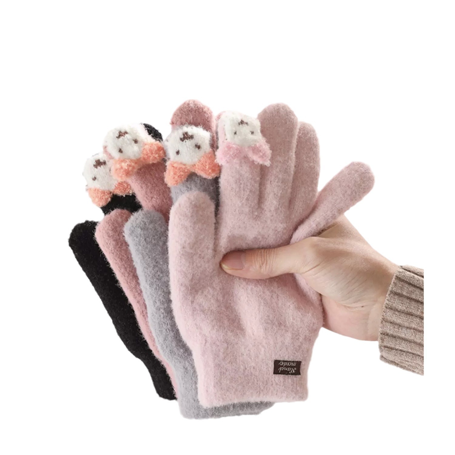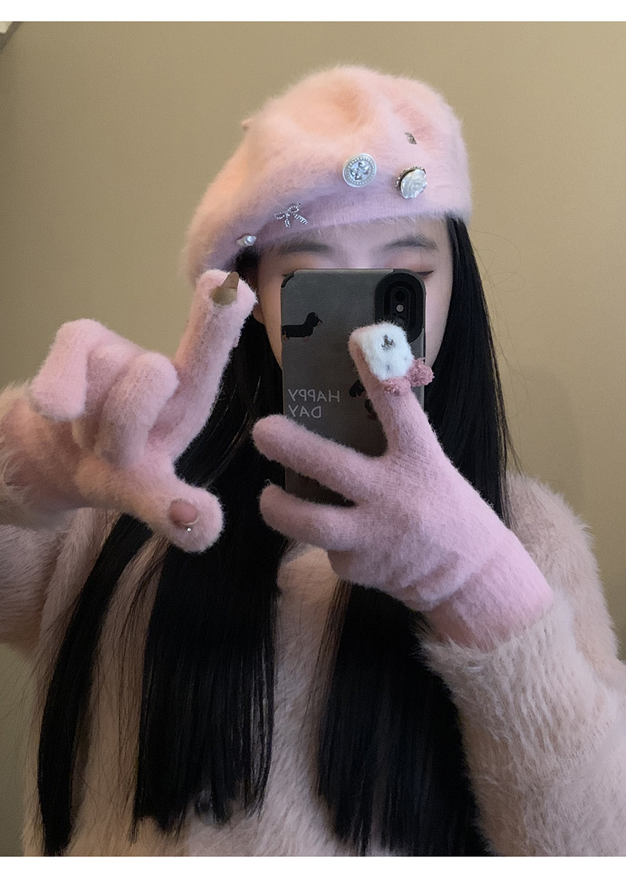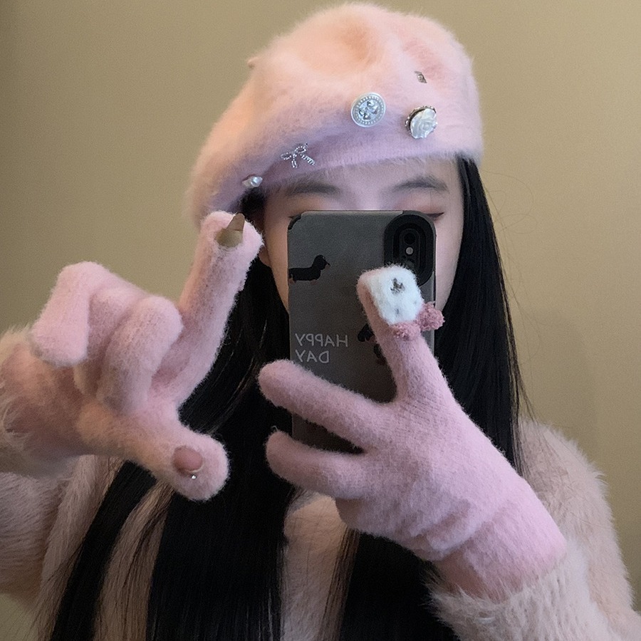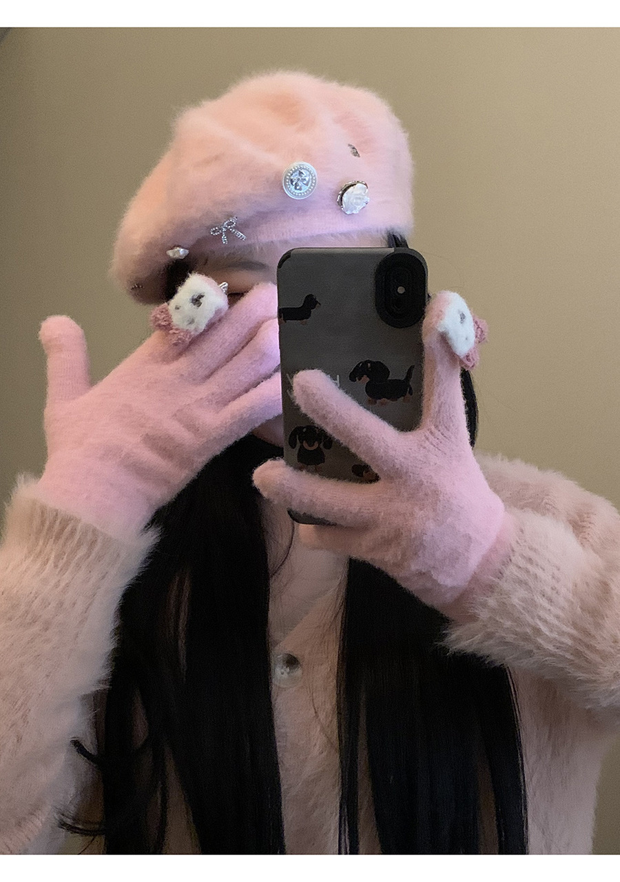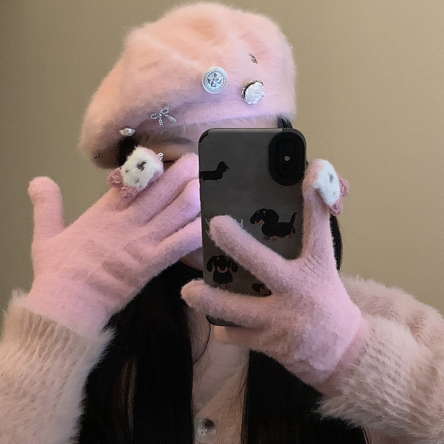 保暖手套女冬季可爱小兔纯色毛线针织分指防寒骑行户外可触屏学生