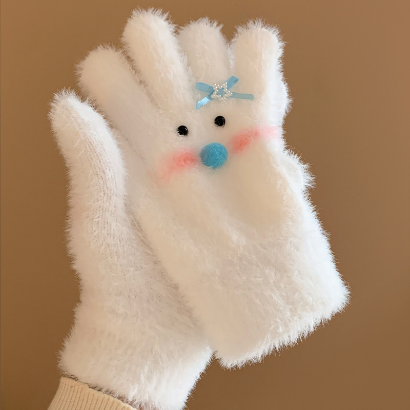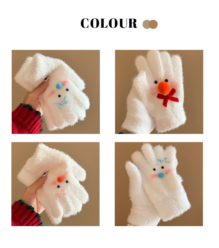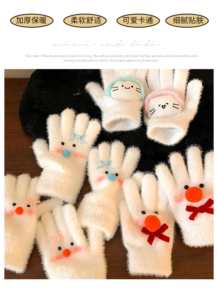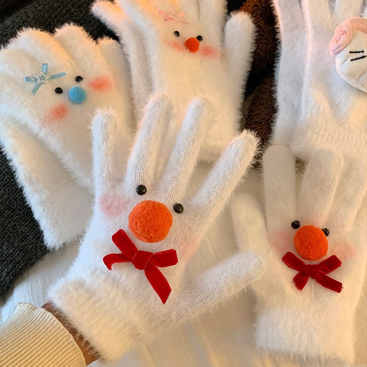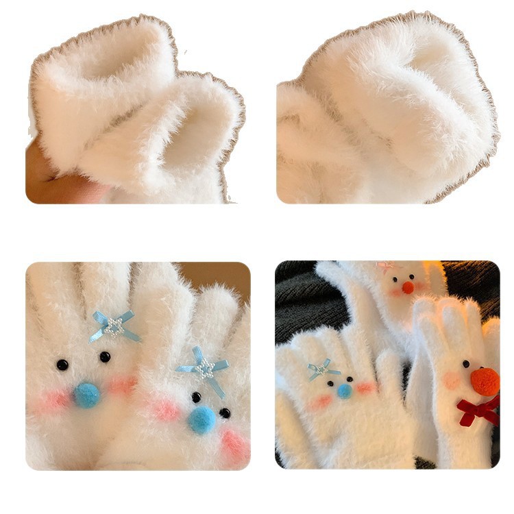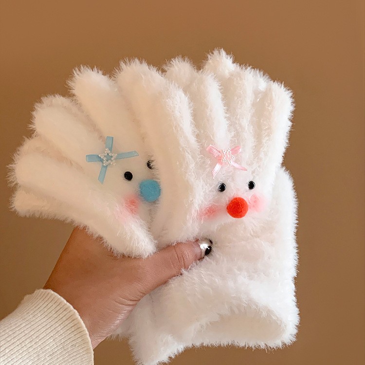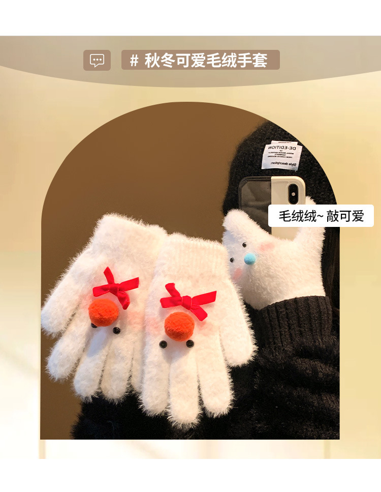 【白色雪人】蝴蝶结毛绒针织手套女冬季加绒保暖防寒防风学生骑行