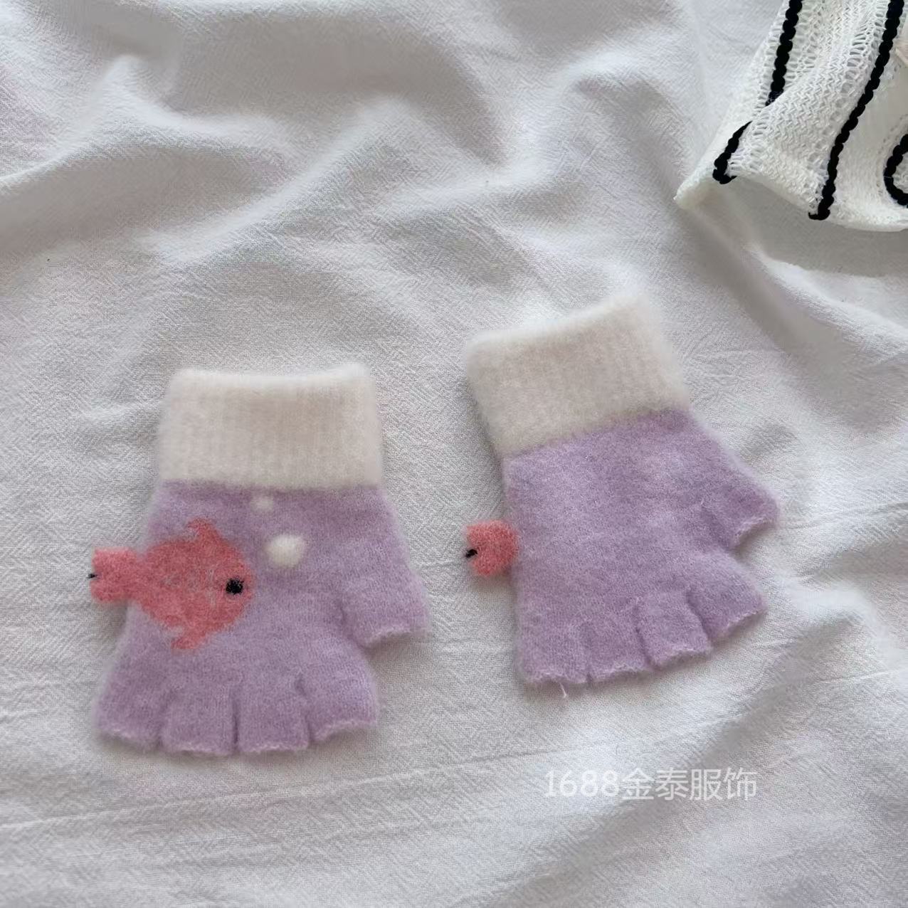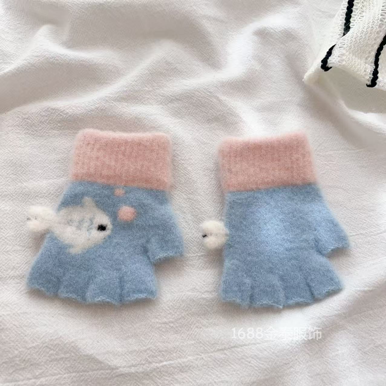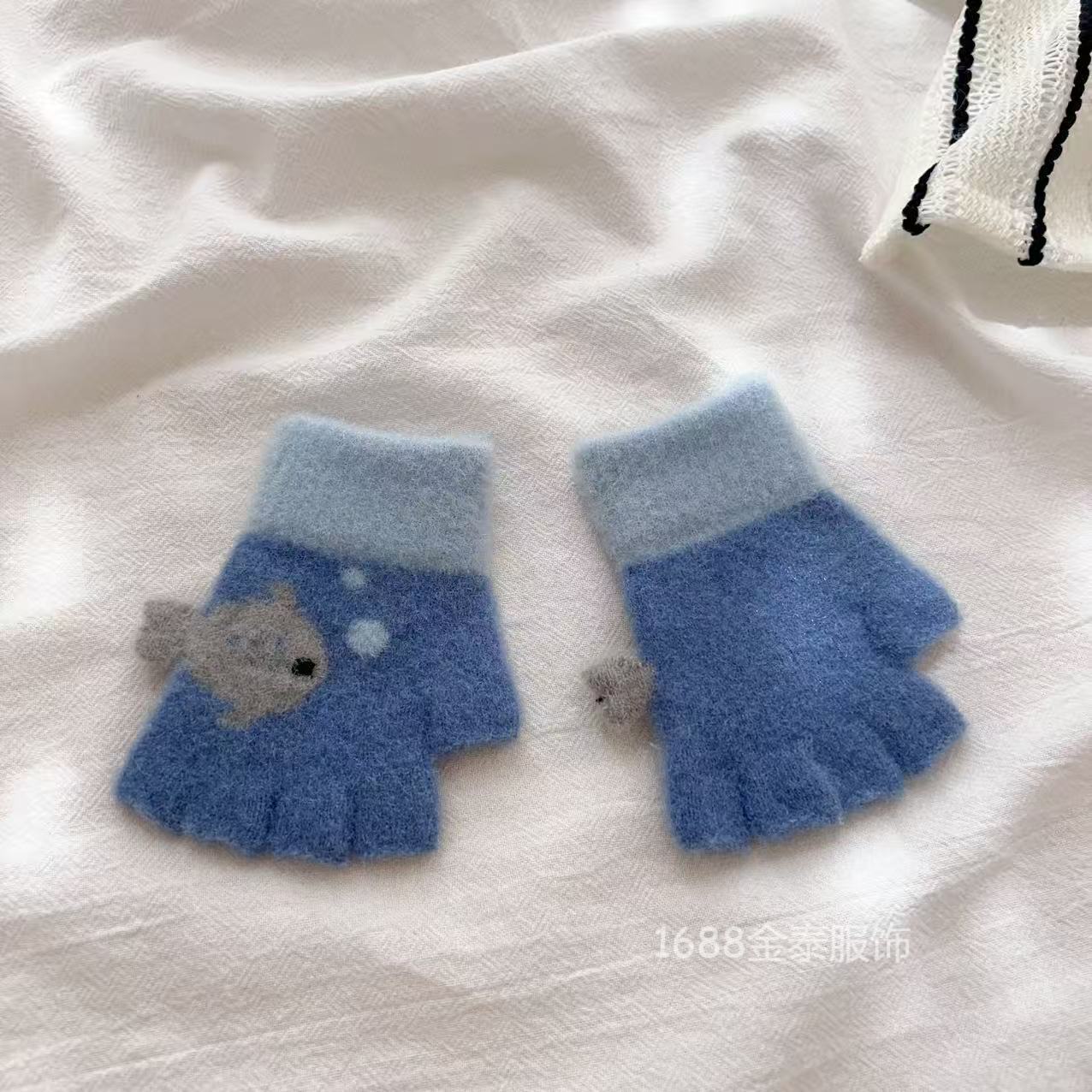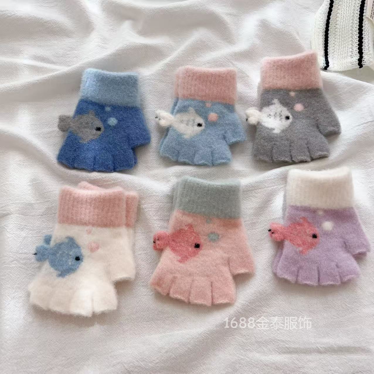 2.-6岁可爱小鱼手套冬季保暖宝宝半指卡通男童分指针织拼色手套批