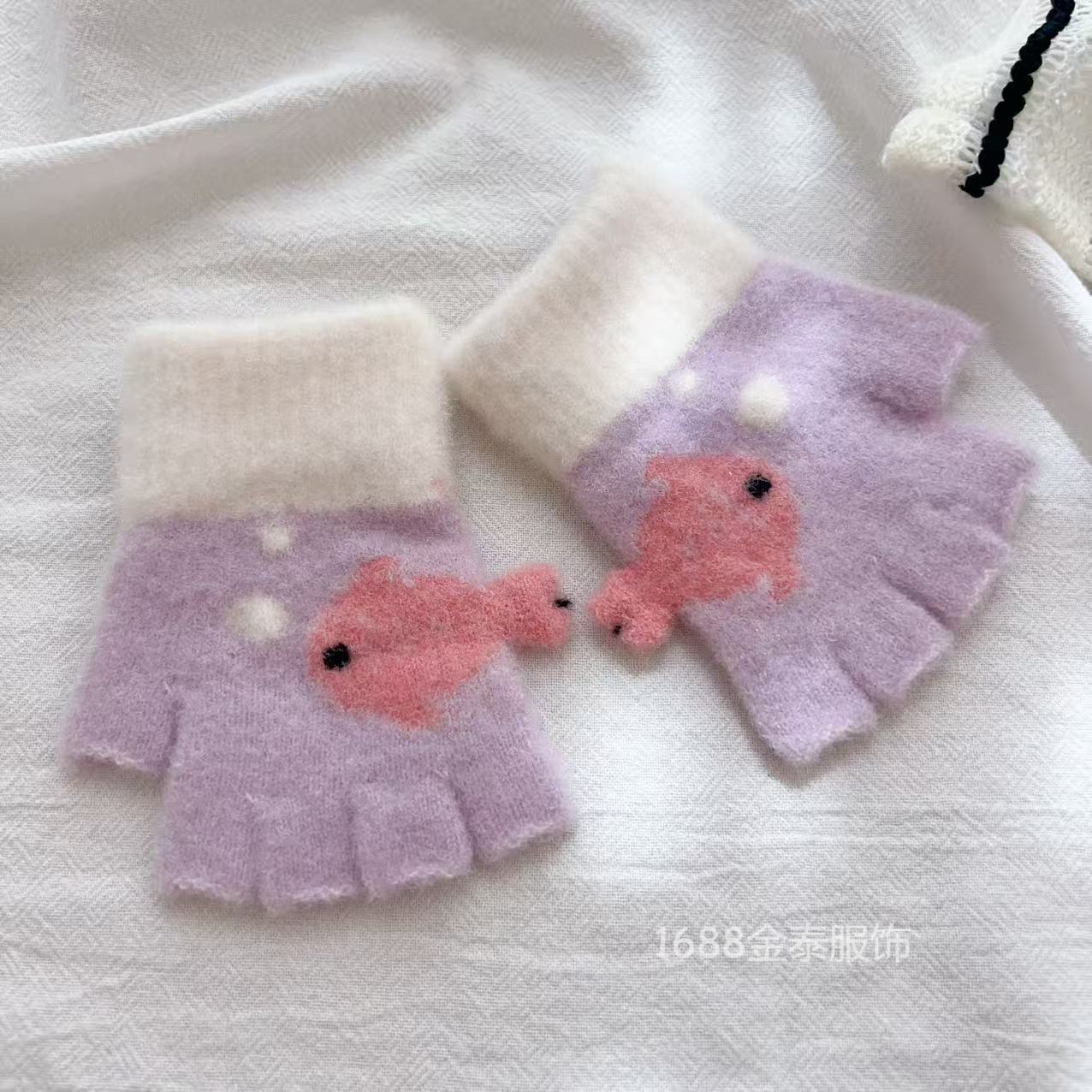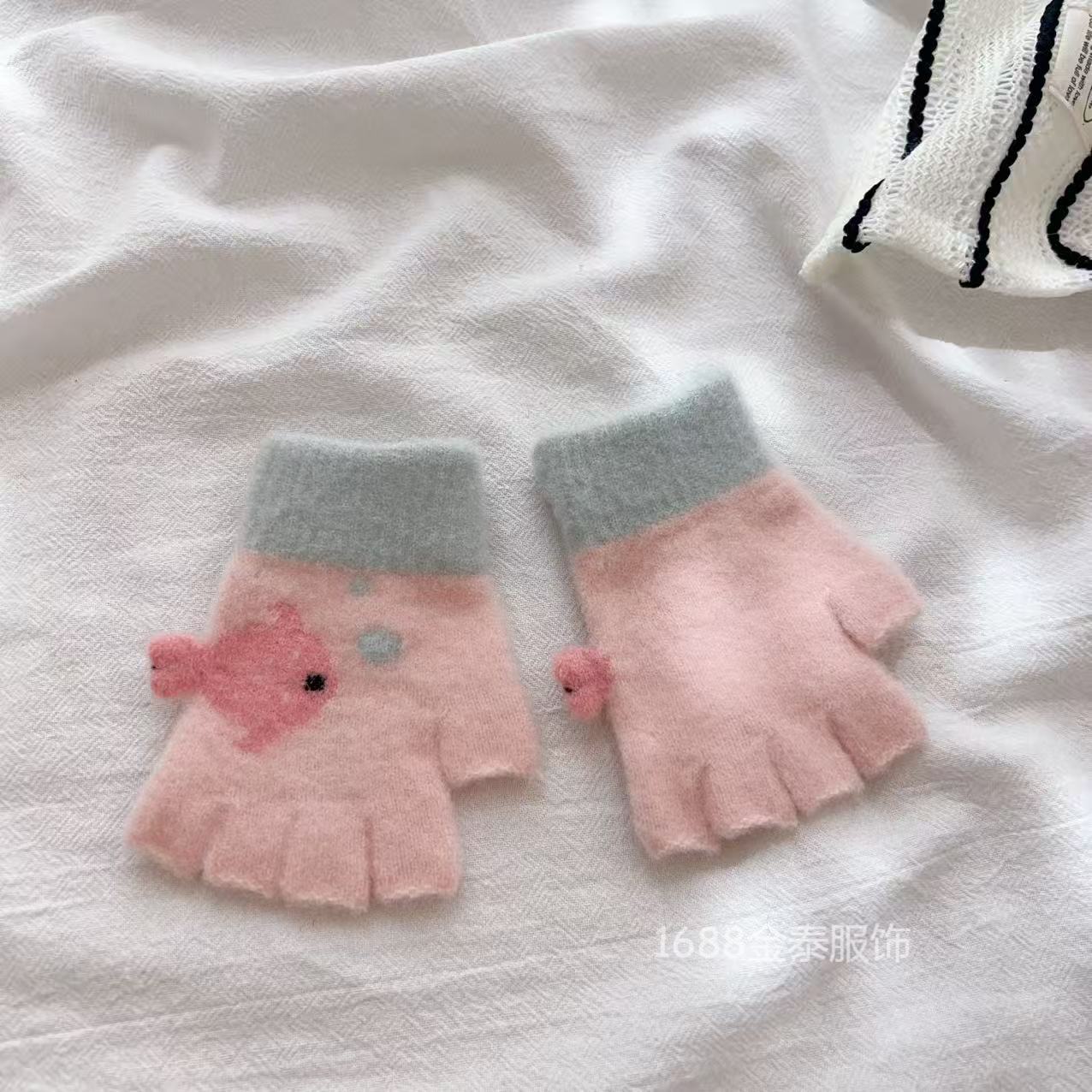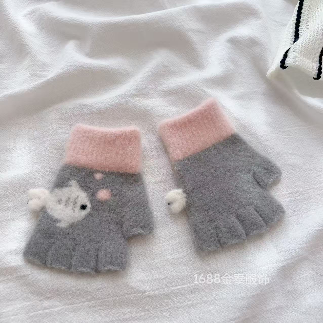 2.-6岁可爱小鱼手套冬季保暖宝宝半指卡通男童分指针织拼色手套批