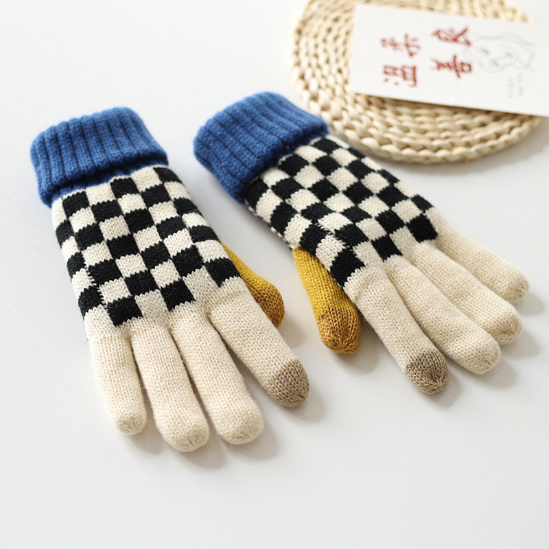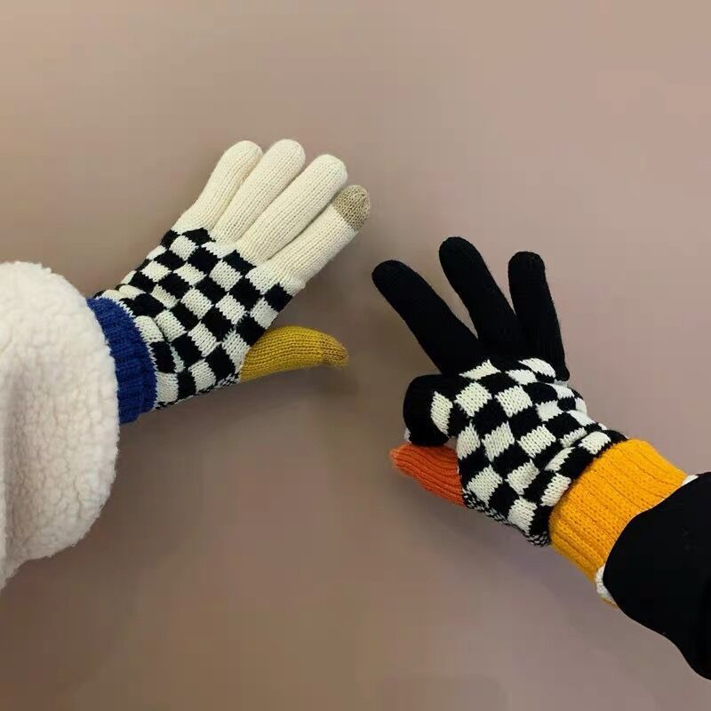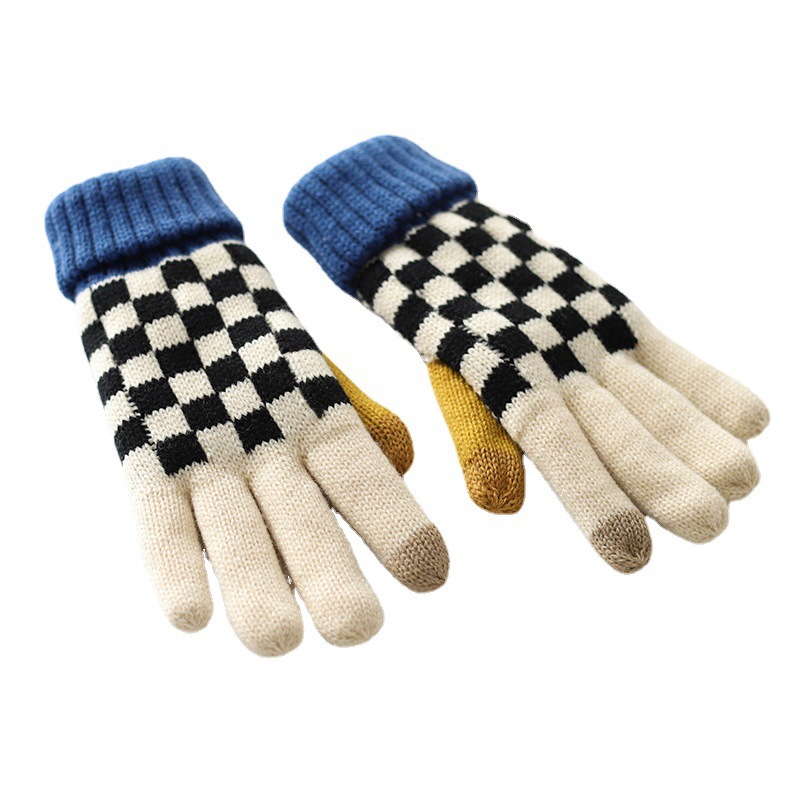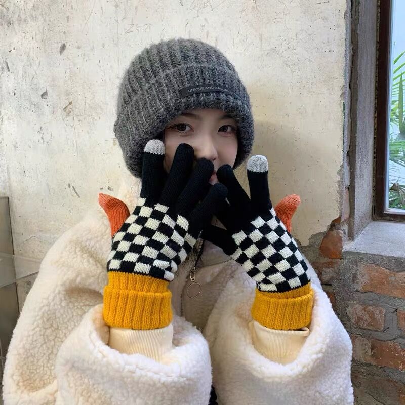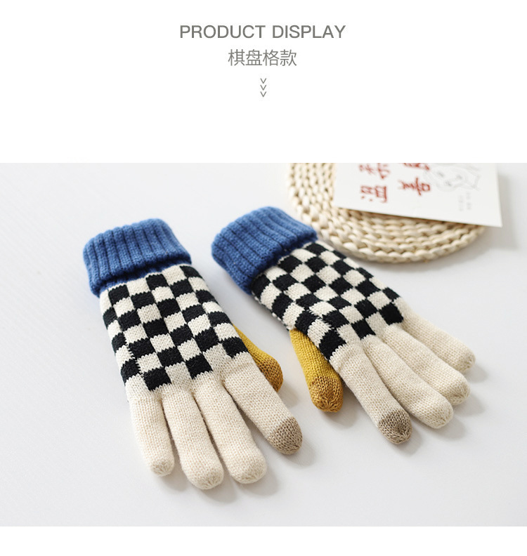 秋冬季男女学生可爱毛线手套棋盘格冬天加绒加厚骑车防寒保暖触屏