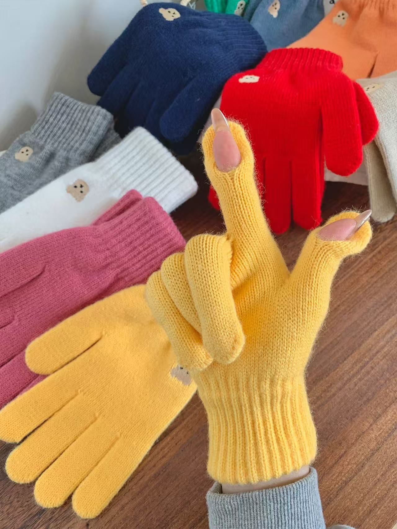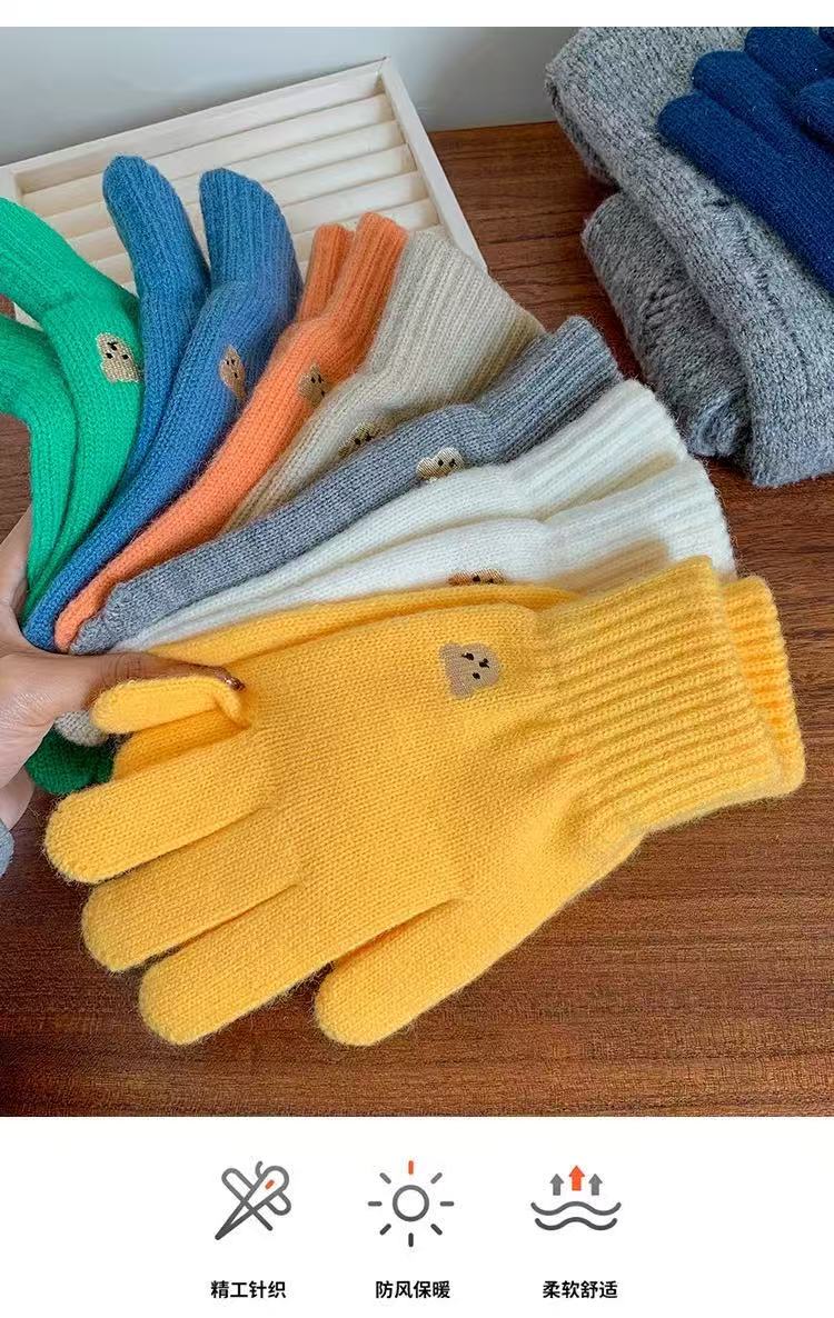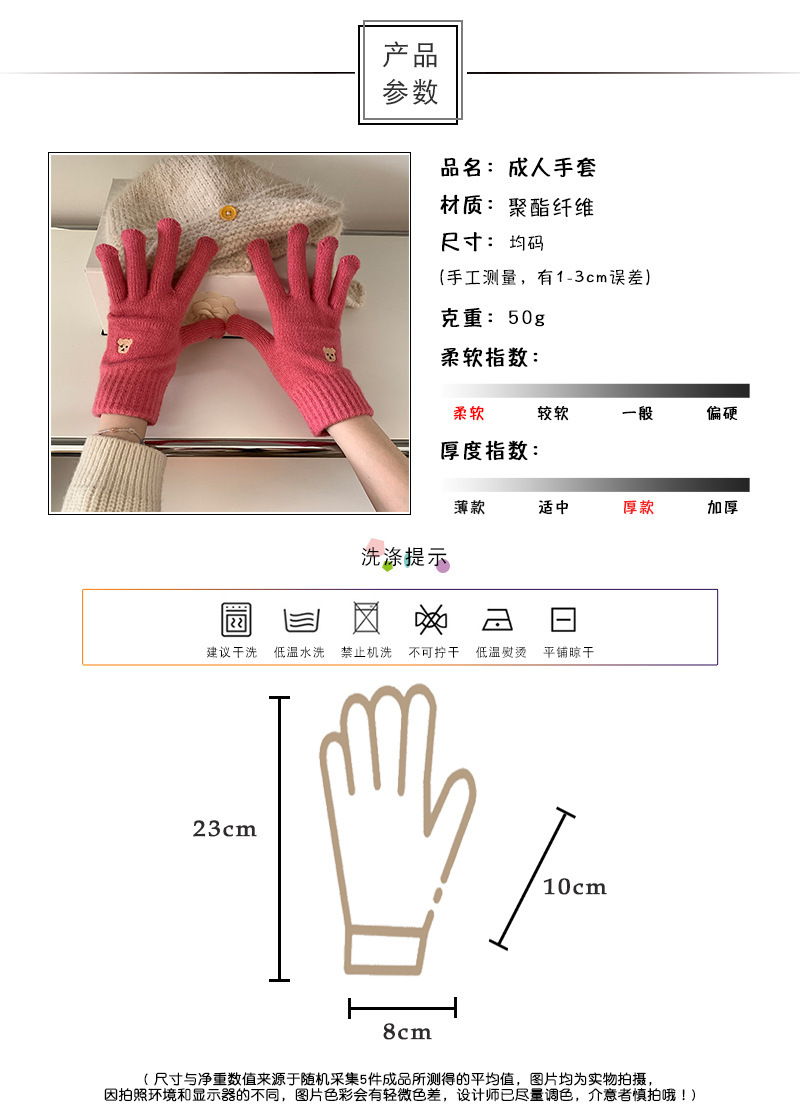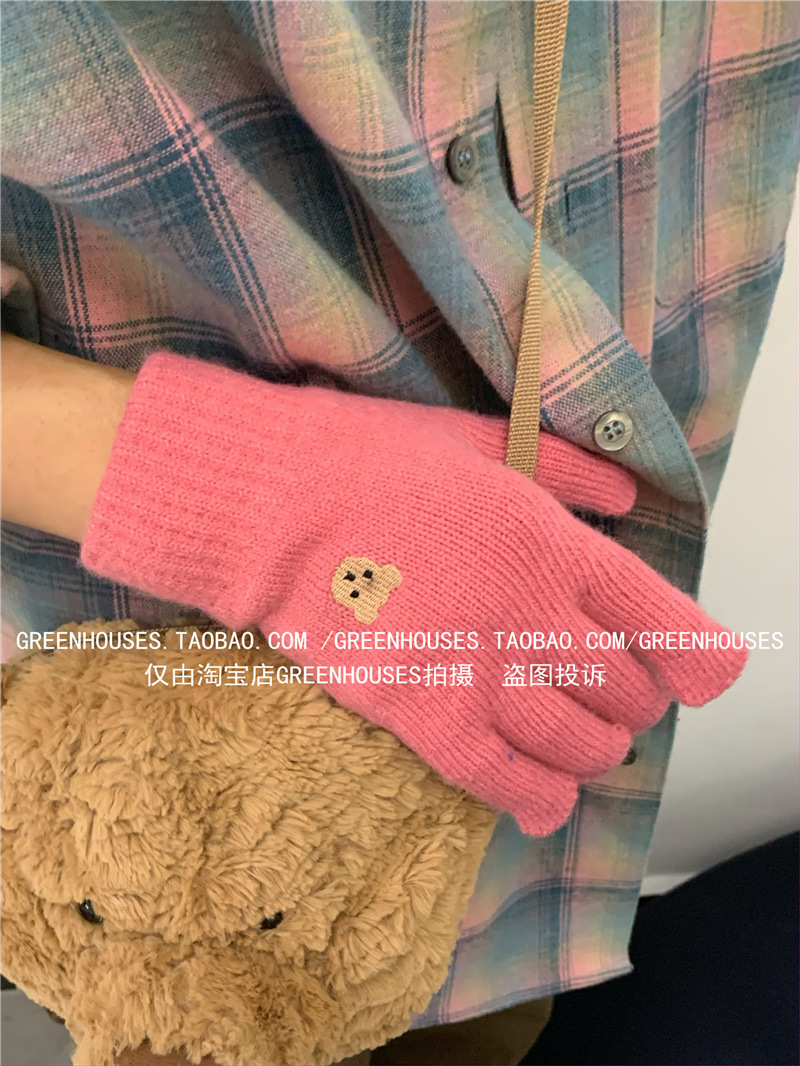 毛线手套女秋冬季韩国可爱小熊刺绣针织触屏学生保暖骑车手套防风