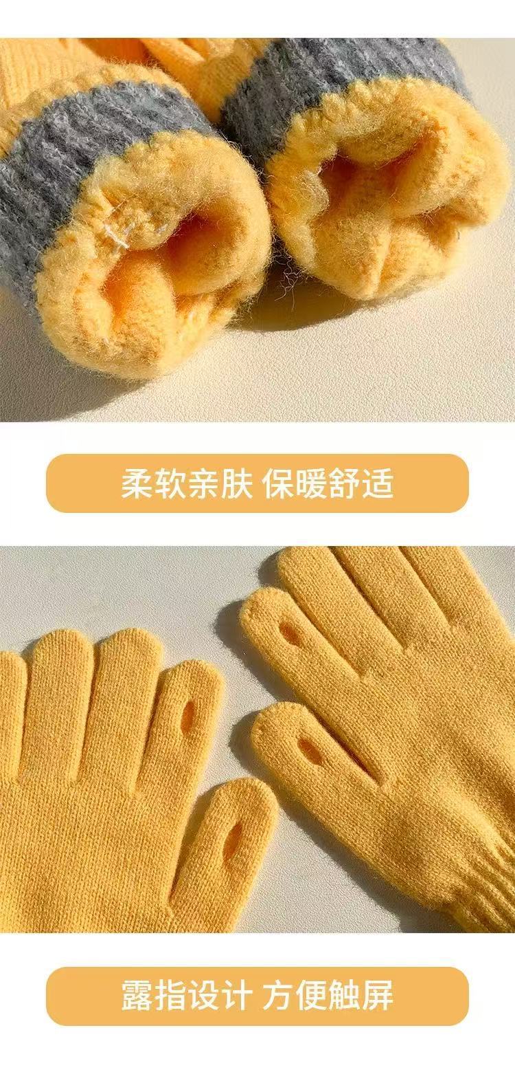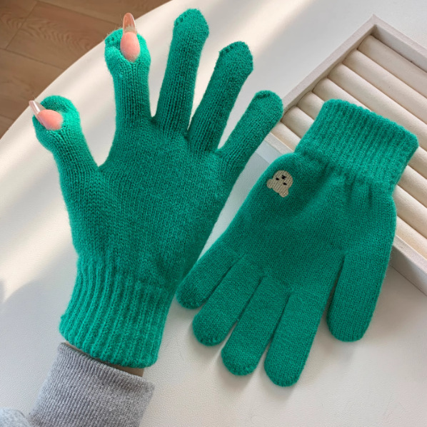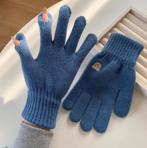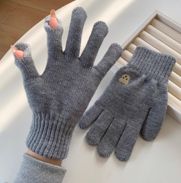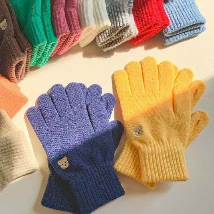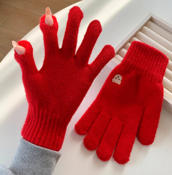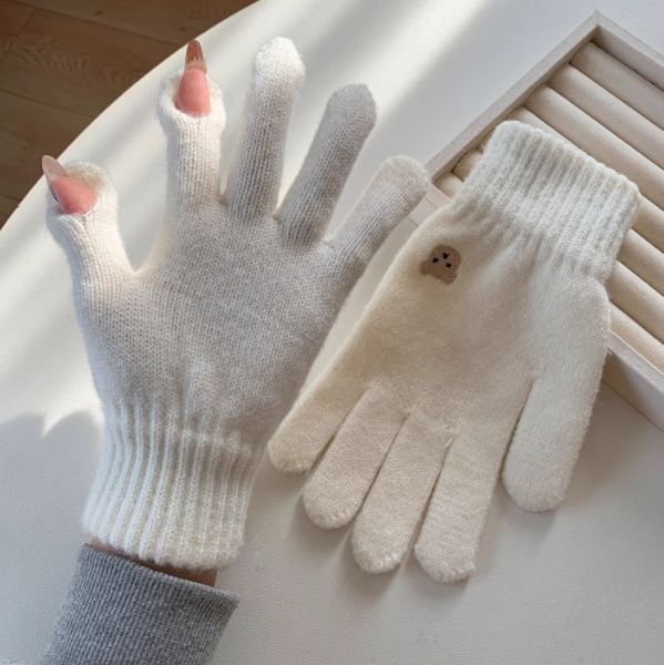 毛线手套女秋冬季韩国可爱小熊刺绣针织触屏学生保暖骑车手套防风